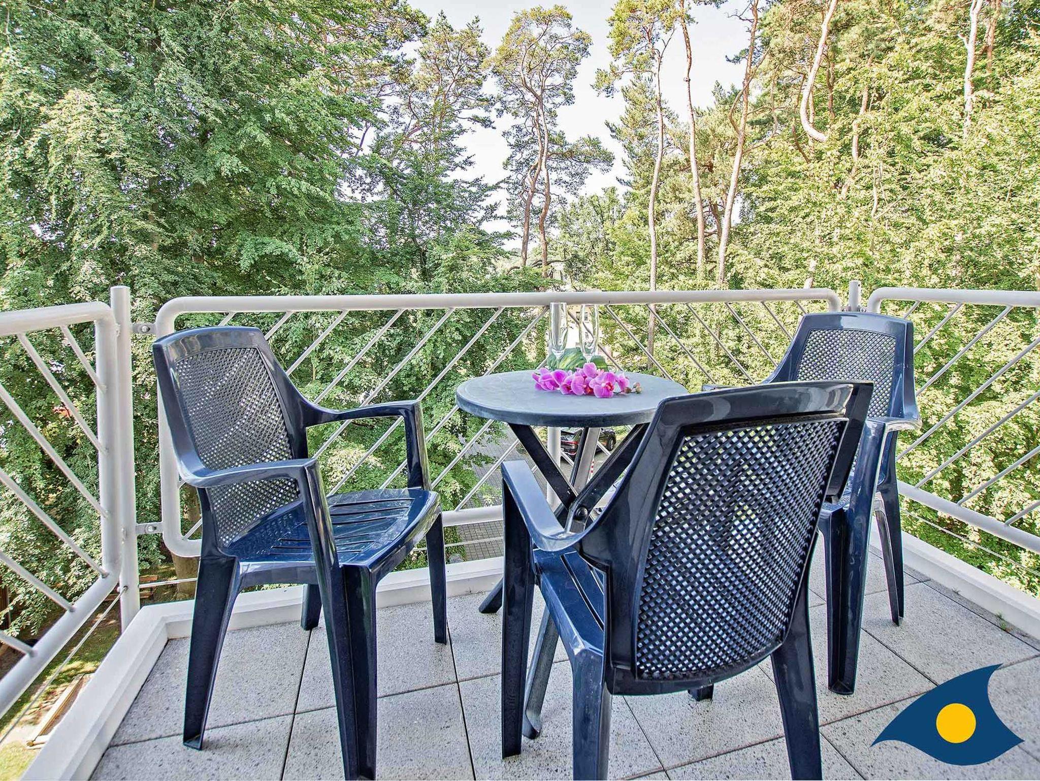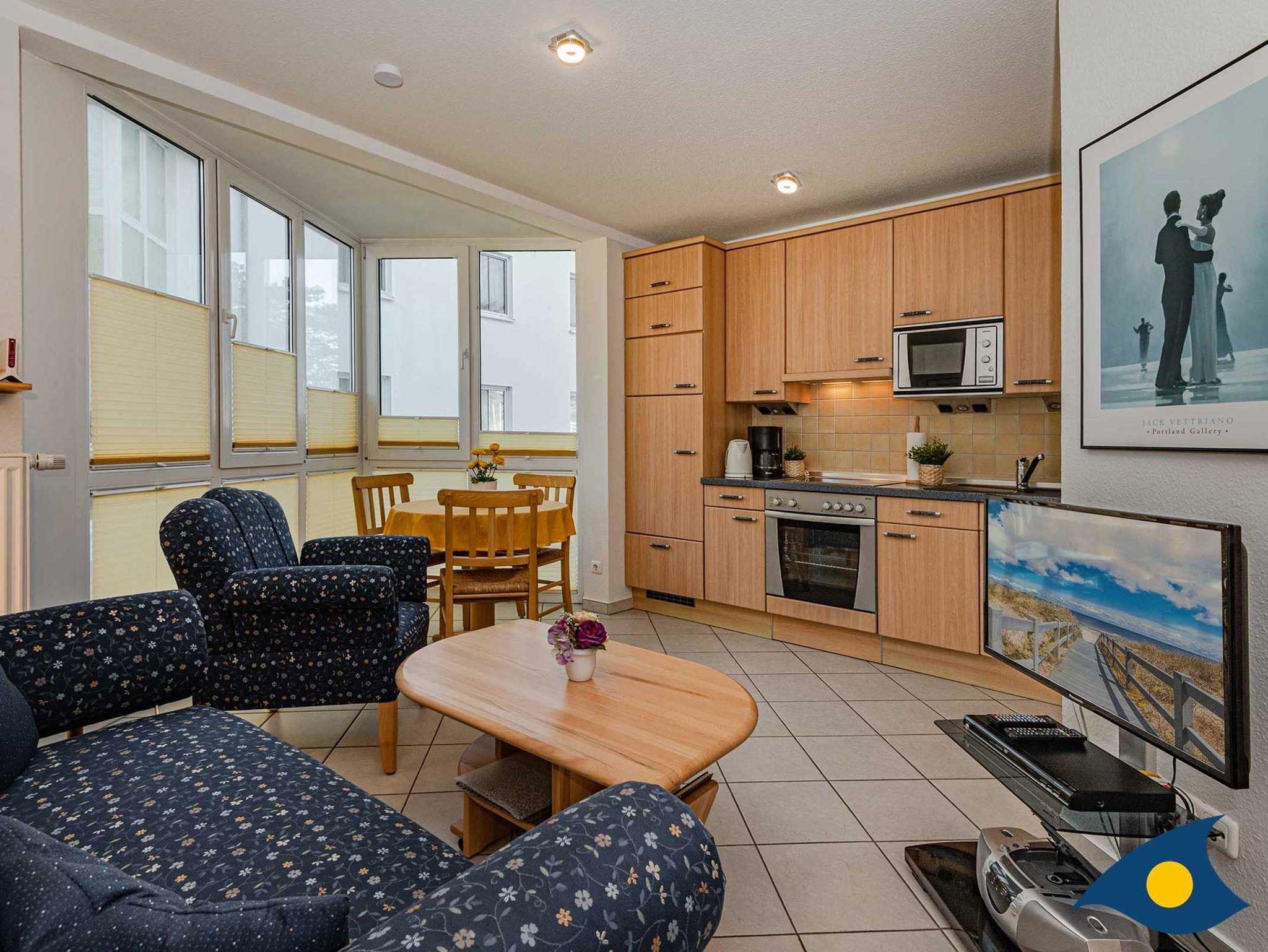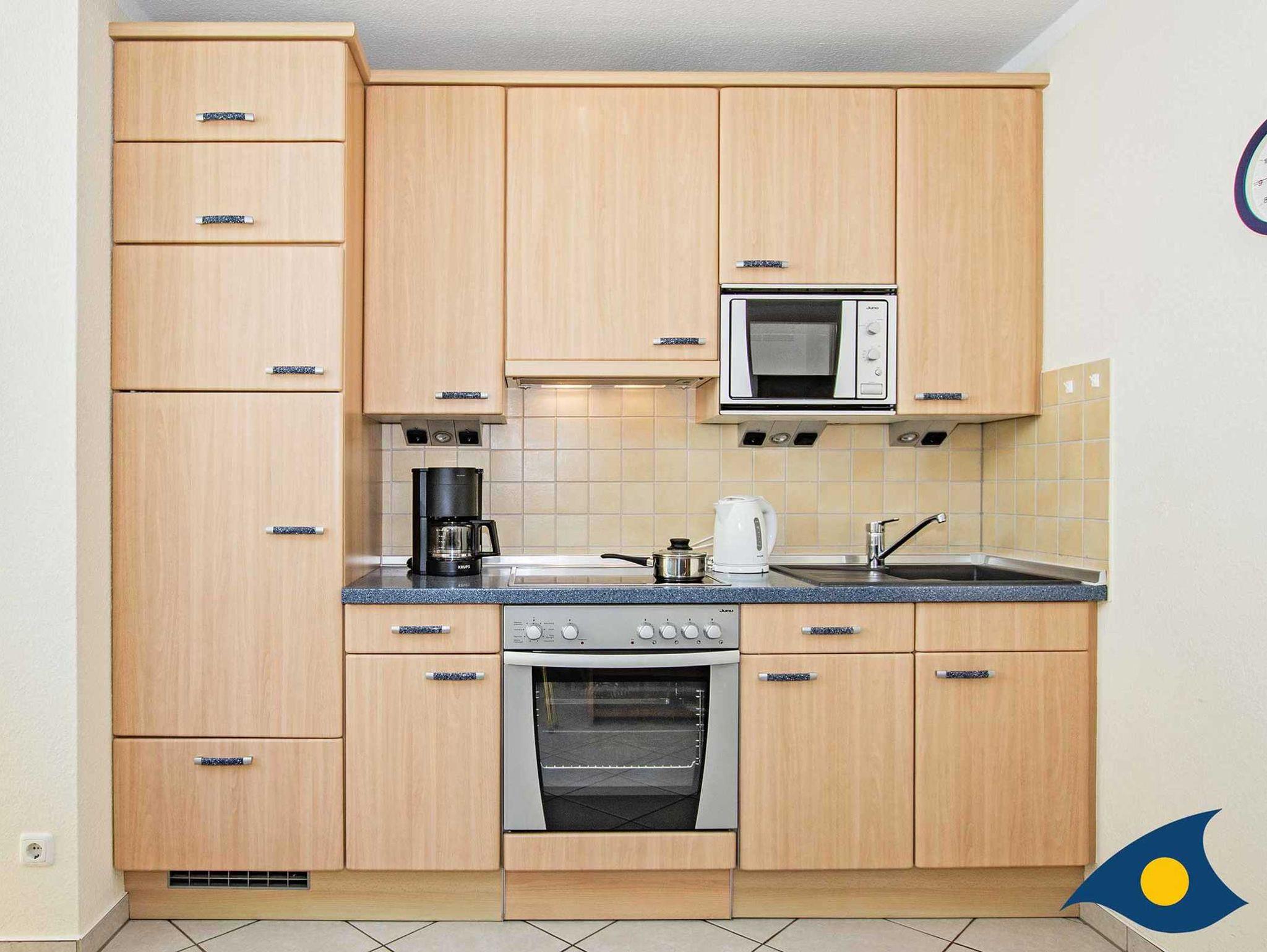 Der Fußboden der Wohnung ist gefliest, die Einrichtung ist in Buche gehalten. Der Glaserker im Wohnzimmer bietet traumhaften Meerblick und ist der ideale Platz, um die Seele baumeln zu lassen.