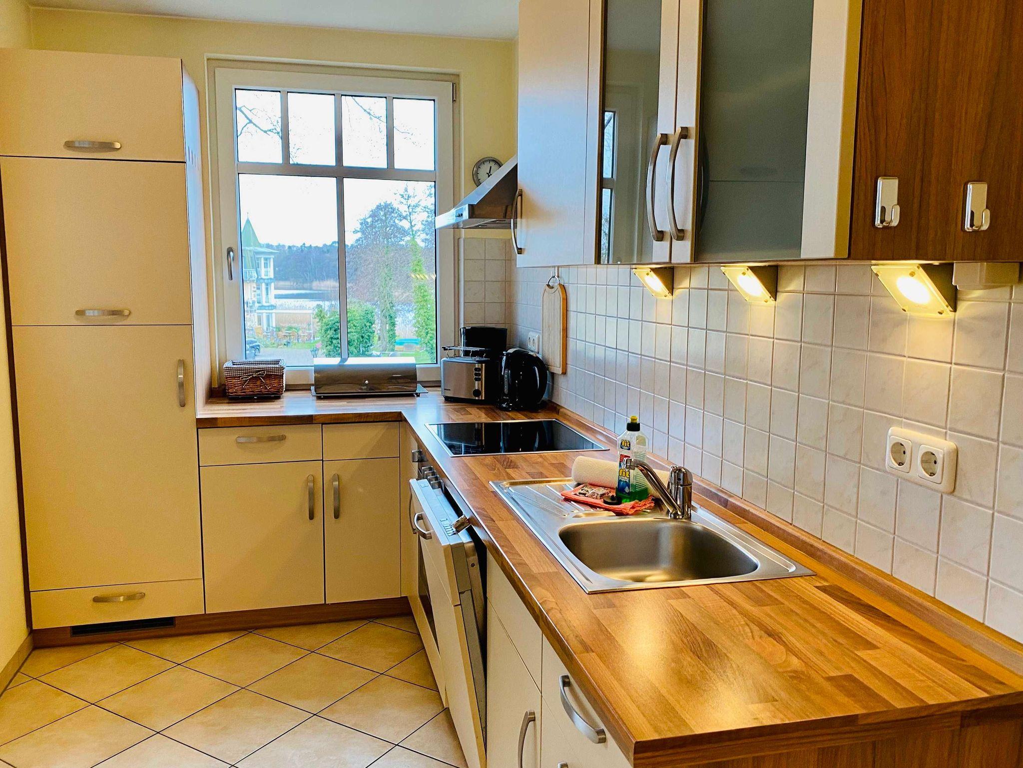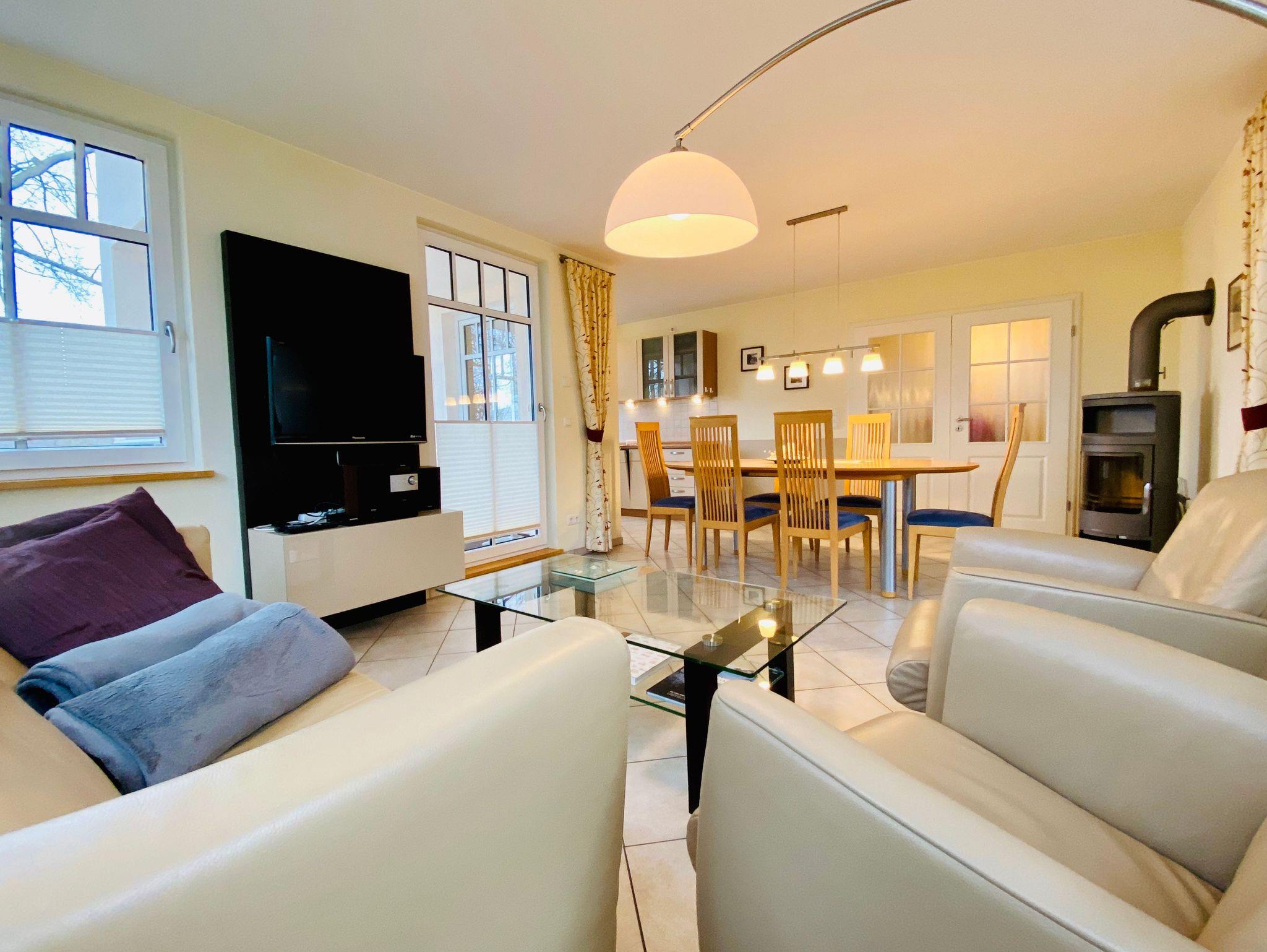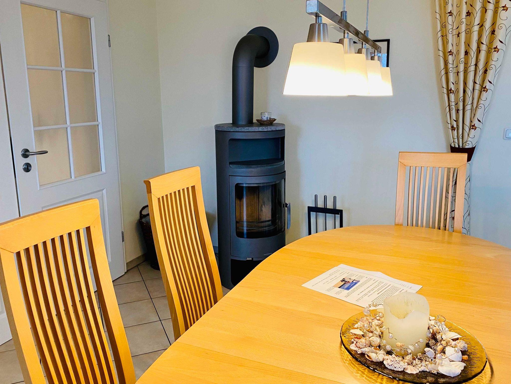 Sie hat einen großen lichtdurchfluteten Wohnbereich mit Couchecke, Esstisch und einem Kaminofen für die Gemütlichkeit ausgestattet. Die Komplettküche rundet das ganze ab.