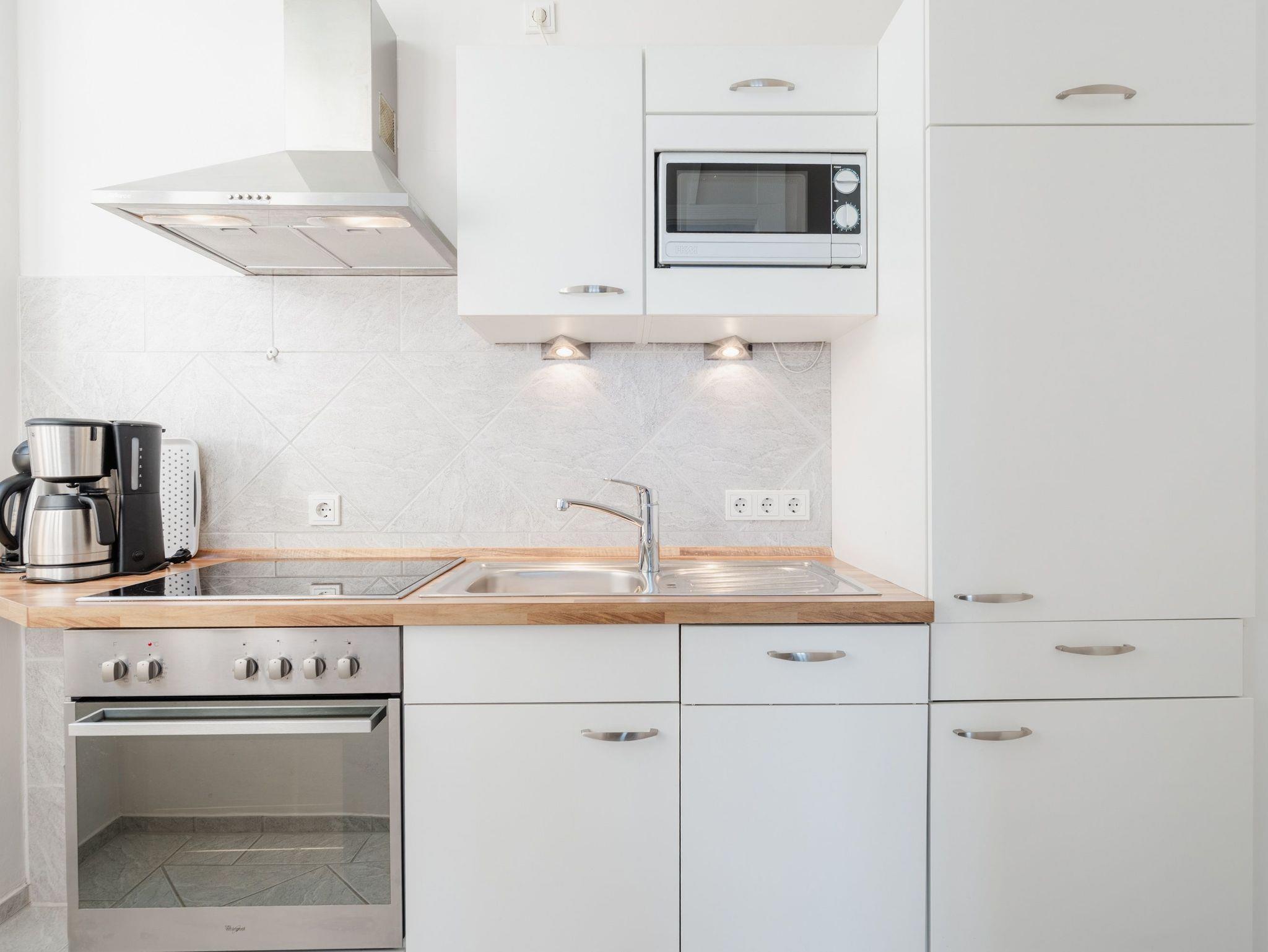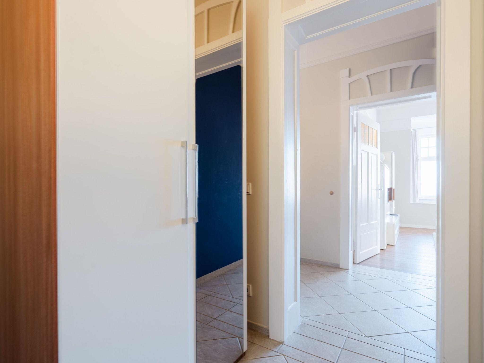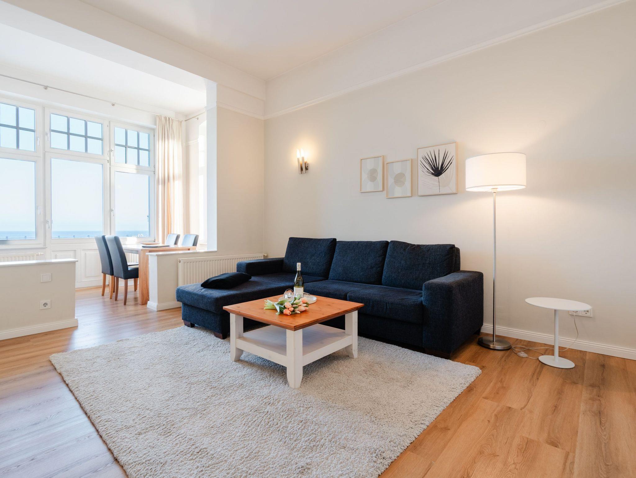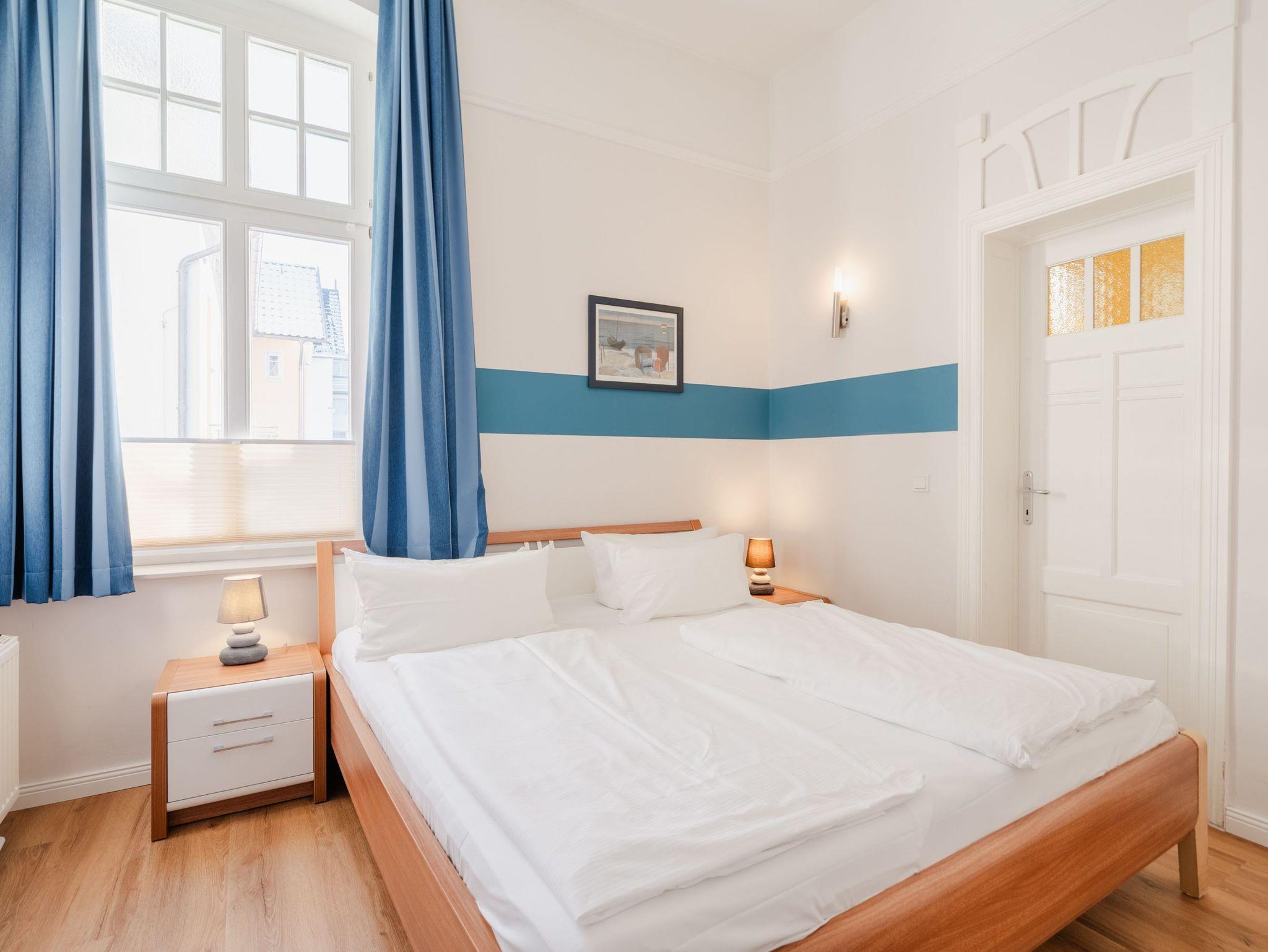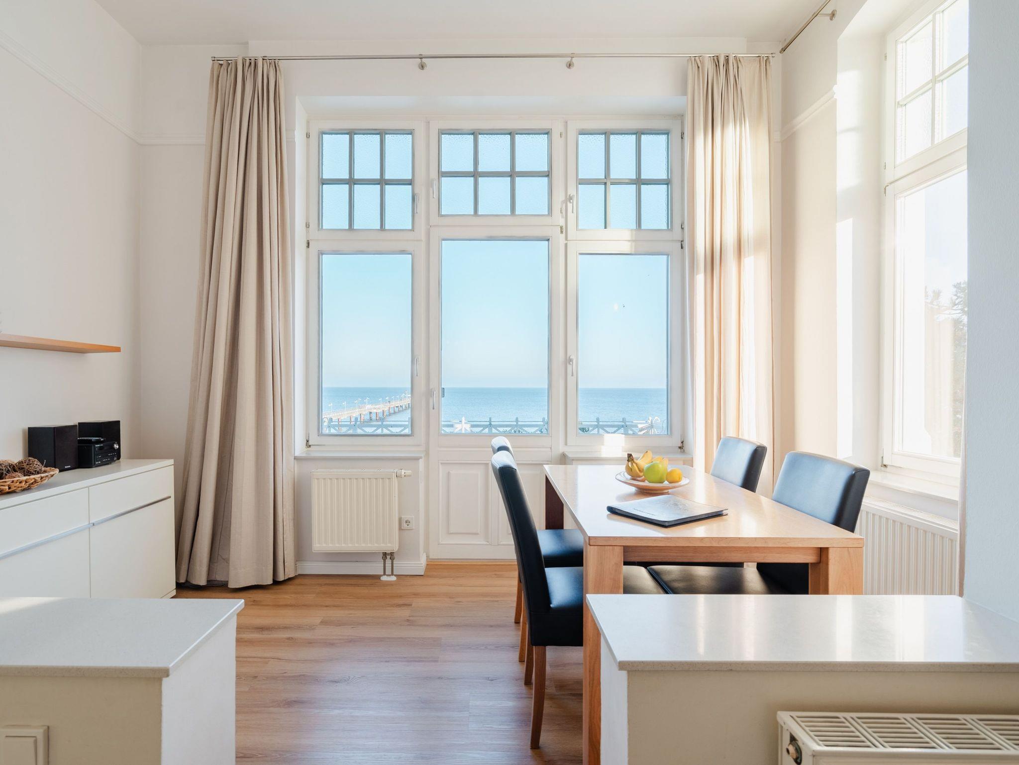 Ostsee, wohin das Auge reicht. Die Ferienwohnung 9 empfängt Sie im 2. Obergeschoss der Villa und offeriert Ihnen einen klassischen, gemütlichen Wohnstil. Der Wohnbereich ist mit einer Sitzgruppe mit Flat-TV ausgestattet und geht in eine offene Veranda mit Essplatz und Balkon über. Dieses Domizil bietet 2-4 Personen Platz für den Urlaub. Sie finden hier zwei Schlafzimmer, eines mit Doppelbett (1,80m x 2,00m) und Durchgang zum zweiten Schlafbereich mit Etagenbett (0,90m x 2,00m - ideal für Kinder). Im Wohnbereich kann die Schlafcouch als weitere Schlafmöglichkeit genutzt werden. Für Ihren Komfort sind die Betten bei der Anreise bezogen und Handtücher liegen bereit (Erstausstattung). Das Bad bietet zwei Waschbecken, Dusche und Föhn. Für Ihren PKW steht Ihnen ein Parkplatz vor dem Haus zur Verfügung.