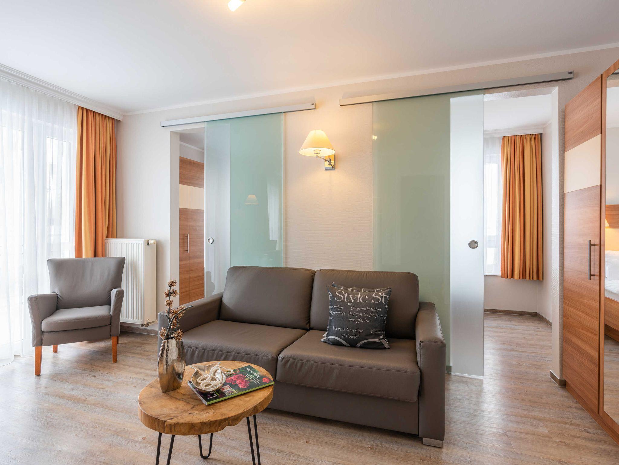 Moderne stilvolle 2 Zimmerferienwohnung ca. 2 - 3 Personen. Wohnzimmer mit TV, CD Eßplatz und integrierter Vollküche mit Geschirrspüler. Die Wohnung besitzt eine sonnige Terrasse mit Bestuhlung.