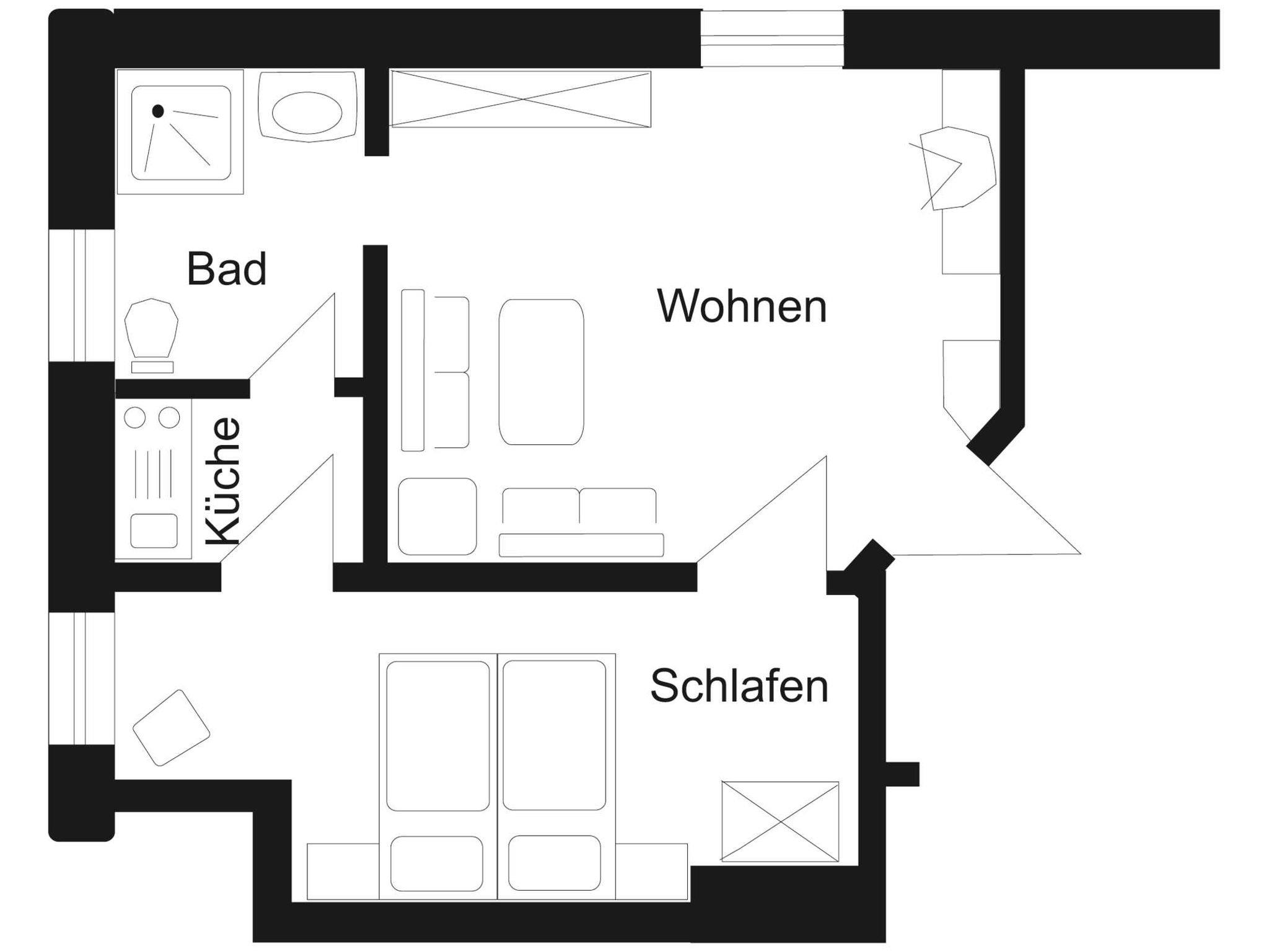 Für 1-3 Personen, 33-40 qm, Pantry- bzw. Mini-Küche, DU/WC, im EG oder 2. OG, Blick Richtung Stadt/Hof. Zimmergrundrisse und Größe können leicht variieren.