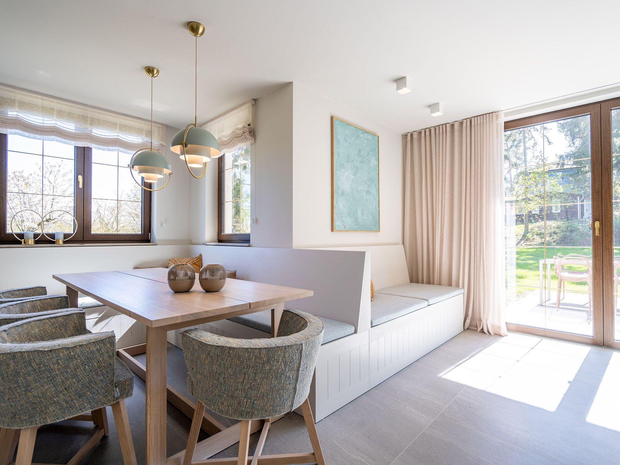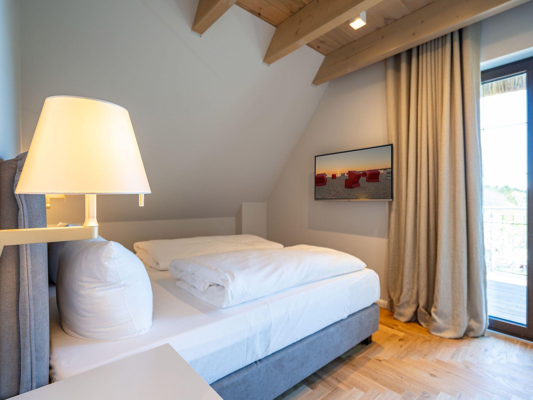 Willkommen in der charmanten Reetdach-Doppelhaushälfte, N° 4, im idyllischen Seebad Bansin. Diese geräumige Ferienwohnung erstreckt sich über drei Etagen und bietet Platz für bis zu 8 Erwachsene, perfekt für einen erholsamen Urlaub an der Ostseeküste. Im Erdgeschoss erwartet Sie ein einladender offener Wohn- und Essbereich, der für gemütliche Stunden mit Ihren Liebsten geschaffen ist. Die voll ausgestattete Küche verfügt über alles, was Sie benötigen, einschließlich eines Essplatzes für 8 Personen. Eine behagliche Sitzgruppe mit einem Flat-TV und einem einladenden Kaminofen sorgt für zusätzlichen Komfort. Vom Wohnbereich haben Sie Zugang zur sonnigen Süd-West-Terrasse (12 qm), die sich perfekt für entspannte Stunden im Freien eignet. Ein modernes Bad mit Sauna, einer erfrischenden Dusche, einem Waschtisch und einem WC sowie ein Waschtrockner im Flurschrank vervollständigen das Angebot im Erdgeschoss. Im ersten Obergeschoss finden Sie drei komfortable Schlafzimmer, jeweils ausgestattet mit gemütlichen Boxspringdoppelbetten (1,80m x 2,00m), einem Kleiderschrank und zwei davon zusätzlich mit einem Flat-TV. Zwei der Schlafzimmer verfügen über Zugang zum Süd-Ost-Balkon, der einen herrlichen Blick ins Grüne bietet. Ein weiteres Badezimmer mit Dusche, Waschtisch und WC vervollständigt diese Etage. Das dritte Obergeschoss beherbergt das vierte Schlafzimmer, das ebenfalls mit einem komfortablen Boxspringdoppelbett (1,60m x 2,00m), einer Kommode und einem Flat-TV ausgestattet ist. Ein innenliegendes Gäste-WC sorgt für zusätzlichen Komfort. Im Außenbereich steht Ihnen ein wohnungseigener Abstellraum für Fahrräder zur Verfügung, ideal für Erkundungstouren in der Umgebung. Zudem bieten zwei Stellplätze unter dem Carport bequemen Platz für Ihre Fahrzeuge. Erleben Sie unvergessliche Urlaubstage in dieser wunderschönen Ferienwohnung, die Komfort, Gemütlichkeit und eine erstklassige Lage vereint und Ihnen einen perfekten Rückzugsort an der Ostseeküste bietet.