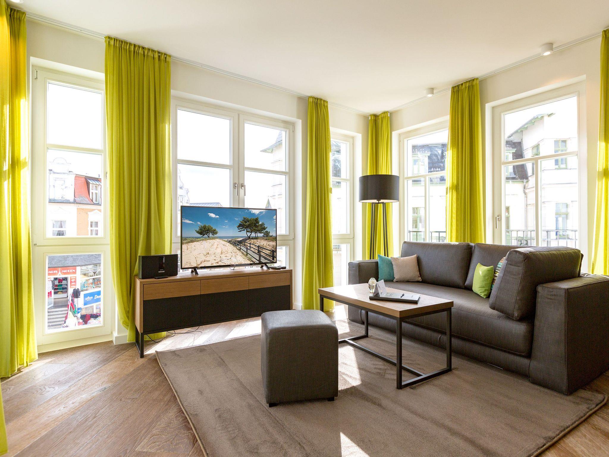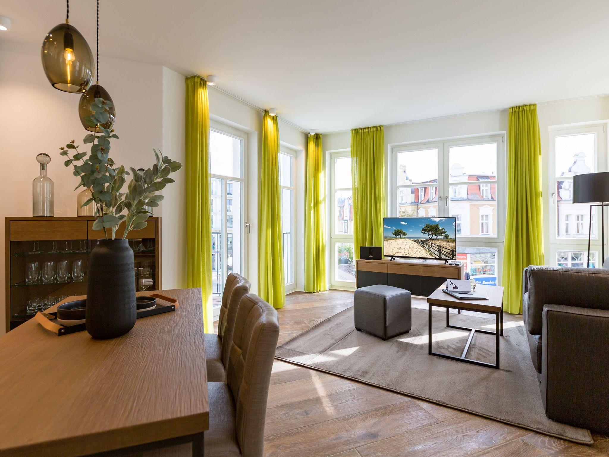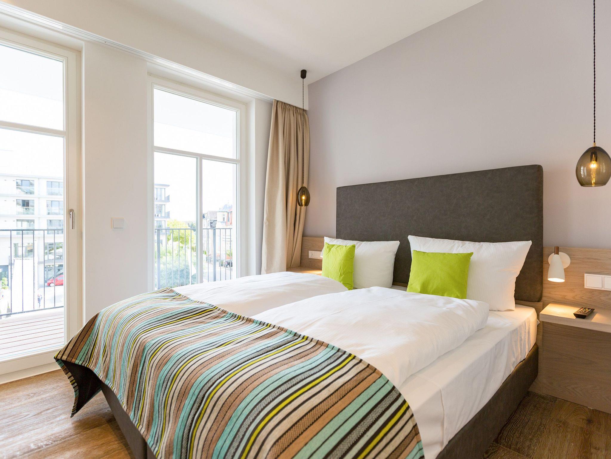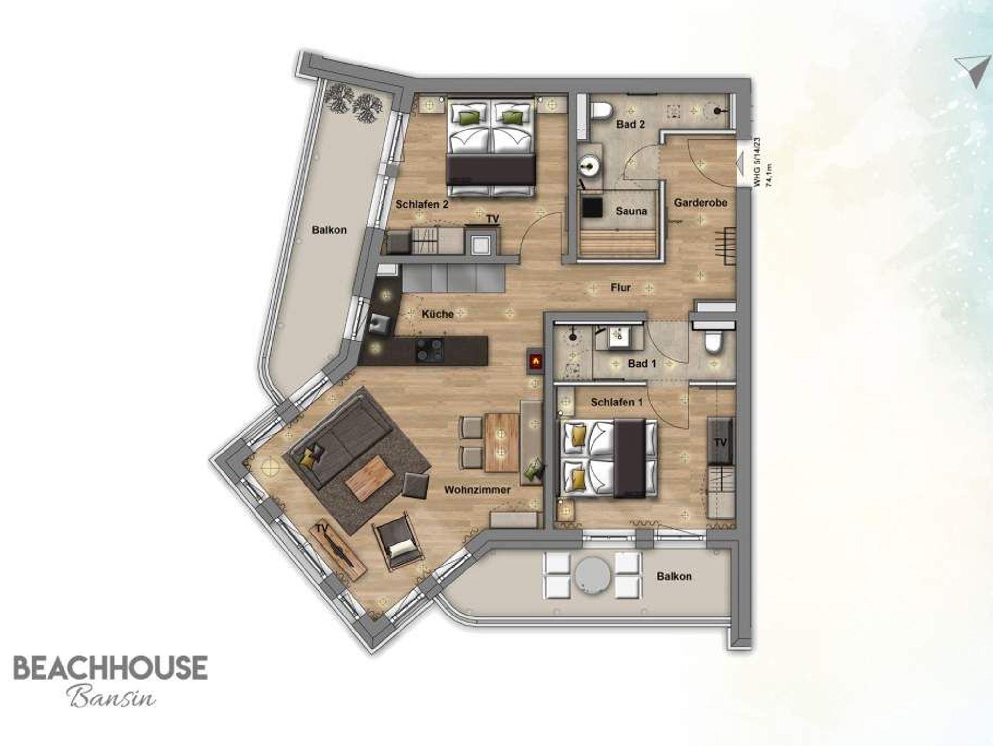 Frische, helle Farben empfangen die Ostseeauszeitler in diesem schönen und großzügigen Ferienappartement im 2. Stock des ganz neuen Beachhouses. Aus den 69 elegant eingerichteten Quadratmetern wollen die bis zu vier Personen und ein Kleinkind (bis drei Jahre im Kinderreisebett) am Ende garantiert gar nicht wieder ausziehen. Denn die Wirkung, die dieses Ferienparadies auf seine Gäste hat, ist absolut entspannend und erholsam. Mitten im Herzen des Kaiserbades und über allen anderen Urlaubern können Sie auf den beiden Balkonen ihres Appartements (8 und 9 Quadratmeter groß) jeglichen Stress vergessen und beim Blick über die Ostsee vom Süd-Ost-Balkon aus oder auf die wunderschönen alten Villen der Bergstraße vom Süd-West-Balkon aus neue Energie tanken. Und nicht vergessen: Die gesundheitsfördernde Meeresluft tief einatmen. Doch nicht nur auf den Balkonen lässt es sich wunderbar aushalten. Auch das geräumige Wohn-Esszimmer lädt zum ausgiebigen Faulenzen ein. Eine schöne Sofa-Sitz-Gruppe ist der beste Platz zum Fernsehgucken auf dem großen Flat-TV, zum Musik hören über die Bluetooth-Hi-Fi-Anlage oder einfach nur zum entspannten Schauen auf das Flammenspiel des Gas-Kamins. Den können Sie sogar per Knopfdruck ein und ausschalten. In der zum Wohnzimmer gehörenden, offenen Küche ist alles vorhanden, was Sie für Frühstück, Mittagessen oder Abendbrot brauchen können. Die Geräte wie Herd, Backofen, Kaffeemaschine oder Geschirrspüler sind allesamt hochwertige Markengeräte. Edles Design-Geschirr und Gläser finden Sie in den Küchenschränken und in der stylischen Vitrine. Hier steht auch ein gemütlicher Esstisch, an dem es Spaß macht, gemeinsam zu essen und zu erzählen. Vergnügen bereitet in dieser Wohnung aber nicht nur das Wohnzimmer, sondern eigentlich alles. Ganz besonders das Schlafen. Denn in den bequemen Boxspringdoppelbetten (einmal 1,60 m x 2,00 m und einmal 1,80 m x 2,00 m) in den beiden Schlafzimmern schläft es sich einfach himmlisch. Ein Flat-TV und ein Schrank gehören ebenfalls zur Ausstattung. Jedes Schlafzimmer hat zudem Zugang zu einem der Balkone. Wellness für alle Sinne ? so könnte man das Motto des Appartements beschreiben. Im Masterbad erwartet Sie nämlich eine Finnische Sauna, die Ihre Gesundheit mittels Schwitzen mächtig auf Trapp bringt. Apropos Bäder. Von denen gibt es in der Nummer 14 gleich zwei. Beide sind mit Regendusche, Waschtisch und WC ausgestattet. Handtücher liegen bei Anreise für Sie bereit und die Betten sind bezogen. In der Küche steht ein Wasch-Trockner zu Ihrer Verfügung. Das WLAN ist kostenfrei. In der modernen Tiefgarage ist für Sie der Stellplatz Nr. 14 im Doppelparker unten (max. Höhe 1,85 m, max. Länge 5,10 m, max. Breite 2,50 m, max. Last 2.600 kg) reserviert.
