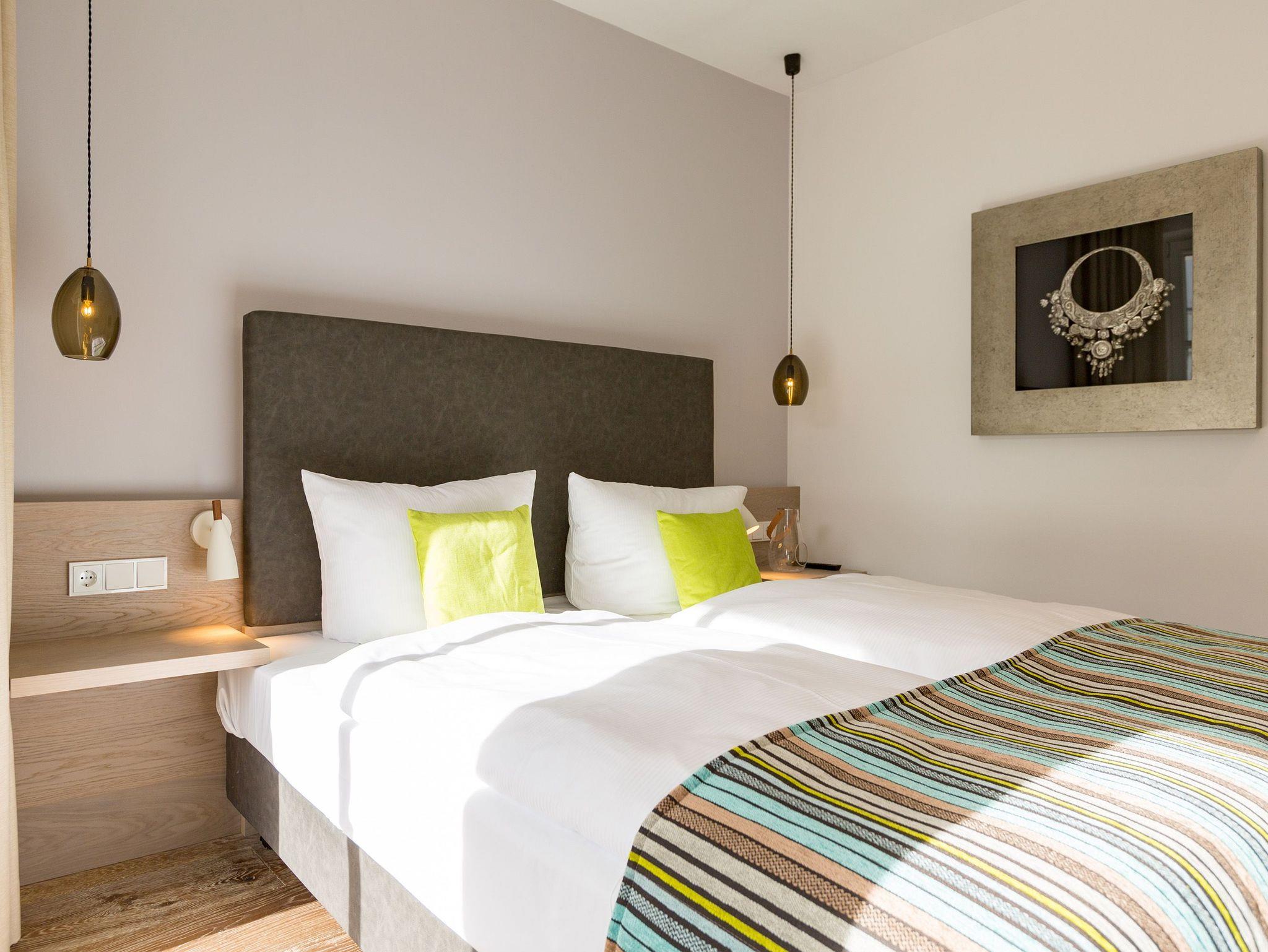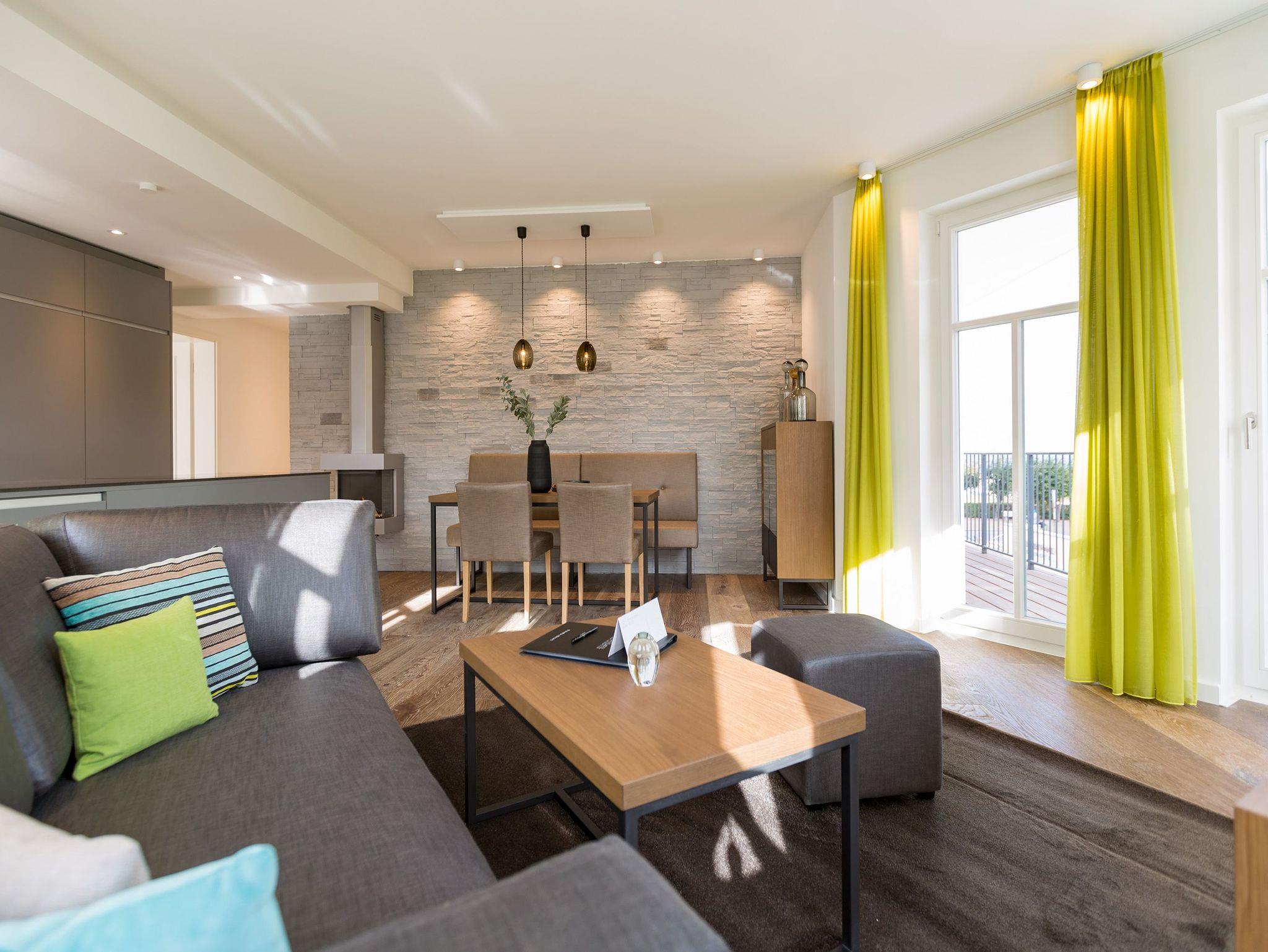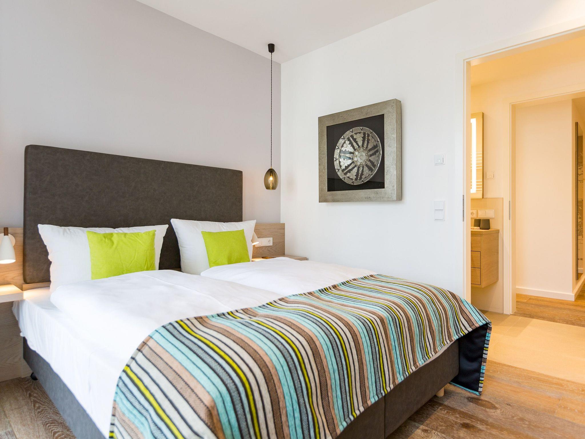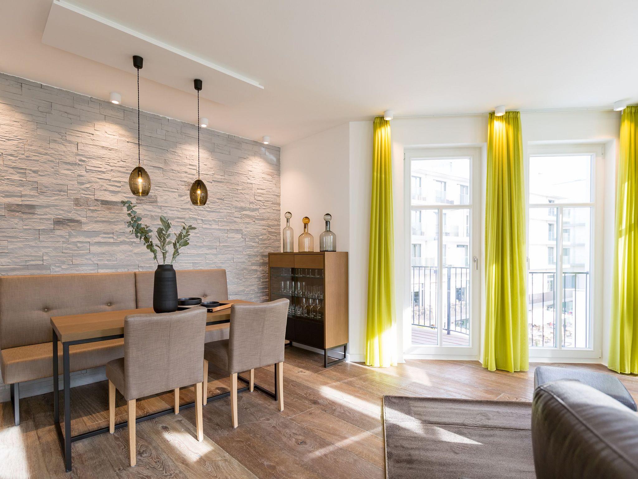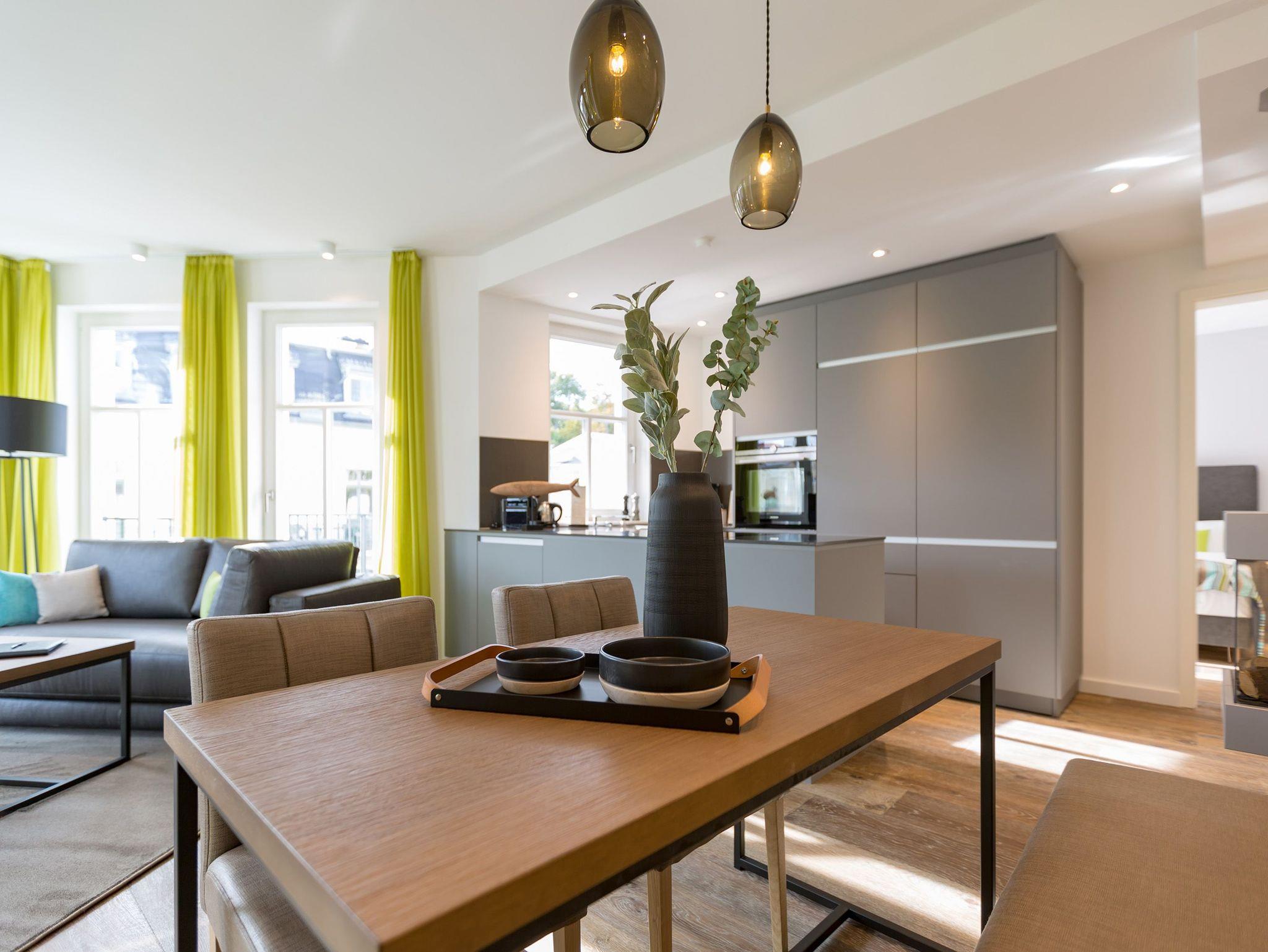 Frische, helle Farben empfangen die Ostseeauszeitler in diesem schönen und großzügigen Ferienappartement im 2. Stock des ganz neuen Beachhouses. Aus den 69 elegant eingerichteten Quadratmetern wollen die bis zu vier Personen und ein Kleinkind (bis drei Jahre im Kinderreisebett) am Ende garantiert gar nicht wieder ausziehen. Denn die Wirkung, die dieses Ferienparadies auf seine Gäste hat, ist absolut entspannend und erholsam. Mitten im Herzen des Kaiserbades und über allen anderen Urlaubern können Sie auf den beiden Balkonen ihres Appartements (8 und 9 Quadratmeter groß) jeglichen Stress vergessen und beim Blick über die Ostsee vom Süd-Ost-Balkon aus oder auf die wunderschönen alten Villen der Bergstraße vom Süd-West-Balkon aus neue Energie tanken. Und nicht vergessen: Die gesundheitsfördernde Meeresluft tief einatmen. Doch nicht nur auf den Balkonen lässt es sich wunderbar aushalten. Auch das geräumige Wohn-Esszimmer lädt zum ausgiebigen Faulenzen ein. Eine schöne Sofa-Sitz-Gruppe ist der beste Platz zum Fernsehgucken auf dem großen Flat-TV, zum Musik hören über die Bluetooth-Hi-Fi-Anlage oder einfach nur zum entspannten Schauen auf das Flammenspiel des Gas-Kamins. Den können Sie sogar per Knopfdruck ein und ausschalten. In der zum Wohnzimmer gehörenden, offenen Küche ist alles vorhanden, was Sie für Frühstück, Mittagessen oder Abendbrot brauchen können. Die Geräte wie Herd, Backofen, Kaffeemaschine oder Geschirrspüler sind allesamt hochwertige Markengeräte. Edles Design-Geschirr und Gläser finden Sie in den Küchenschränken und in der stylischen Vitrine. Hier steht auch ein gemütlicher Esstisch, an dem es Spaß macht, gemeinsam zu essen und zu erzählen. Vergnügen bereitet in dieser Wohnung aber nicht nur das Wohnzimmer, sondern eigentlich alles. Ganz besonders das Schlafen. Denn in den bequemen Boxspringdoppelbetten (einmal 1,60 m x 2,00 m und einmal 1,80 m x 2,00 m) in den beiden Schlafzimmern schläft es sich einfach himmlisch. Ein Flat-TV und ein Schrank gehören ebenfalls zur Ausstattung. Jedes Schlafzimmer hat zudem Zugang zu einem der Balkone. Wellness für alle Sinne ? so könnte man das Motto des Appartements beschreiben. Im Masterbad erwartet Sie nämlich eine Finnische Sauna, die Ihre Gesundheit mittels Schwitzen mächtig auf Trapp bringt. Apropos Bäder. Von denen gibt es in der Nummer 14 gleich zwei. Beide sind mit Regendusche, Waschtisch und WC ausgestattet. Handtücher liegen bei Anreise für Sie bereit und die Betten sind bezogen. In der Küche steht ein Wasch-Trockner zu Ihrer Verfügung. Das WLAN ist kostenfrei. In der modernen Tiefgarage ist für Sie der Stellplatz Nr. 14 im Doppelparker unten (max. Höhe 1,85 m, max. Länge 5,10 m, max. Breite 2,50 m, max. Last 2.600 kg) reserviert.
