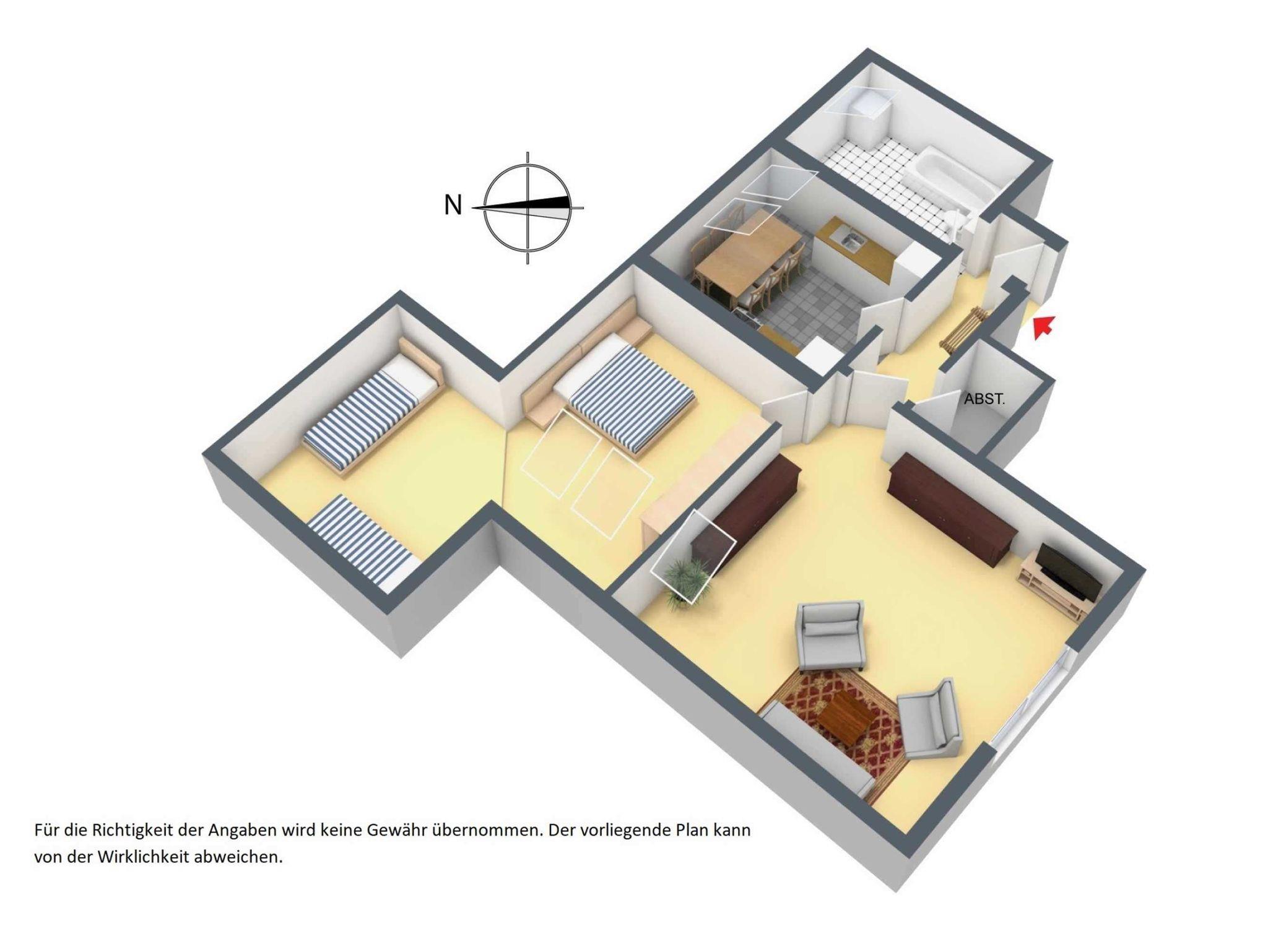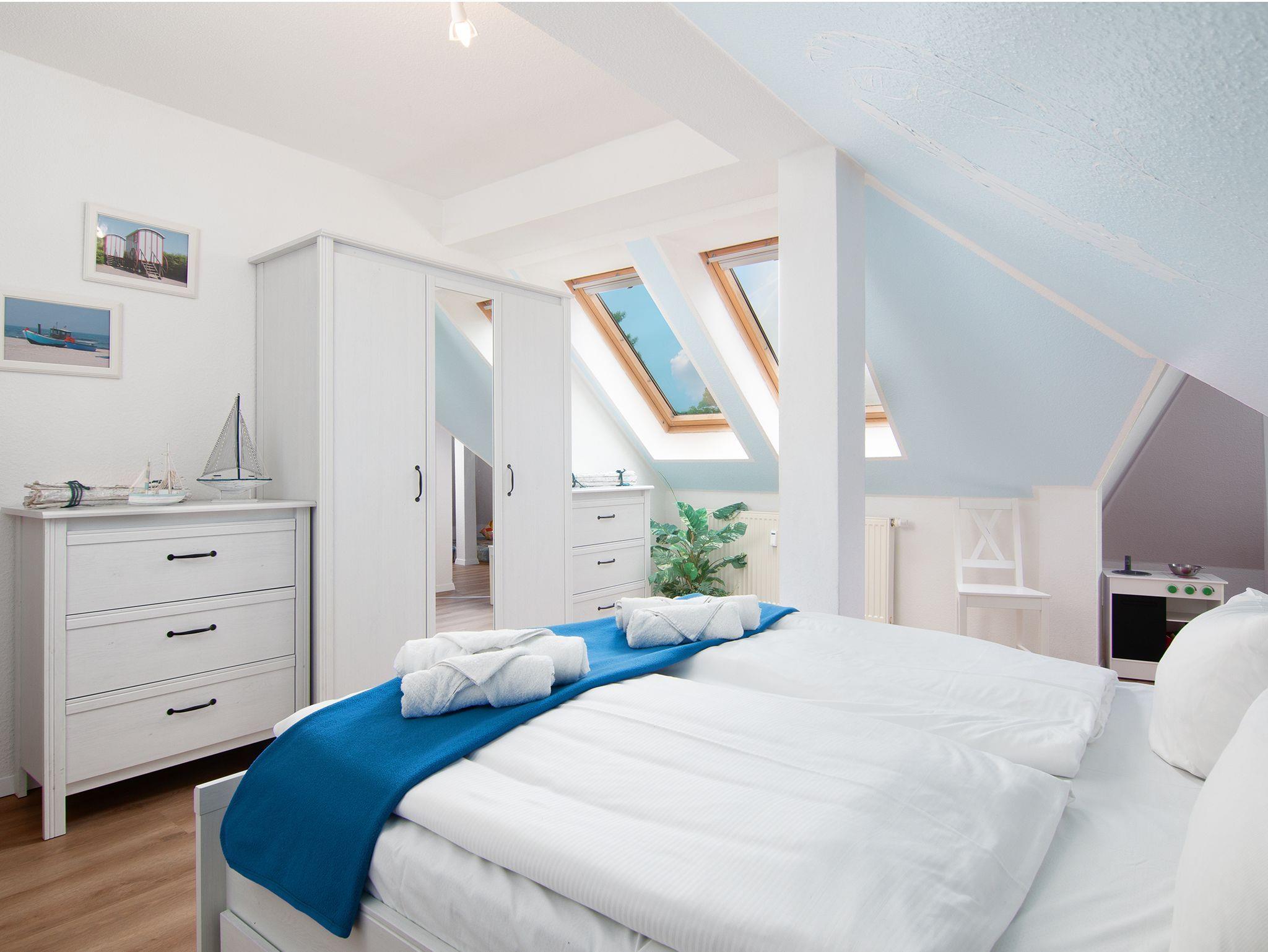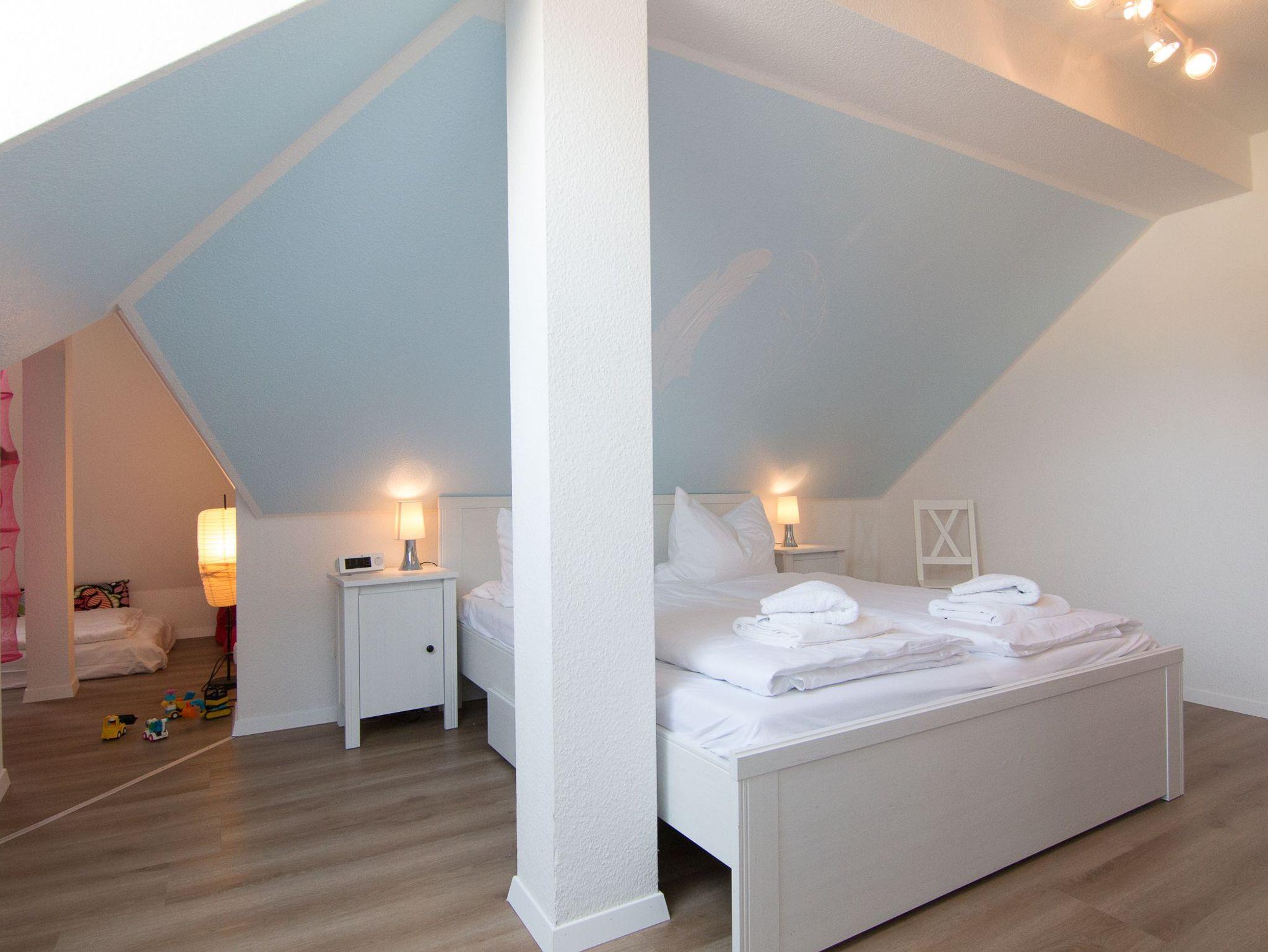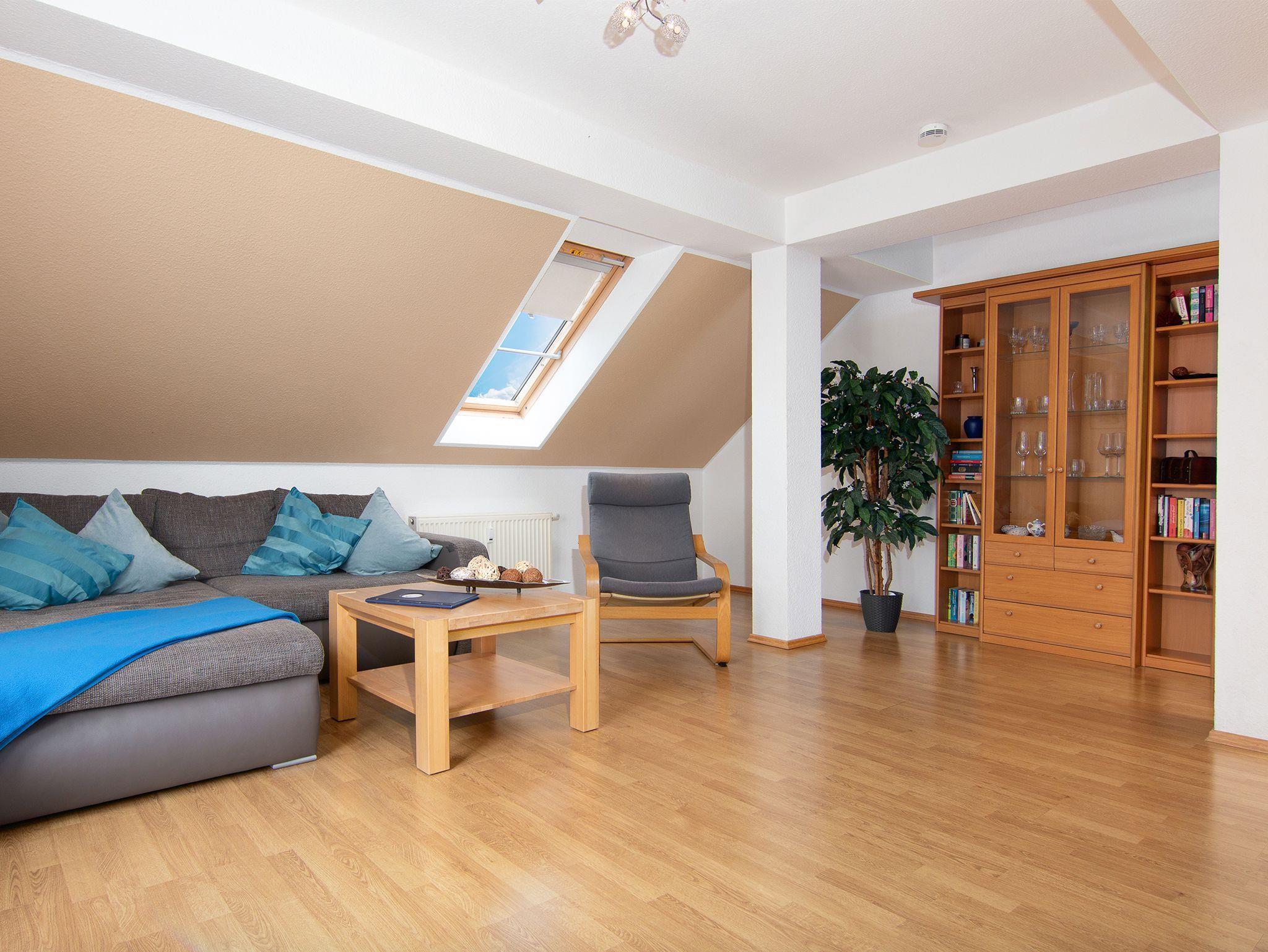 Die Ferienwohnung kann mit vier Erwachsenen und einem Kind belegt werden. 2 Gäste schlafen auf dem bequemen Schlafsofa im Wohnzimmer und für Ihr Kind wird das Turmzimmer aufgebettet. Kinderbett und -stuhl stehen für Sie bereit.