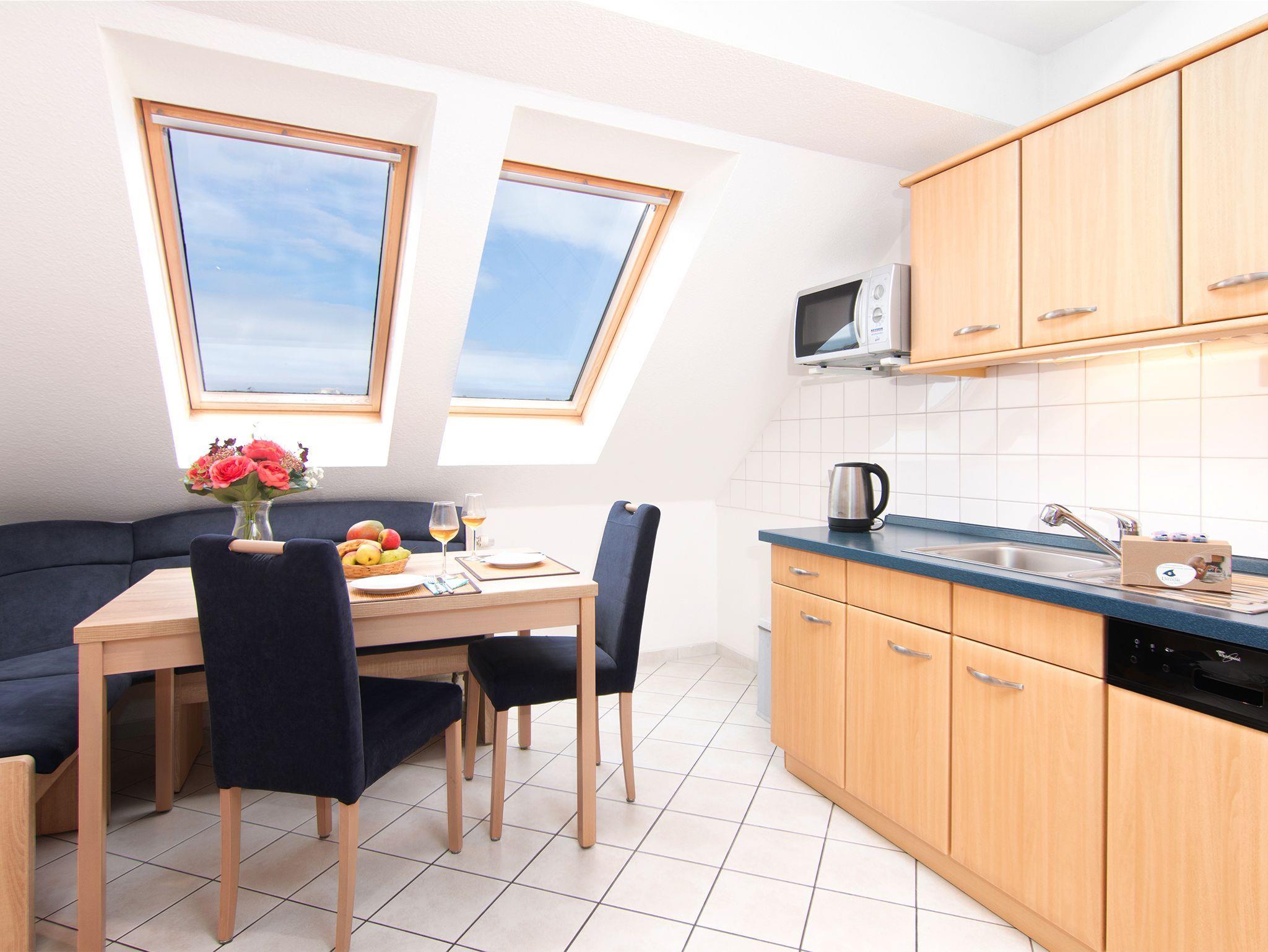 Die separate, voll ausgestattete Küche mit Nespresso Kaffeemaschine mit elektrischem Milchaufschäumer, Geschirrspüler und Essecke sowie das große Tageslichtbad mit Badewanne sorgen für einen angenehmen Aufenthalt.