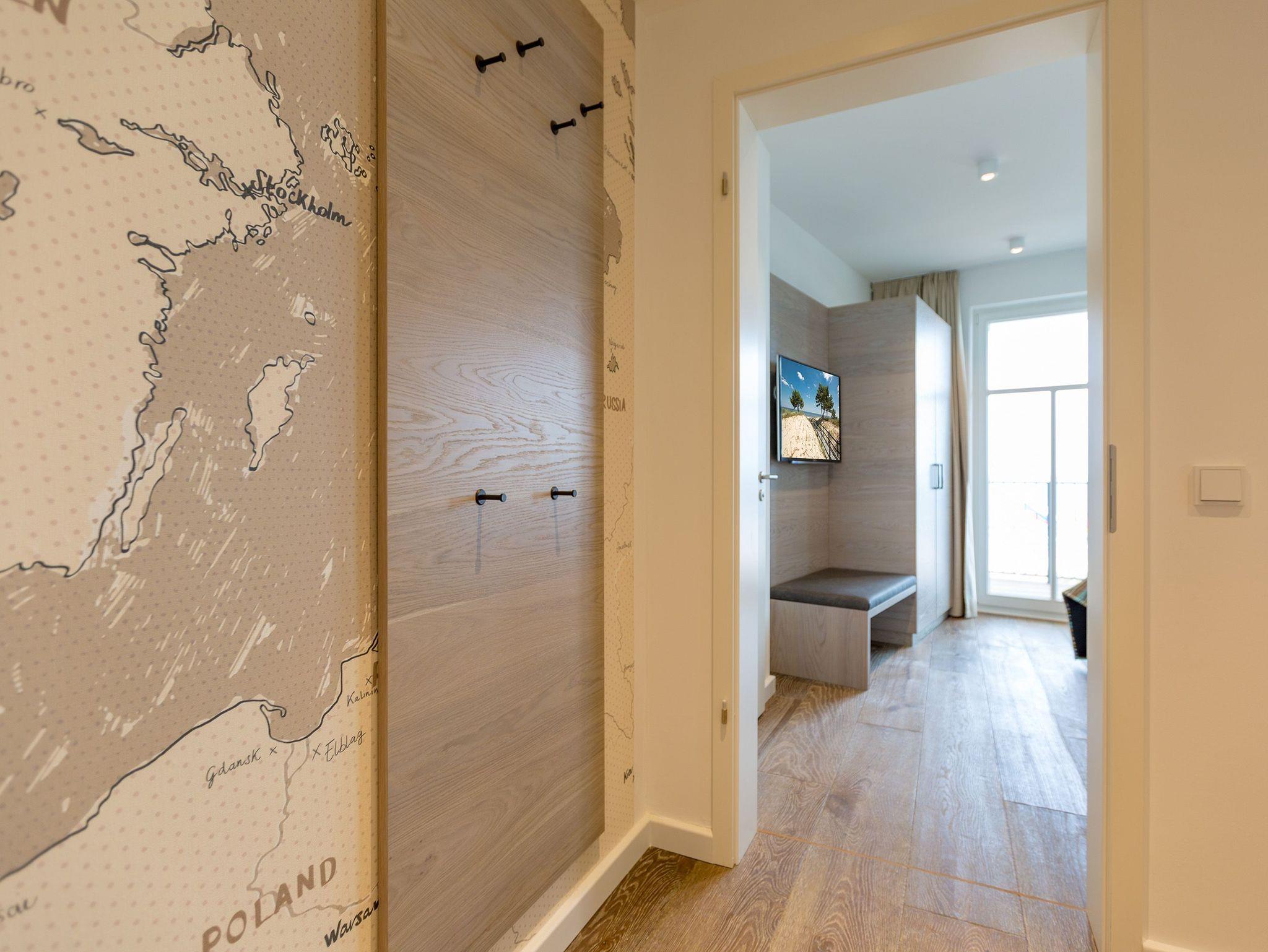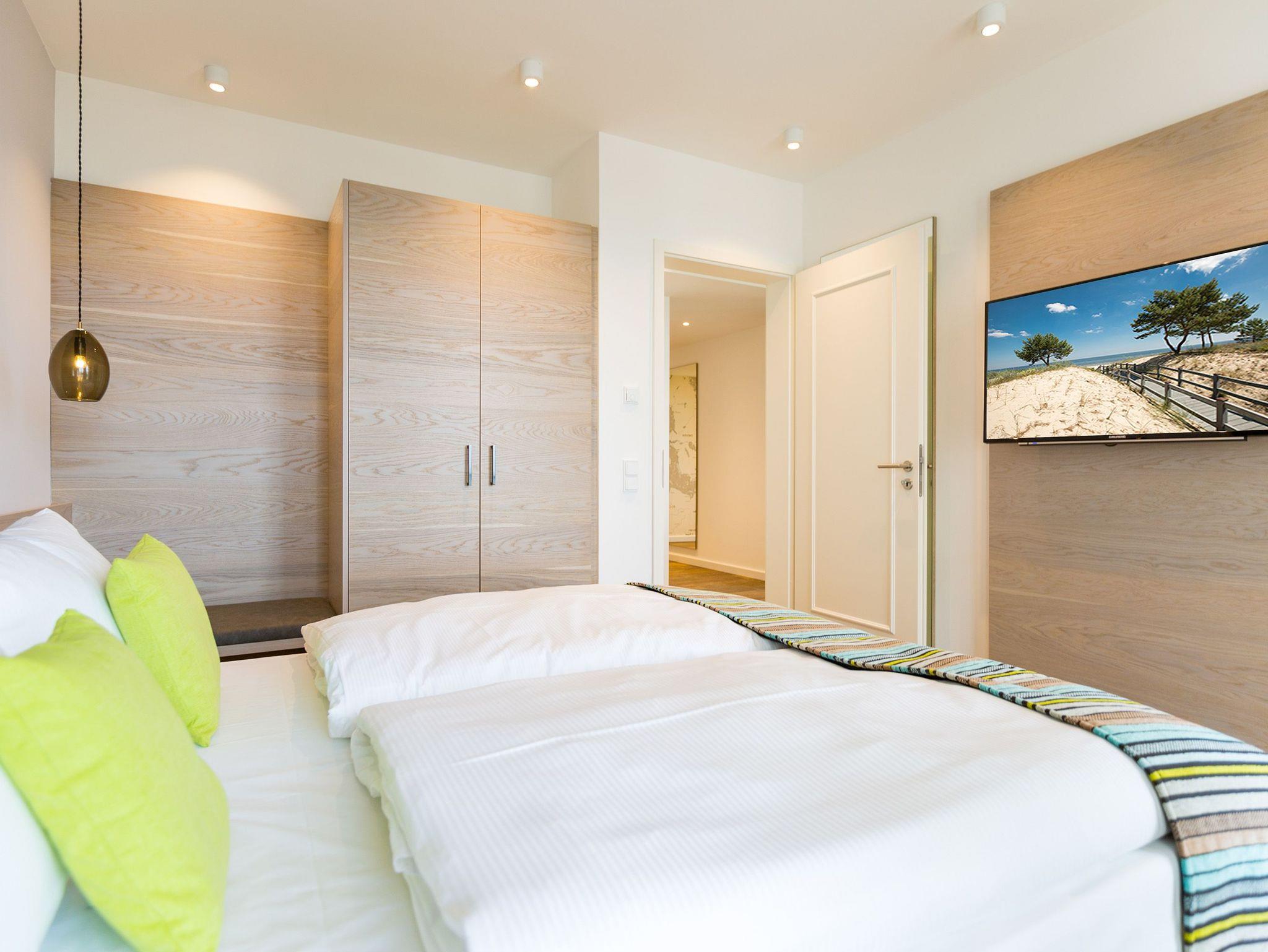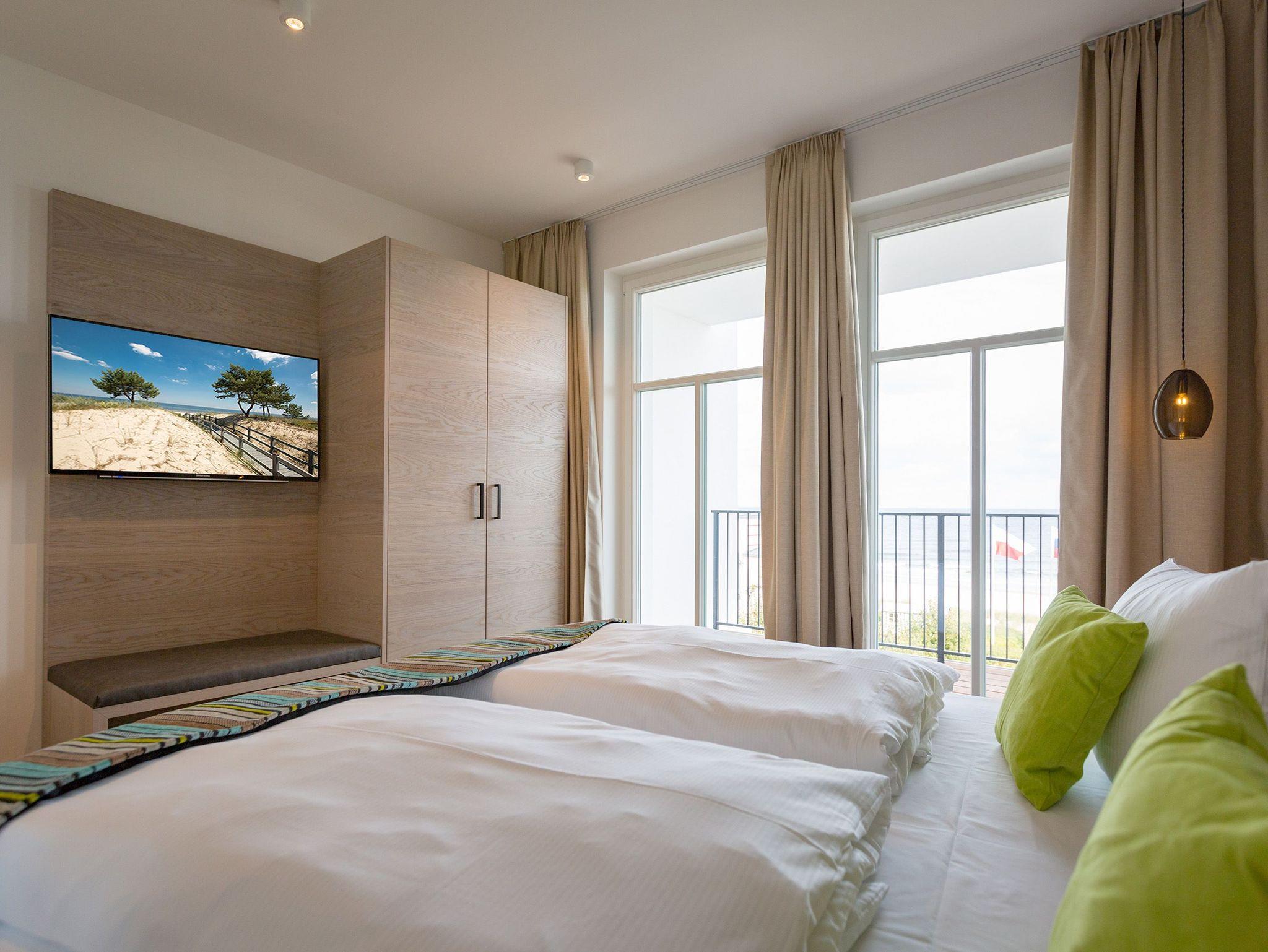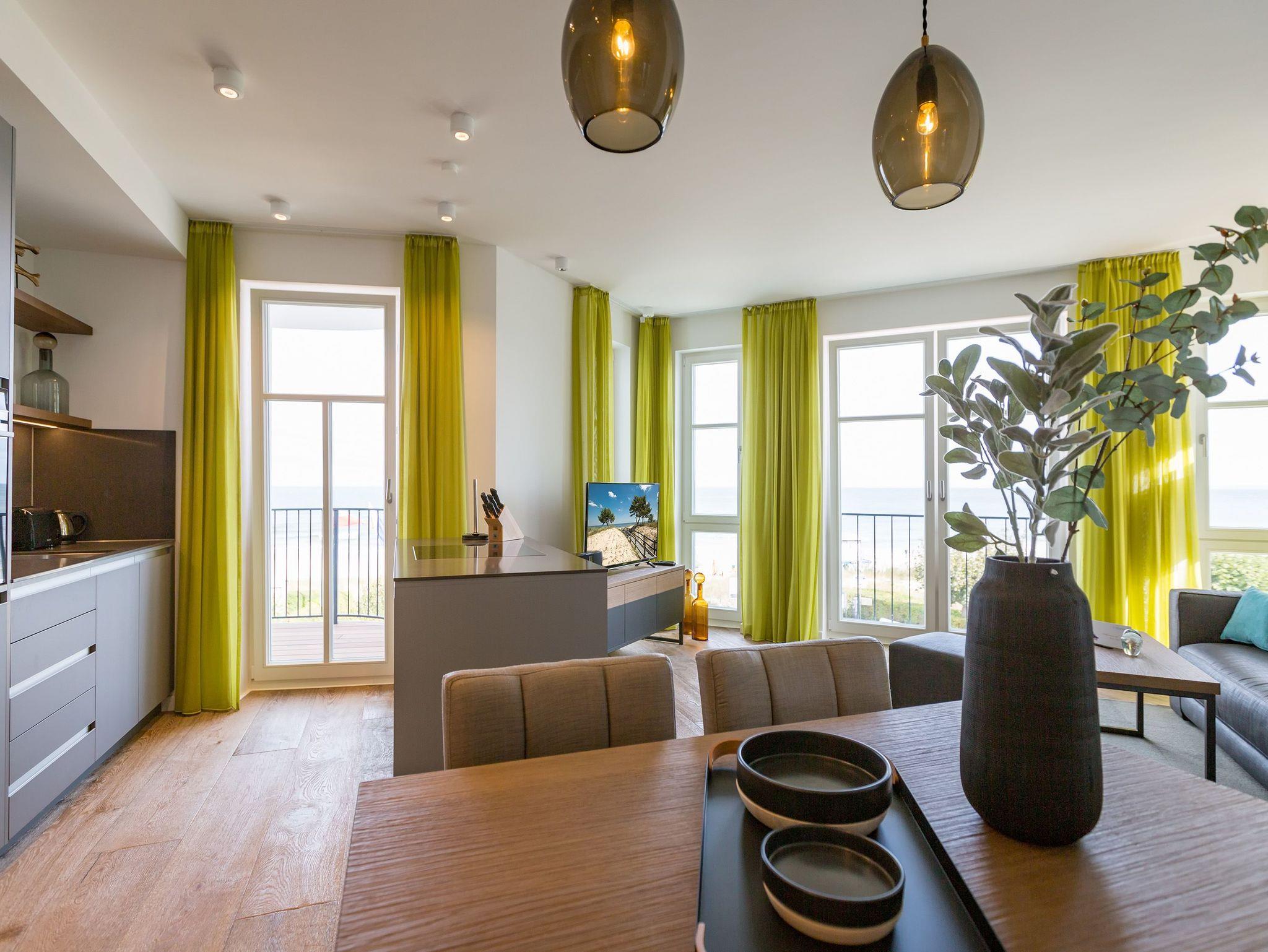 Leiden Sie auch an Meersehnsucht? In diesem Urlaubsparadies im 2. Stock des Beachhouses können Sie auf 74 Quadratmetern mit bis zu vier Personen und einem Kleinkind (bis drei Jahre im Kinderreisebett) Ihre Liebe zur Ostsee mit direktem Blick auf das endlose Blau genießen. Näher dran ist nur noch am Strand. Ob im wunderschön eingerichteten Wohnzimmer oder einem der beiden Schlafzimmer das Meer legt sich Ihnen in allen drei Zimmern zu Füßen. Von den beiden Balkonen (8 und 6 Quadratmeter) können Sie es schon morgens zum Frühstück genießen. Dann glitzert die Sonne auf den Wellen als lägen tausend Diamanten auf dem Wasser. In der offenen Wohnküche finden Sie alles, was Sie zum Zubereiten eines ausgiebigen Frühstückes, aber auch zum Kochen, Braten oder Backen brauchen. Hochwertige Markengeräte wie Geschirrspüler, Backofen, eine Kochinsel, Kühlschrank oder Mikrowelle erleichtern Ihnen das Zubereiten ungemein. Edles Geschirr sorgt für einen noblen Rahmen. Ist das Wetter einmal nicht zum Draußenessen geeignet, lädt der schöne Esstisch zum Einnehmen der Mahlzeiten ein. Das Wohn-Esszimmer strahlt durch seine großen Fenster, die viel Licht einlassen, die angenehmen und wohl temperierten Farbakzente und die exklusiven Design-Möbel eine harmonisierende und entspannende Atmosphäre aus. Auf dem bequemen Sofa lässt es sich wunderbar Relaxen. Für viel Gemütlichkeit sorgt ein Gas-Kamin. Zur Unterhaltung steht Ihnen ein großer Flat-TV sowie eine Hi-Fi-Anlage mit Bluetooth-Funktion zur Verfügung. Das WLAN ist in der Wohnung kostenfrei. Komfortable Boxspringdoppelbetten (1,80 m x 2,00 m und 1,60 m x 2,00 m) werden Ihren Träumen Flügel verleihen und die Urlaubsnächte zu einem echten Vergnügen machen. Ein jedes der beiden Schlafzimmer hat einen eigenen Balkon, einen Flat-TV und einen geräumigen Schrank. Das Appartement verfügt über zwei Bäder, in denen Sie jeweils eine schöne und ebenerdige Regendusche, einen Waschtisch mit großem Spiegel und ein WC vorfinden. Zu einer kleinen Wellness-Auszeit wird Ihr Ostseeurlaub außerdem. Denn im Masterbad erwartet Sie zudem eine Finnische Sauna. Da werden sogar die Schlechtwettertage an der Ostsee zu wunderbar entspannenden Kuscheltagen. Zum Waschen Ihrer Urlaubsgarderobe gibt es in einem separaten Hauswirtschaftsraum einen Wasch-Trockner. Kommen Sie also einfach an und genießen Sie Ihre Auszeit am Meer. Den Rest machen wir. Die Betten sind bei Ihrer Anreise bereits bezogen und Handtücher liegen bereit. In der modernen Tiefgarage ist für Sie der Stellplatz Nr. 11 im Doppelparker unten (max. Höhe 1,85 m, max. Länge 5,10 m, max. Breite 2,50 m, max. Last 2.600 kg) reserviert.