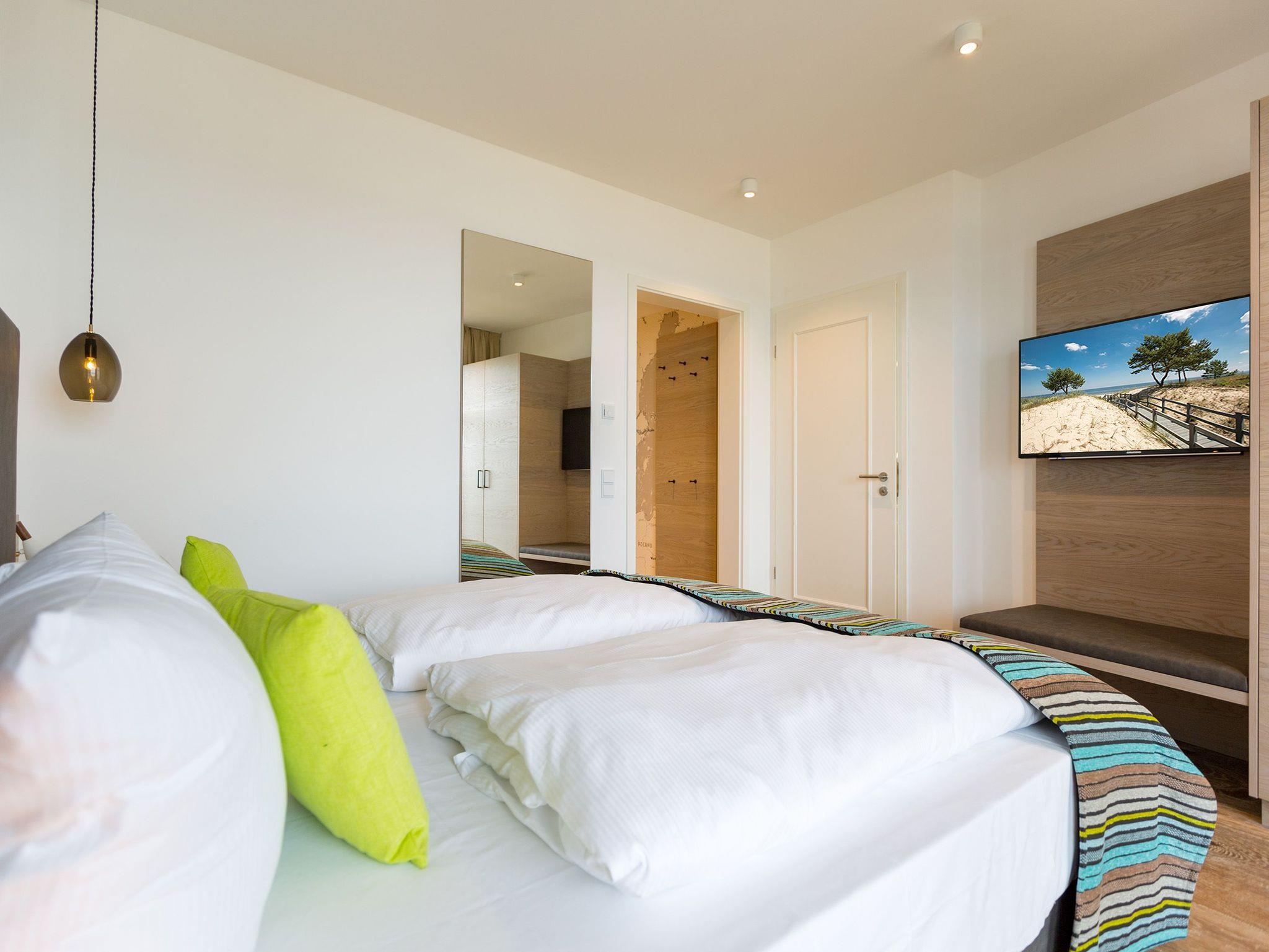 Leiden Sie auch an Meersehnsucht? In diesem Urlaubsparadies im 2. Stock des Beachhouses können Sie auf 74 Quadratmetern mit bis zu vier Personen und einem Kleinkind (bis drei Jahre im Kinderreisebett) Ihre Liebe zur Ostsee mit direktem Blick auf das endlose Blau genießen. Näher dran ist nur noch am Strand. Ob im wunderschön eingerichteten Wohnzimmer oder einem der beiden Schlafzimmer ? das Meer legt sich Ihnen in allen drei Zimmern zu Füßen. Von den beiden Balkonen (8 und 6 Quadratmeter) können Sie es schon morgens zum Frühstück genießen. Dann glitzert die Sonne auf den Wellen als lägen tausend Diamanten auf dem Wasser. In der offenen Wohnküche finden Sie alles, was Sie zum Zubereiten eines ausgiebigen Frühstückes, aber auch zum Kochen, Braten oder Backen brauchen. Hochwertige Markengeräte wie Geschirrspüler, Backofen, eine Kochinsel, Kühlschrank oder Mikrowelle erleichtern Ihnen das Zubereiten ungemein. Edles Geschirr sorgt für einen noblen Rahmen. Ist das Wetter einmal nicht zum Draußenessen geeignet, lädt der schöne Esstisch zum Einnehmen der Mahlzeiten ein. Das Wohn-Esszimmer strahlt durch seine großen Fenster, die viel Licht einlassen, die angenehmen und wohl temperierten Farbakzente und die exklusiven Design-Möbel eine harmonisierende und entspannende Atmosphäre aus. Auf dem bequemen Sofa lässt es sich wunderbar Relaxen. Für viel Gemütlichkeit sorgt ein Gas-Kamin. Zur Unterhaltung steht Ihnen ein großer Flat-TV sowie eine Hi-Fi-Anlage mit Bluetooth-Funktion zur Verfügung. Das WLAN ist in der Wohnung kostenfrei. Komfortable Boxspringdoppelbetten (1,80 m x 2,00 m und 1,60 m x 2,00 m) werden Ihren Träumen Flügel verleihen und die Urlaubsnächte zu einem echten Vergnügen machen. Ein jedes der beiden Schlafzimmer hat einen eigenen Balkon, einen Flat-TV und einen geräumigen Schrank. Das Appartement verfügt über zwei Bäder, in denen Sie jeweils eine schöne und ebenerdige Regendusche, einen Waschtisch mit großem Spiegel und ein WC vorfinden. Zu einer kleinen Wellness-Auszeit wird Ihr Ostseeurlaub außerdem. Denn im Masterbad erwartet Sie zudem eine Finnische Sauna. Da werden sogar die Schlechtwettertage an der Ostsee zu wunderbar entspannenden Kuscheltagen. Zum Waschen Ihrer Urlaubsgarderobe gibt es in einem separaten Hauswirtschaftsraum einen Wasch-Trockner. Kommen Sie also einfach an und genießen Sie Ihre Auszeit am Meer. Den Rest machen wir. Die Betten sind bei Ihrer Anreise bereits bezogen und Handtücher liegen bereit. In der modernen Tiefgarage ist für Sie der Stellplatz Nr. 11 im Doppelparker unten (max. Höhe 1,85 m, max. Länge 5,10 m, max. Breite 2,50 m, max. Last 2.600 kg) reserviert.