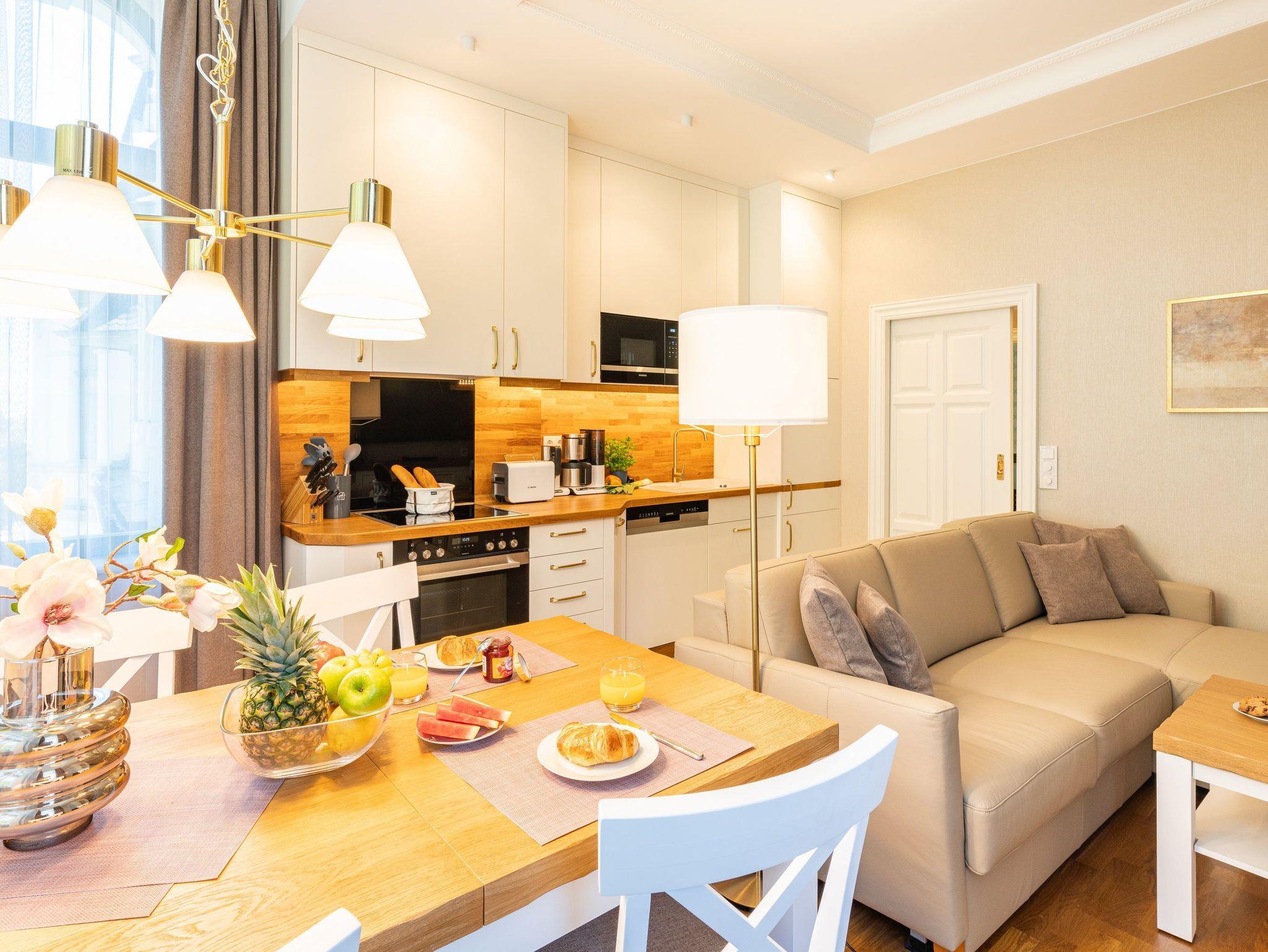Ein großzügiger Wohnbereich mit einem exklusiven Gaskamin erwartet Sie bereits, sodass Sie eine angenehme Wohlfühlatmosphäre das gesamte Jahr über genießen. Eine bequeme Couchgarnitur und ein Flat TV runden den Komfort perfekt ab und laden zum Entspannen und Füße hochlegen ein. Das helle Zwei-Zimmer-Appartement hat eine Größe von 46 Quadratmetern und liegt im 2. Obergeschoss der Villa Waldschloss. Die vollausgestattete Küche, welche speziell von einem einheimischen Tischler angefertigt wurde, ergänzt die Annehmlichkeiten dieses neuen Appartements mit allen Raffinessen: Backofen, Mikrowelle, Kühlschrank mit Gefrierfach, Toaster, Wasserkocher, Kaffeemaschine sowie einem Essplatz für 4 Personen mit Blick in den gegenüberliegenden Park. Echtholzparkett im Wohn- und Schlafraum, unkaputtbare Tapeten aus Amerika. Bei der Umgestaltung wurde nichts dem Zufall überlassen. Die vier Schlafplätze verteilen sich auf das Schlafzimmer mit einem bequemen und zugleich hochwertigem Boxspringbett (200 x 200cm / zwei getrennte Matratze) und der Schlafcouch im Wohnbereich, welche sich im Handumdrehen für zwei Gäste als Schlafmöglichkeit umfunktionieren lässt. Ein Kleiderschrank zum Verstauen Ihrer Habseligkeiten während Ihrer Urlaubszeit steht für Sie bereit. Lassen Sie hier den Tag ausklingen oder genießen Ihre Lieblingsserie vor dem TV.
