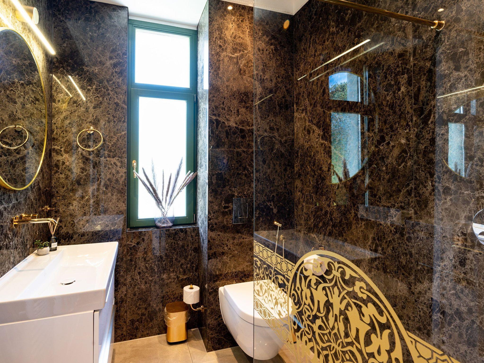 Damit Sie Ihre wohlverdiente Urlaubszeit bereits am Anreisetag in vollen Zügen genießen können,? haben wir das Bett für Sie und das für Ihre lieben Mitreisenden bereits bezogen und ein Duschtuch sowie ein kleines Handtuch bereitgelegt. Das Badezimmer als Experiment, einmal mit einer auffallenderen und auch ungewöhnlicheren Farbgestaltung ein Wohlfühlgefühl de luxe zu erzeugen. Das Ergebnis kann sich sehen lassen: großformatige dunkle Natursteinfliesen gepaart mit einer hellen Badkeramik sowie Armaturen und Accessoires in Messing präsentieren nun zusammen mit einer bodengleichen Dusche den Urlaubskomfort.