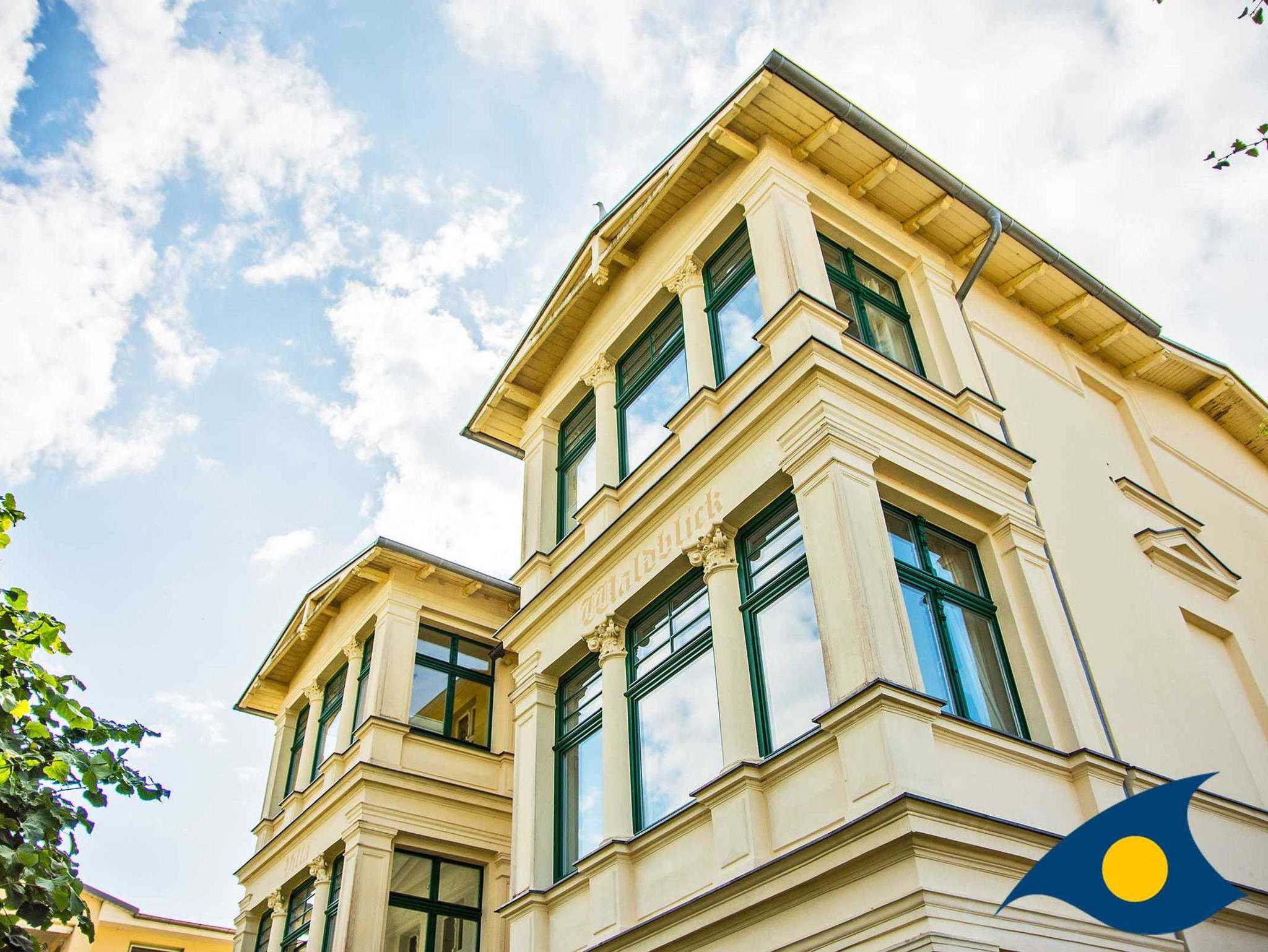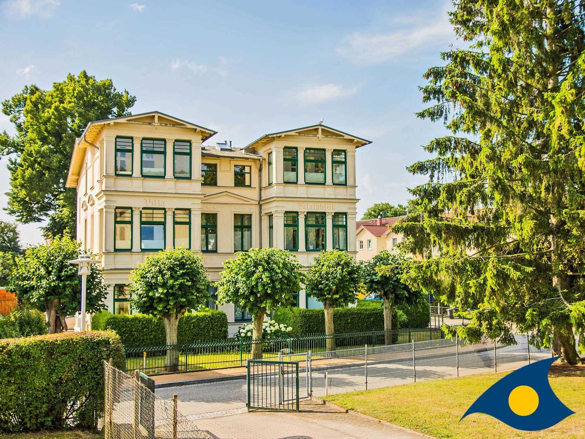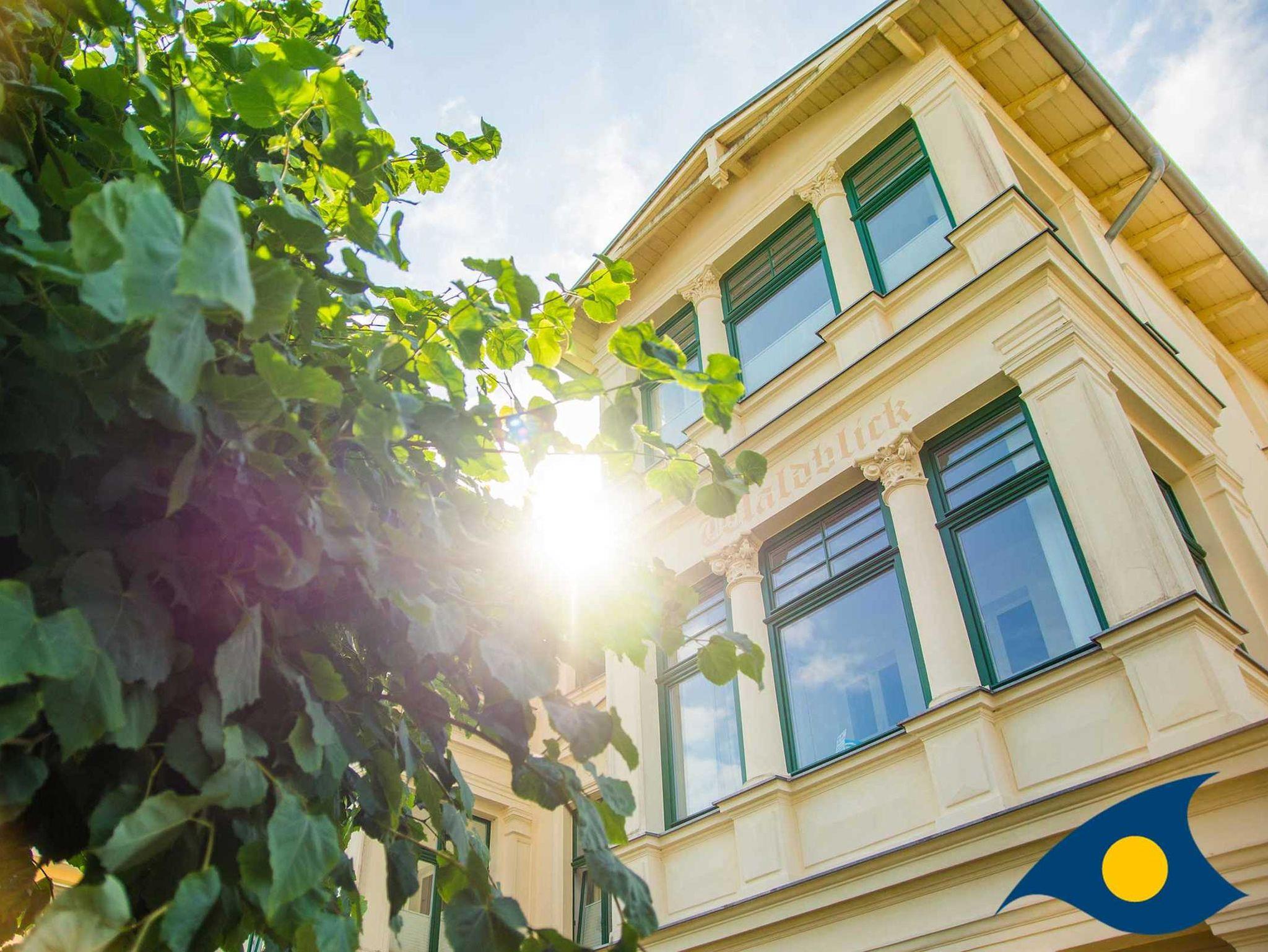 Die Villa Waldblick besticht durch ihre originalgetreu sanierte Fassade im Bäderstil. Fast alle Balkone sind nach Süden ausgerichtet, die Wohnungen sind hell und sonnig, kein Baumbestand verdunkelt die Räume. Die Appartements wurden stilgerecht, liebevoll und hochwertig eingerichtet. Kleine Accessoires sorgen für individuelle Gemütlichkeit. Großzügige Landhausküchen mit Essecken laden in einigen Wohnungen zum Beisammensein ein. Der Grillplatz im Garten kann von allen Mietern genutzt werden. Zu jeder Wohnung gehört ein kostenloser PKW-Stellplatz.