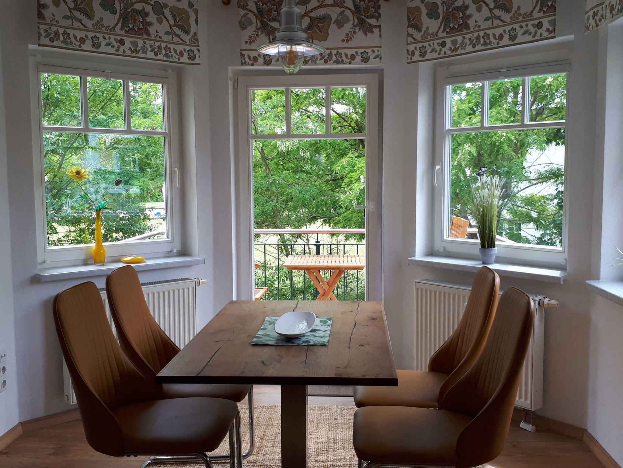 Vom Essbereich geht es direkt auf den kleinen Balkon mit 2 Gartenstühlen und Tisch (und weitere 2 einfache Klappstühle sind vorhanden).