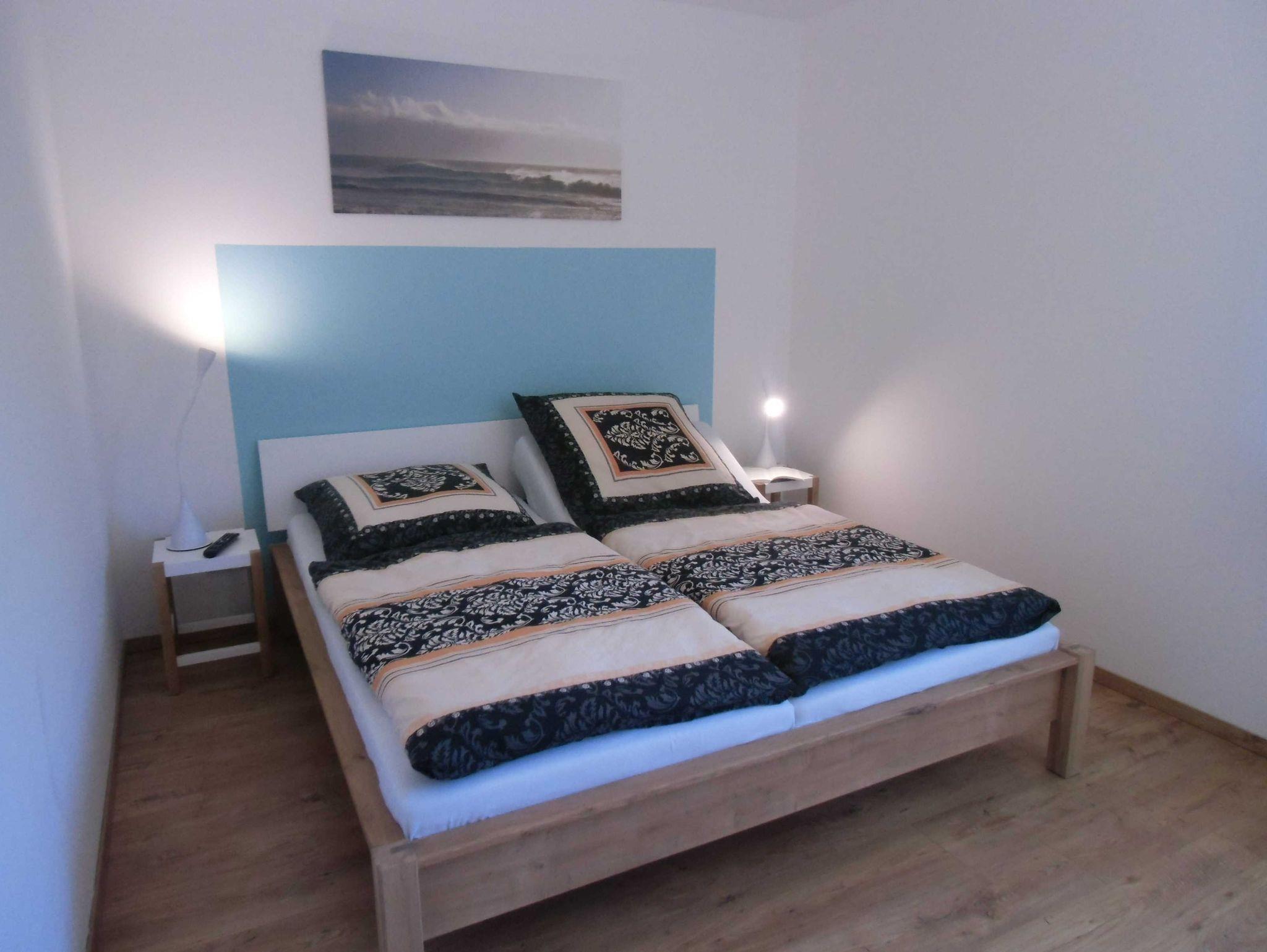 Das Schlafzimmer ist mit einem Doppelbett (Kopfteil klappbar, 2,00 m x 1,90 m) und einem viertürigen Schrank mit ausreichend Stauraum ausgestattet. Das Doppelfenster hat eine Insektengaze. Ein zweites TV Gerät kann hier ebenfalls genutzt werden.