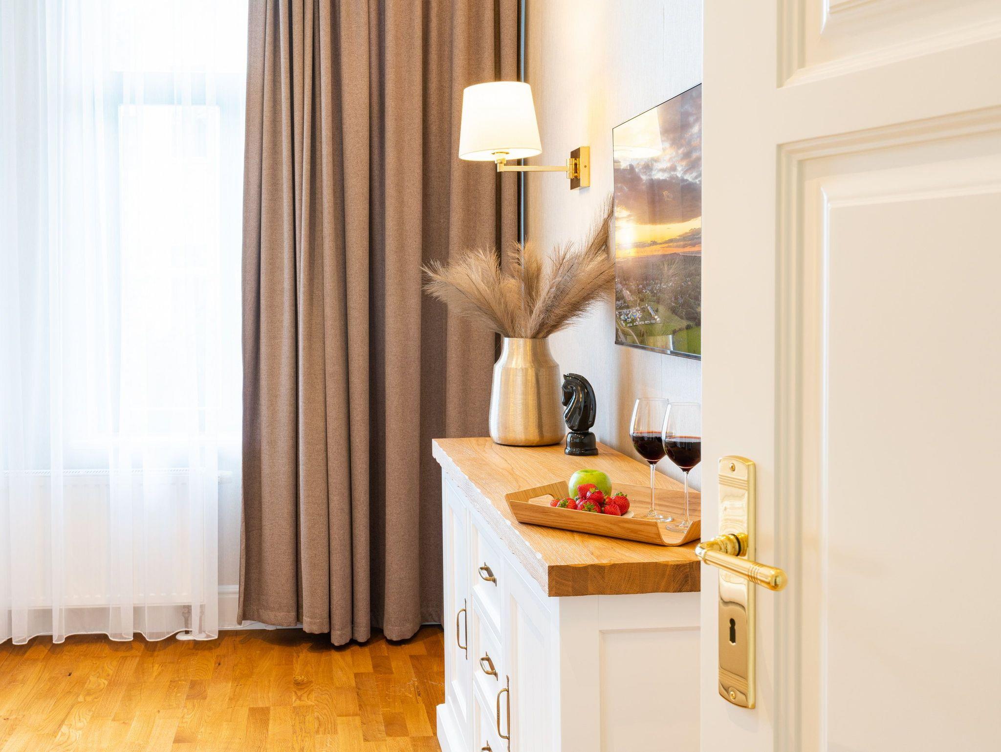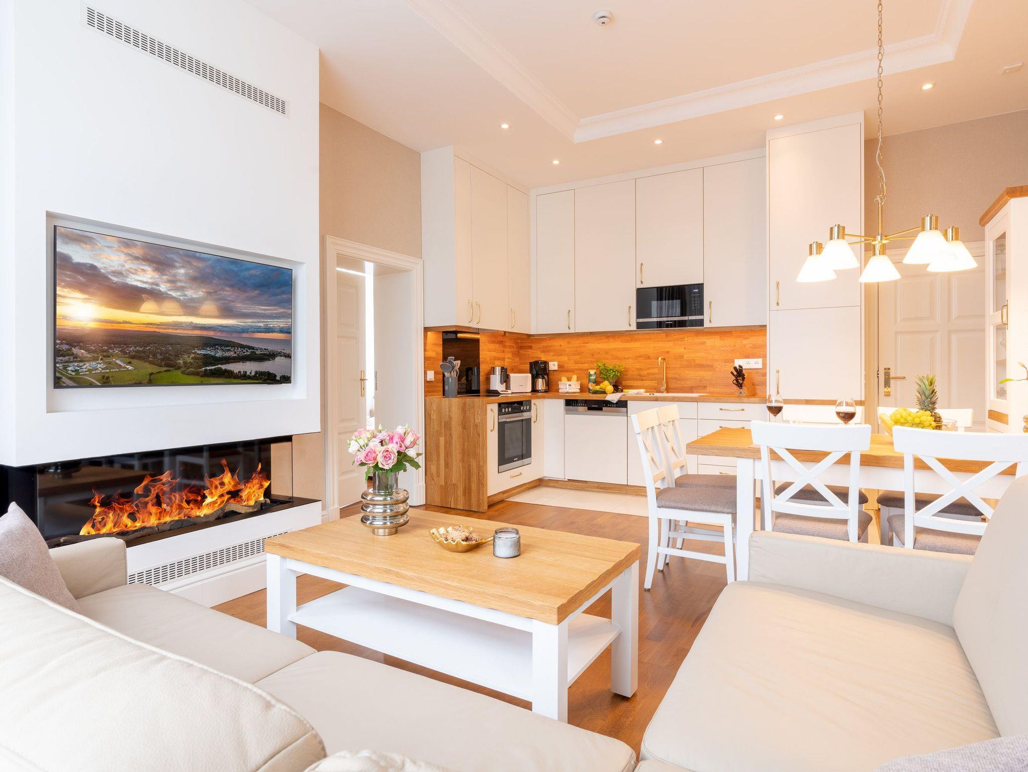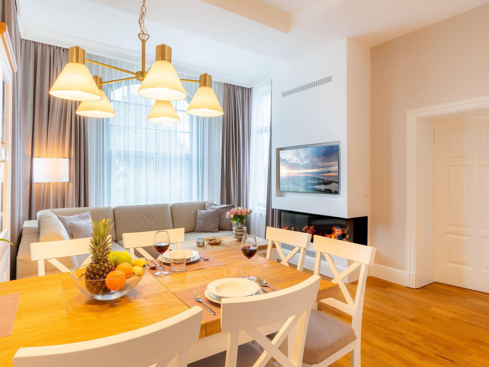 Ein großzügiger Wohnbereich mit einem exklusiven Gaskamin erwartet Sie bereits, sodass Sie eine angenehme Wohlfühlatmosphäre das gesamte Jahr über genießen. Eine bequeme Couchgarnitur und ein Flat-TV runden den Komfort perfekt ab und laden zum Entspannen und Füße hochlegen ein. Das helle Drei-Zimmer-Appartement hat eine Größe von 60 Quadratmetern und liegt im Hochparterre der Villa Waldschloss. Die vollausgestattete Küche, welche speziell von einem einheimischen Tischler angefertigt wurde, ergänzt die Annehmlichkeiten dieses neuen Appartements mit allen Raffinessen: Backofen, Mikrowelle, Kühlschrank mit Gefrierfach, Toaster, Wasserkocher, Kaffeemaschine sowie einem Essplatz für 5 Personen mit Blick in den gegenüberliegenden Park.