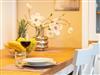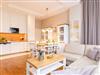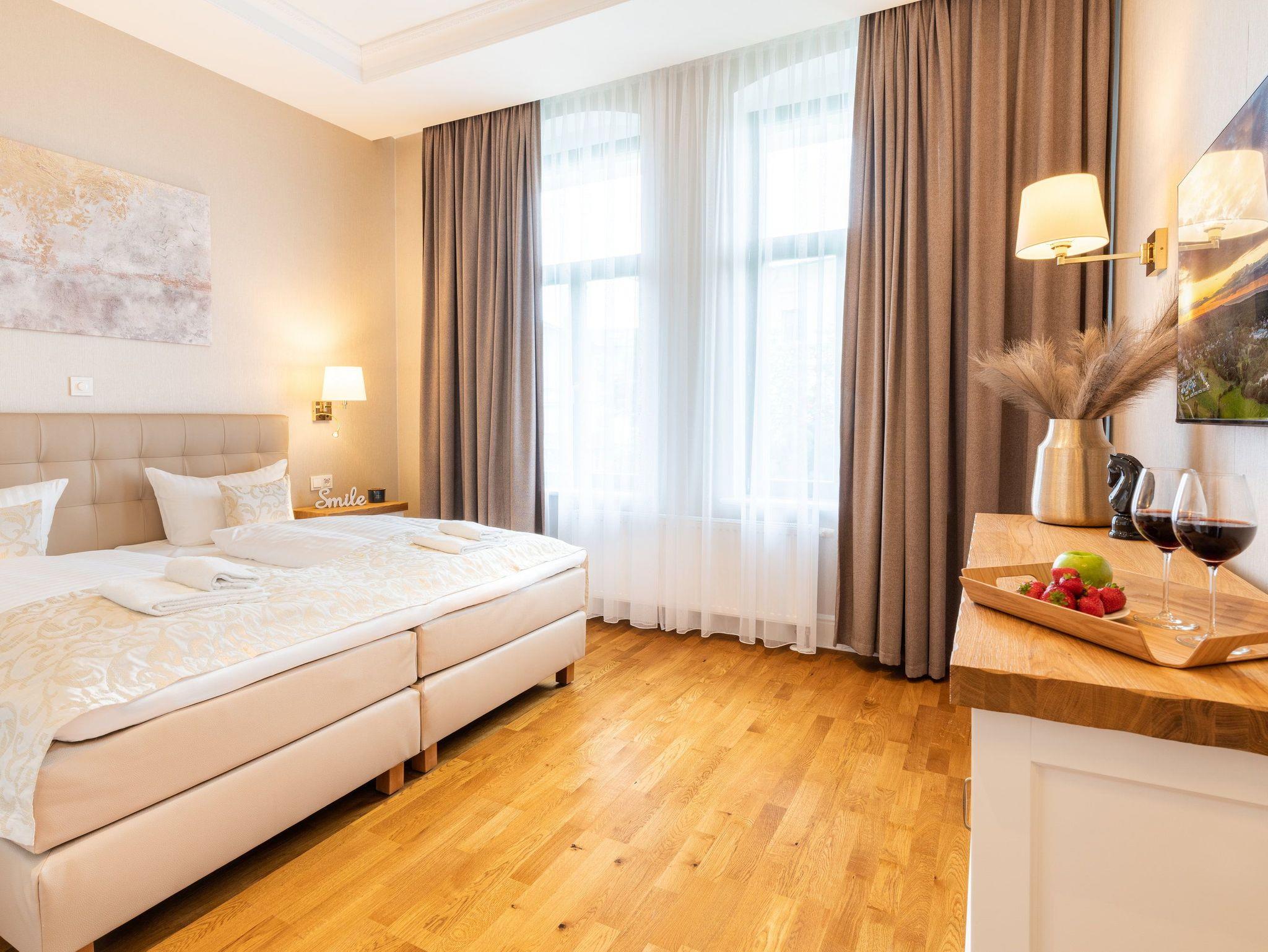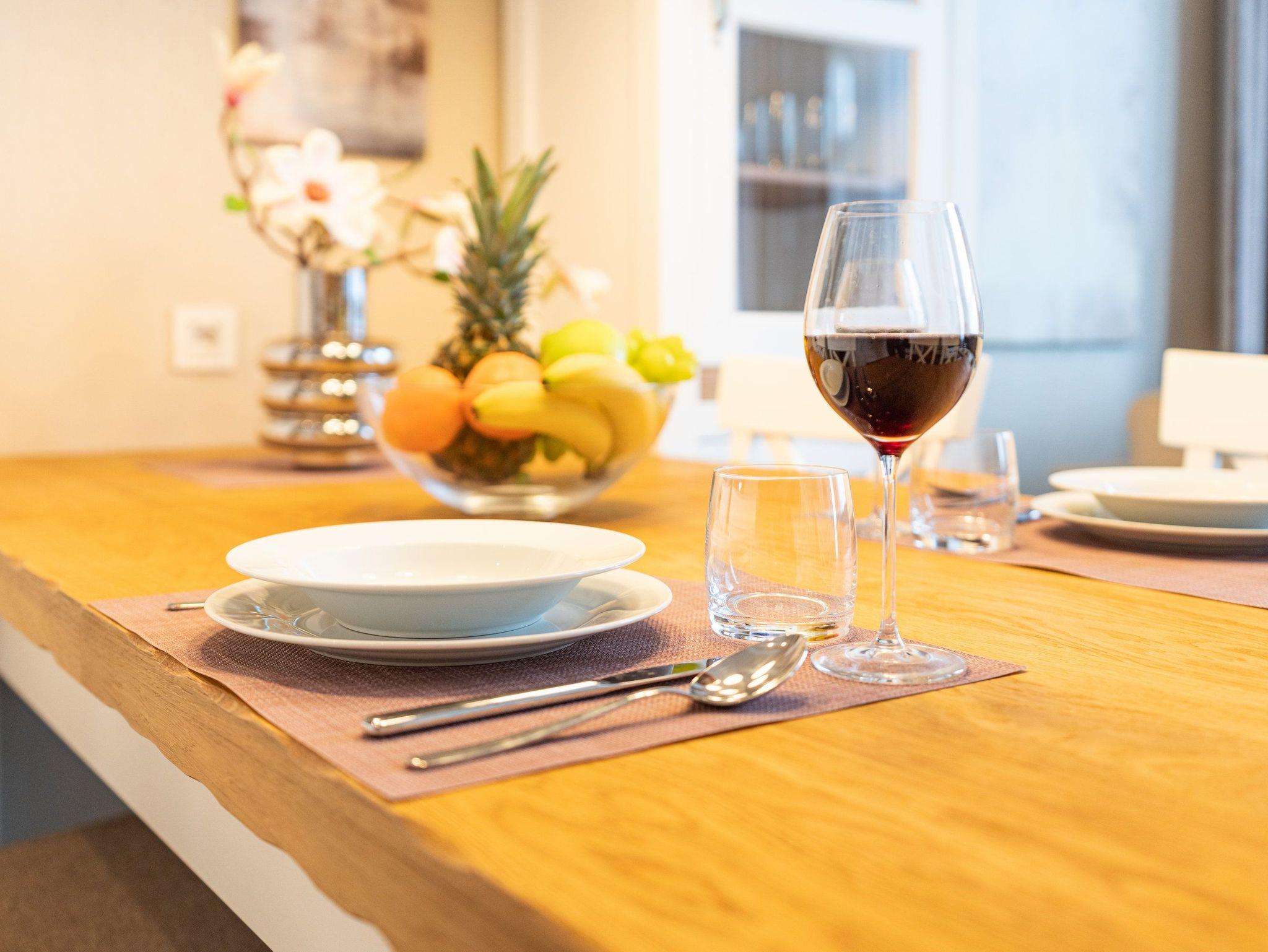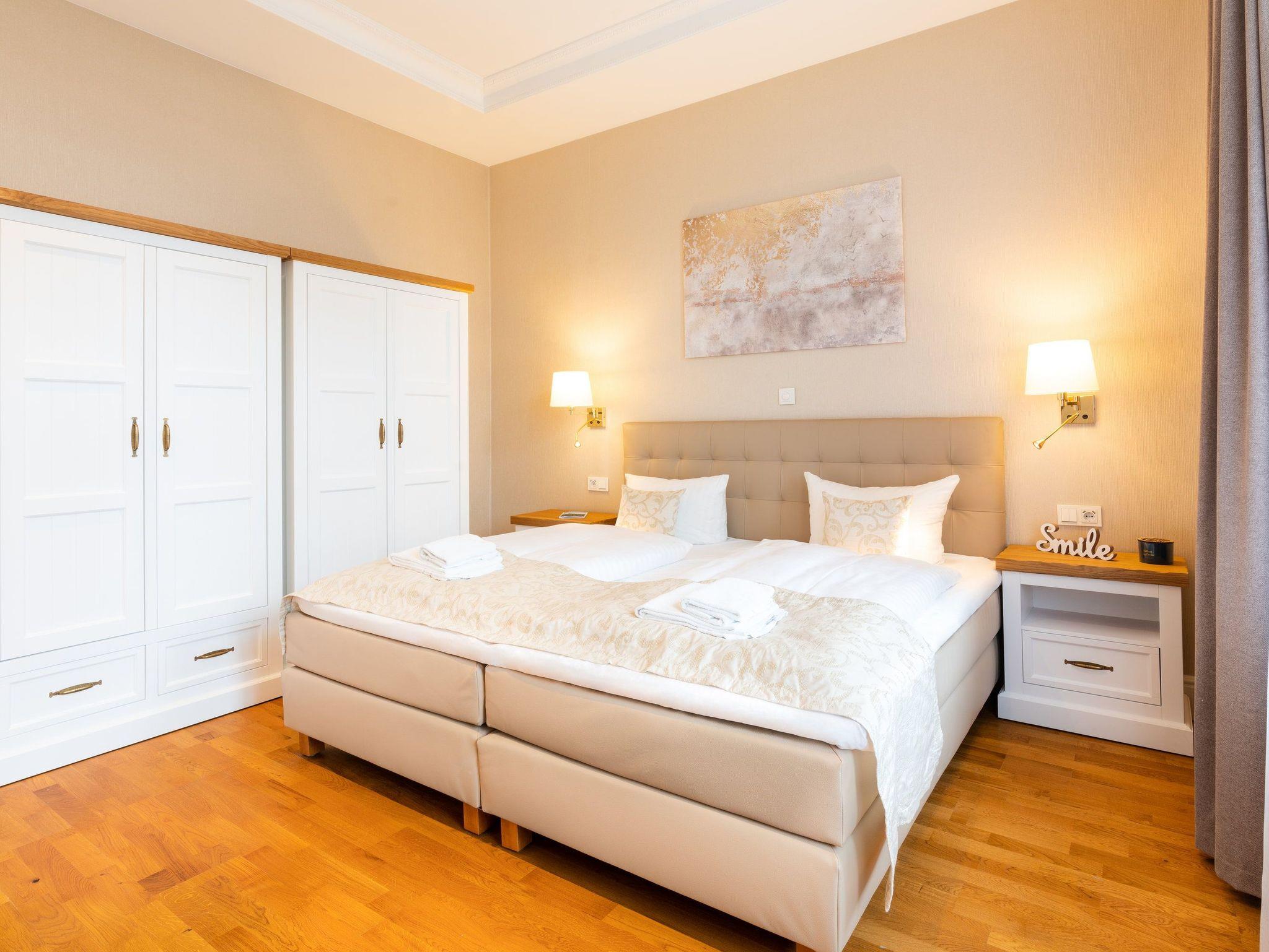 Ein großzügiger Wohnbereich mit einem exklusiven Gaskamin erwartet Sie bereits, sodass Sie eine angenehme Wohlfühlatmosphäre das gesamte Jahr über genießen. Eine bequeme Couchgarnitur und ein Flat-TV runden den Komfort perfekt ab und laden zum Entspannen und Füße hochlegen ein. Das helle Drei-Zimmer-Appartement hat eine Größe von 60 Quadratmetern und liegt im Hochparterre der Villa Waldschloss. Die vollausgestattete Küche, welche speziell von einem einheimischen Tischler angefertigt wurde, ergänzt die Annehmlichkeiten dieses neuen Appartements mit allen Raffinessen: Backofen, Mikrowelle, Kühlschrank mit Gefrierfach, Toaster, Wasserkocher, Kaffeemaschine sowie einem Essplatz für 5 Personen mit Blick in den gegenüberliegenden Park.