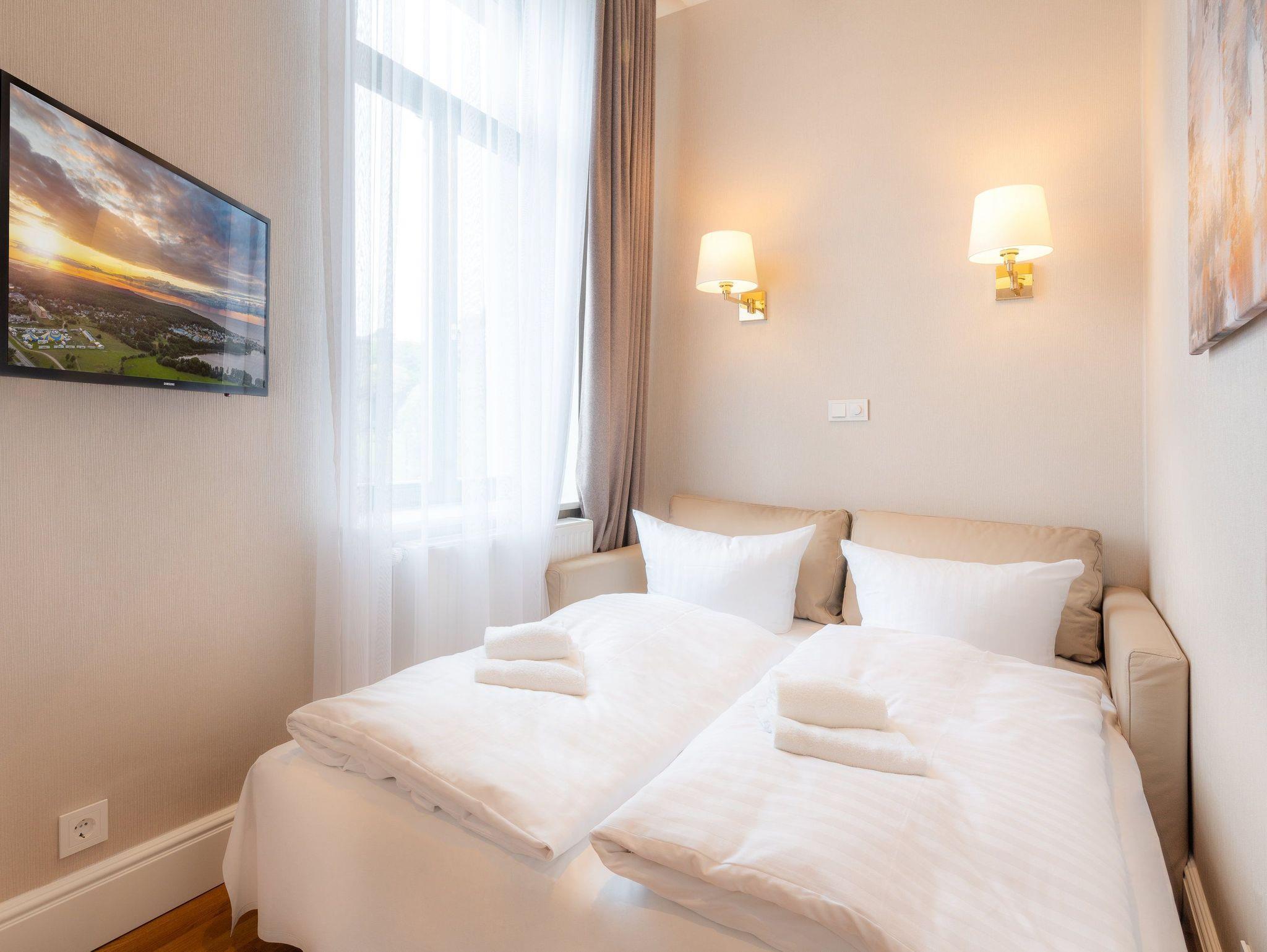 Echtholzparkett im Wohn- und Schlafraum, unkaputtbare Tapeten aus Amerika. Bei der Umgestaltung wurde nichts dem Zufall überlassen. Die fünf Schlafplätze verteilen sich auf zwei Schlafzimmer sowie der Schlafcouch im Wohnbereich, welche sich im Handumdrehen für einen Gast als Schlafmöglichkeit umfunktionieren lässt. Das erste Schlafzimmer lädt mit einem bequemen und zugleich hochwertigem Boxspringbett (200 x 200cm / zwei getrennte Matratze) zur Nachtruhe ein, das zweite Schlafzimmer mit einer hochwertigen Schlafcouch, welche sich im Handumdrehen für zwei Gäste als Schlafstätte umfunktionieren lässt. Lassen Sie hier den Tag ausklingen oder genießen Ihre Lieblingsserie vor dem TV. Ein Kleiderschrank zum Verstauen Ihrer Habseligkeiten während Ihrer Urlaubszeit steht für Sie bereit.