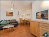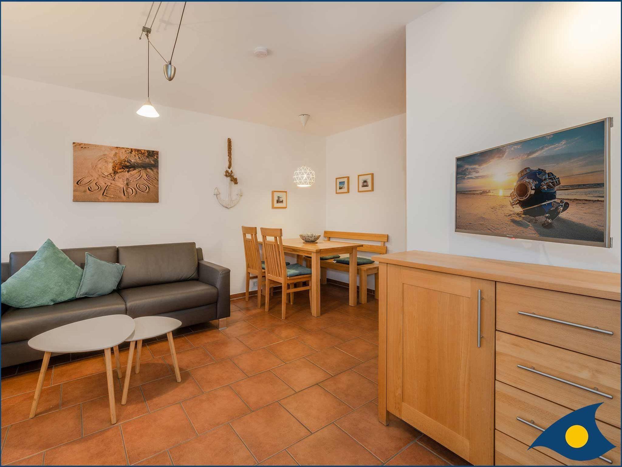 Der Wohn-/Essbereich verfügt über einen Fernseher und eine Stereo-Anlage. Die Terrasse ist mit Sitzmöbeln und Blick zum Schloonsee ausgestattet. Das Schlafzimmer ist mit einem Doppelbett (1,80 m breit), einem Fernseher, Schrank, Bank und einem stummen Diener ausgestattet.