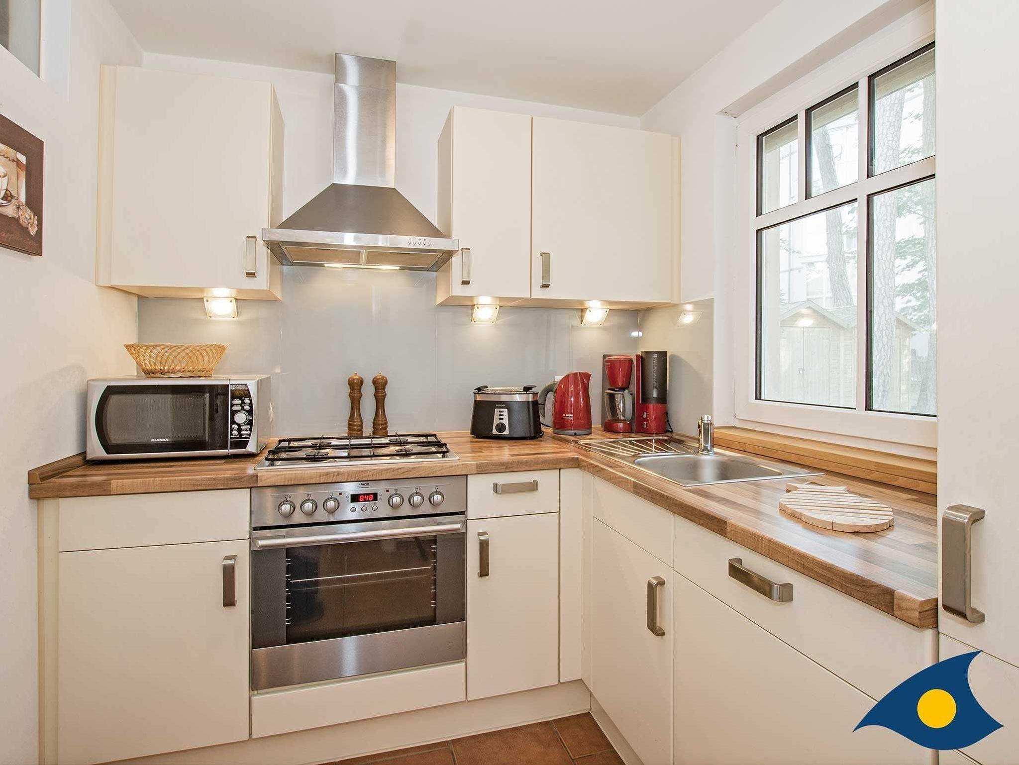 Die komplett ausgestattete Küche verfügt über einen 4-Platten-Gasherd, Backofen, Spülmaschine, Mikrowelle, Kühlschrank mit Tiefkühlfach. Das Bad ist mit Dusche und WC sowie Waschbecken ausgestattet.