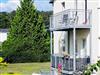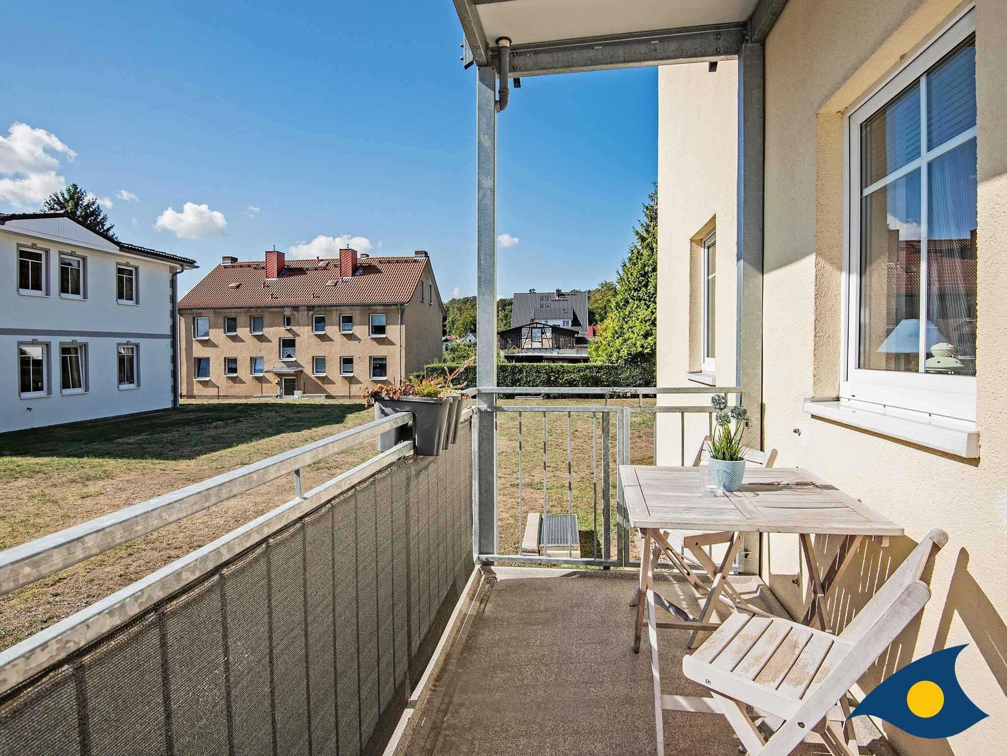 Ein sonniger Balkon mit einer grünen Wiese im Vordergrund lädt Sie zum Verweilen ein.
