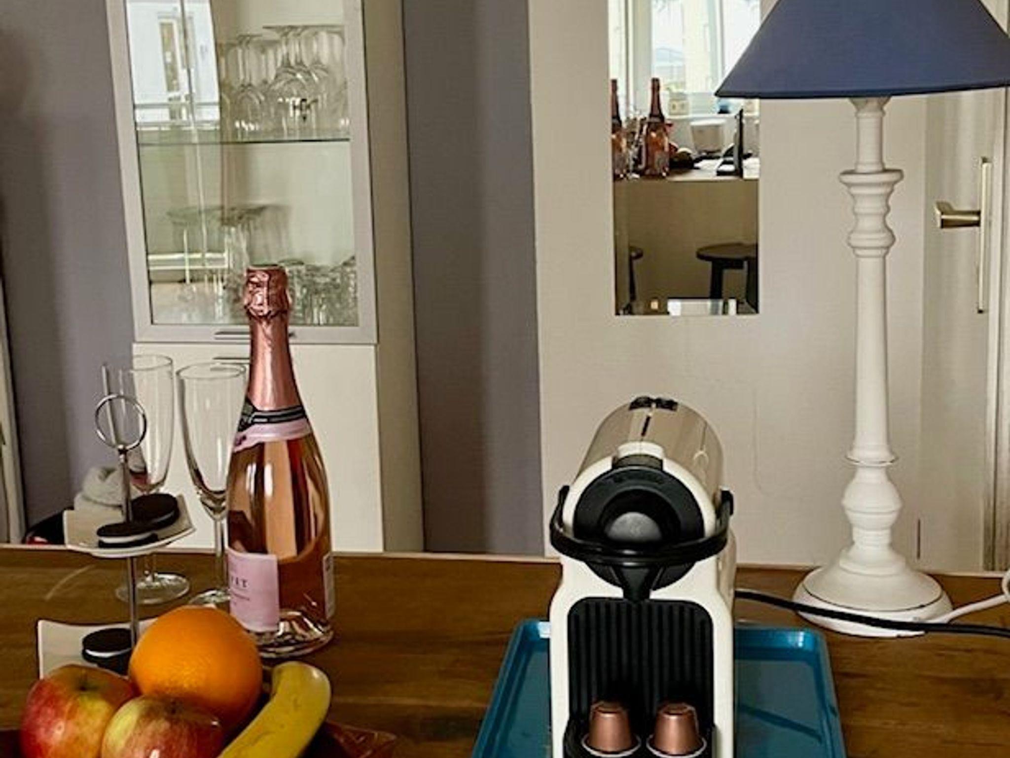 Die Küche ist mit einer Spülmaschine sowie einem Herd mit Ceranfeld und Backofen ausgestattet. Für einen schwungvollen Start in den Morgen steht Ihnen eine Nespressomaschine zur Verfügung.