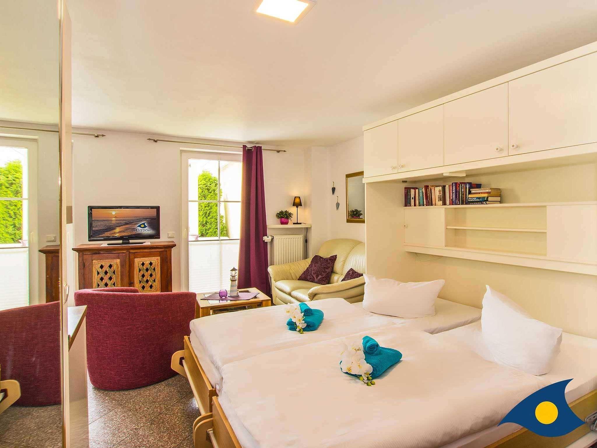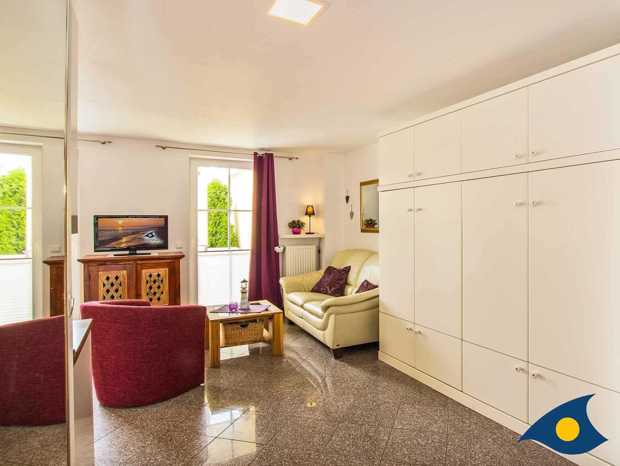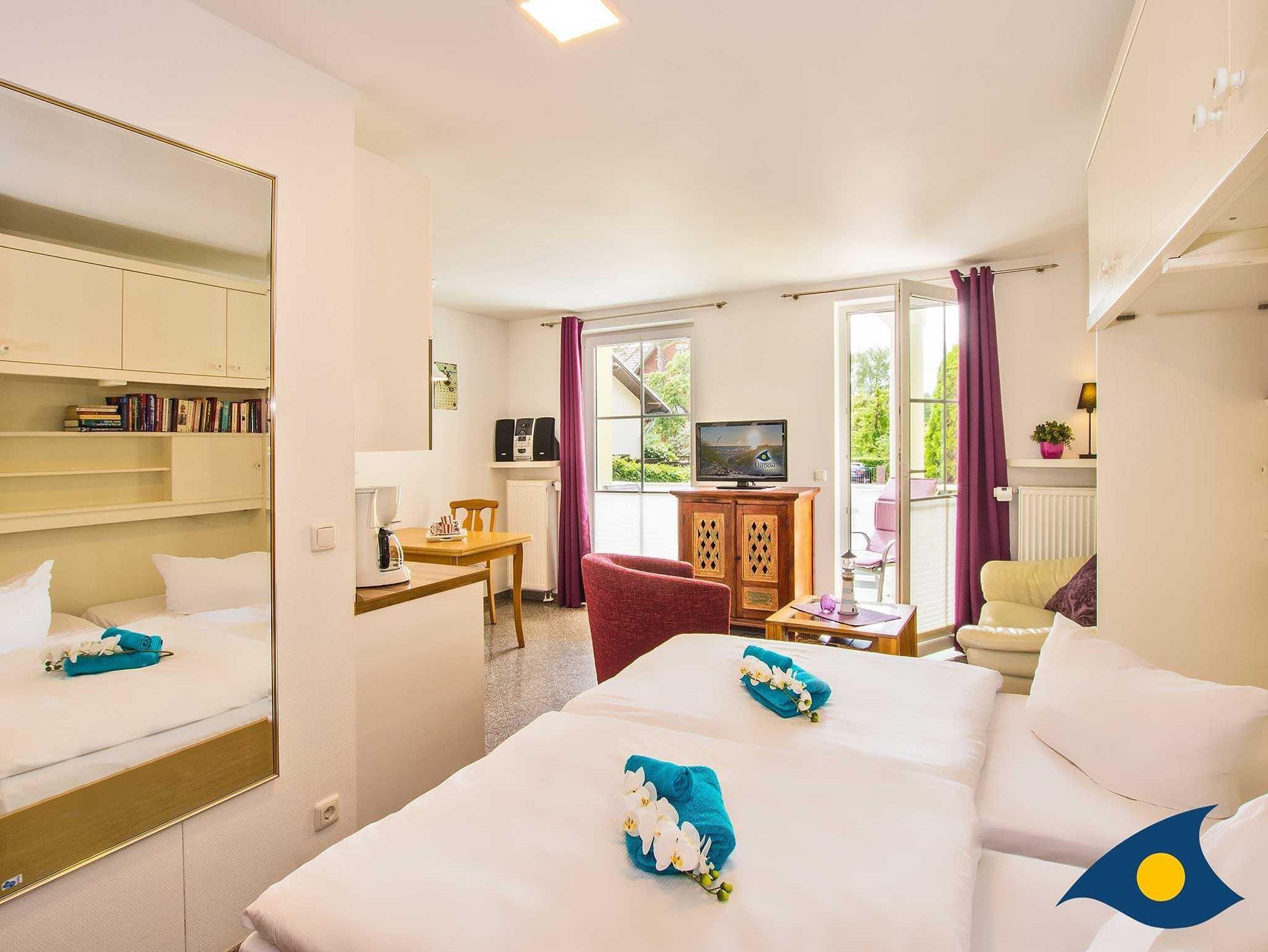 Mit seinen 30 Quadratmetern Wohnfläche bietet das Appartement Platz für zwei Personen und ein Kleinkind bis drei Jahre. Ein Kinderreisebett können Sie gerne mitbringen oder für einmalig 15 € bei uns ausleihen. In dem offenen Wohn-Schlafbereich mit Granitboden erwartet Sie ein gemütlicher Stil-Mix. Eine bequeme Ledersitzgruppe lädt zum Relaxen ein. Das bequeme Schrankbett (1,60 m x 2,00 m) sorgt für erholsamen Schlaf.