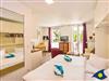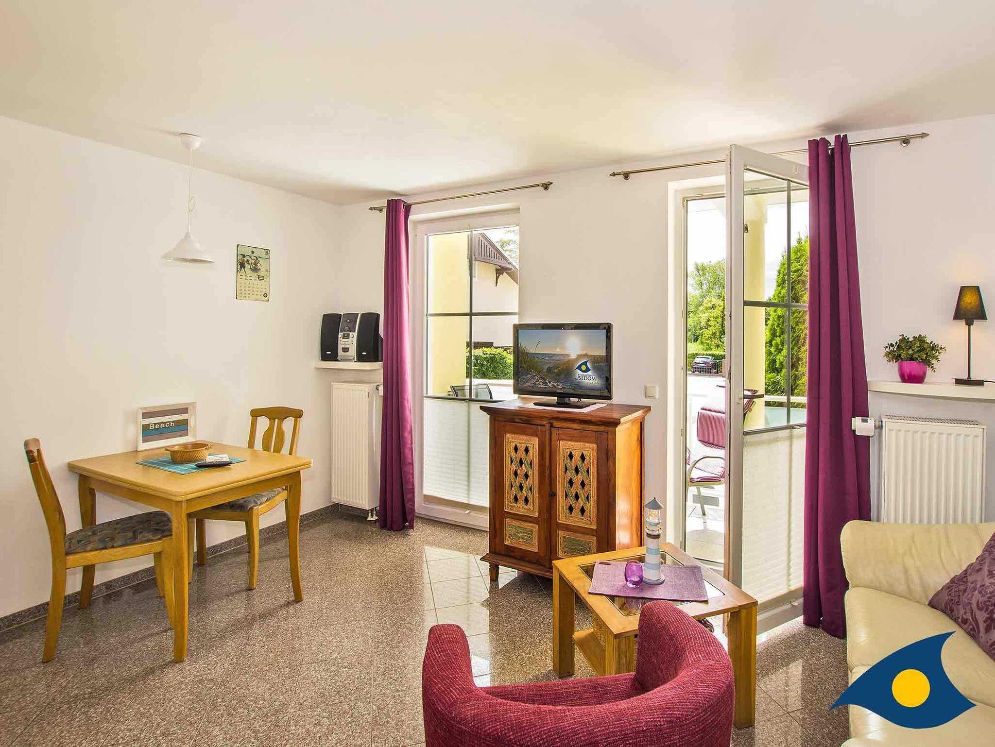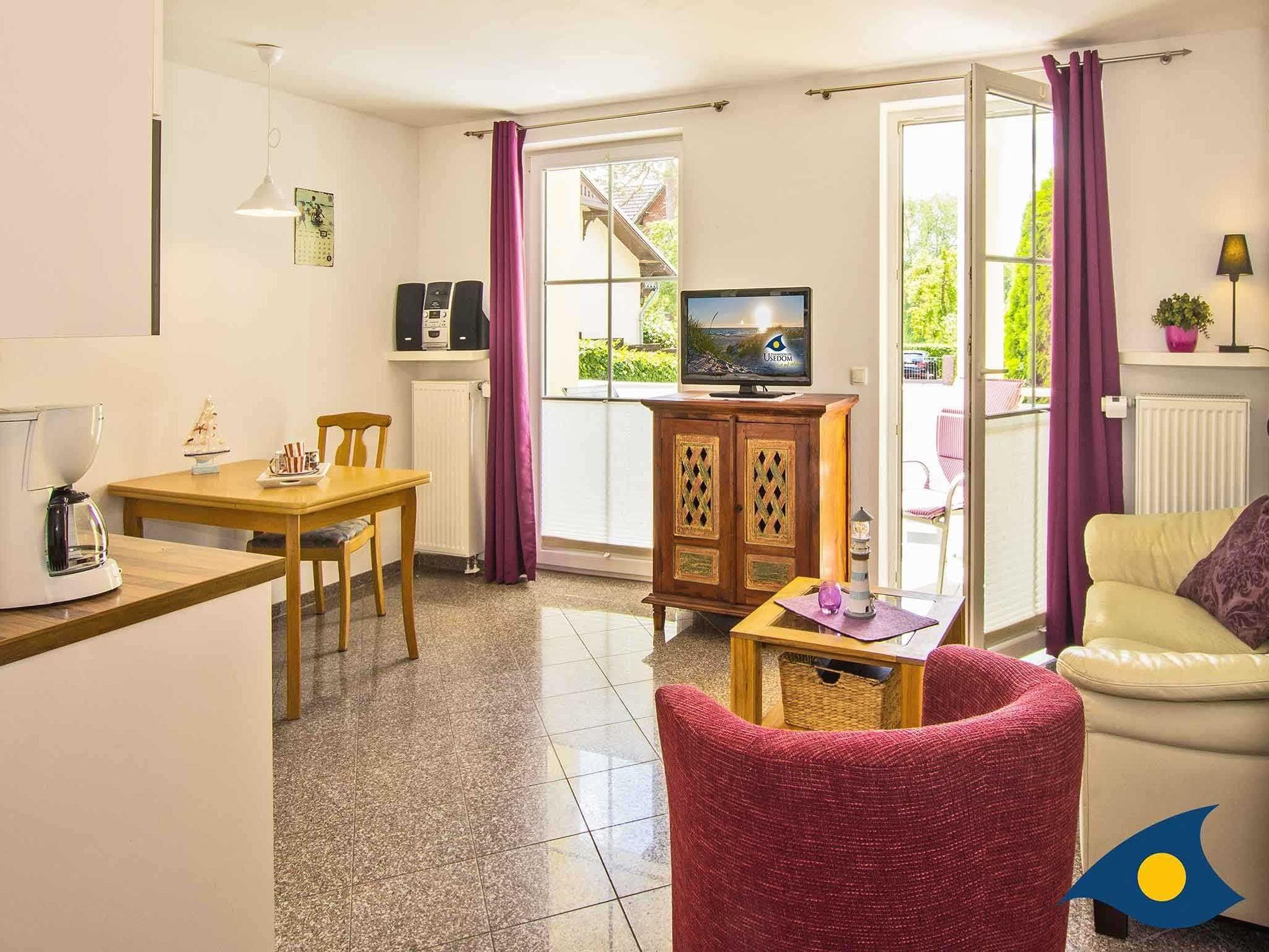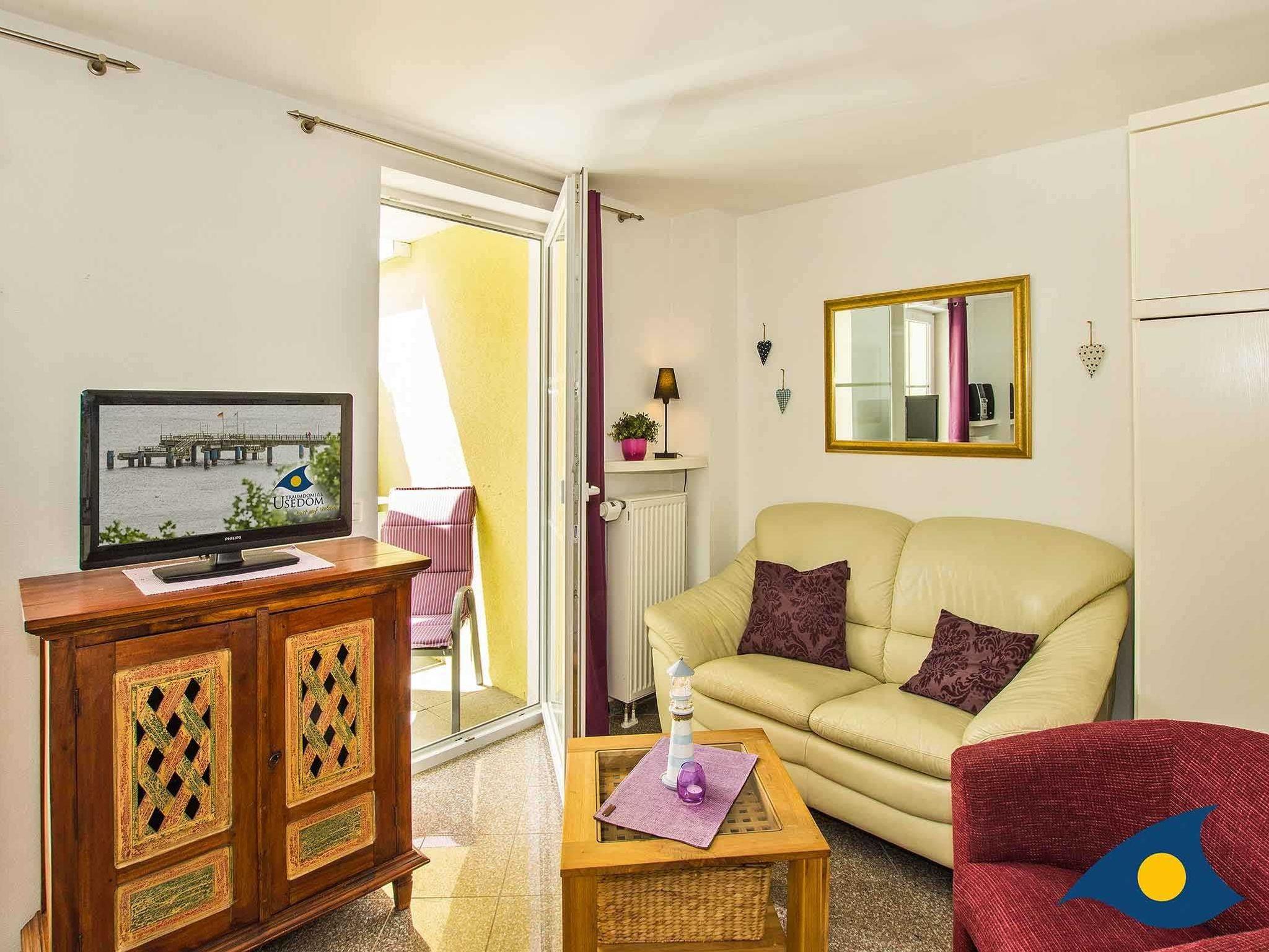 Mit seinen 30 Quadratmetern Wohnfläche bietet das Appartement Platz für zwei Personen und ein Kleinkind bis drei Jahre. Ein Kinderreisebett können Sie gerne mitbringen oder für einmalig 15 € bei uns ausleihen. In dem offenen Wohn-Schlafbereich mit Granitboden erwartet Sie ein gemütlicher Stil-Mix. Eine bequeme Ledersitzgruppe lädt zum Relaxen ein. Das bequeme Schrankbett (1,60 m x 2,00 m) sorgt für erholsamen Schlaf.