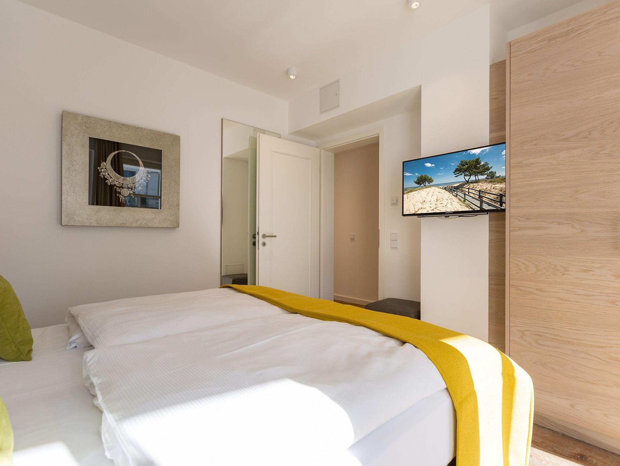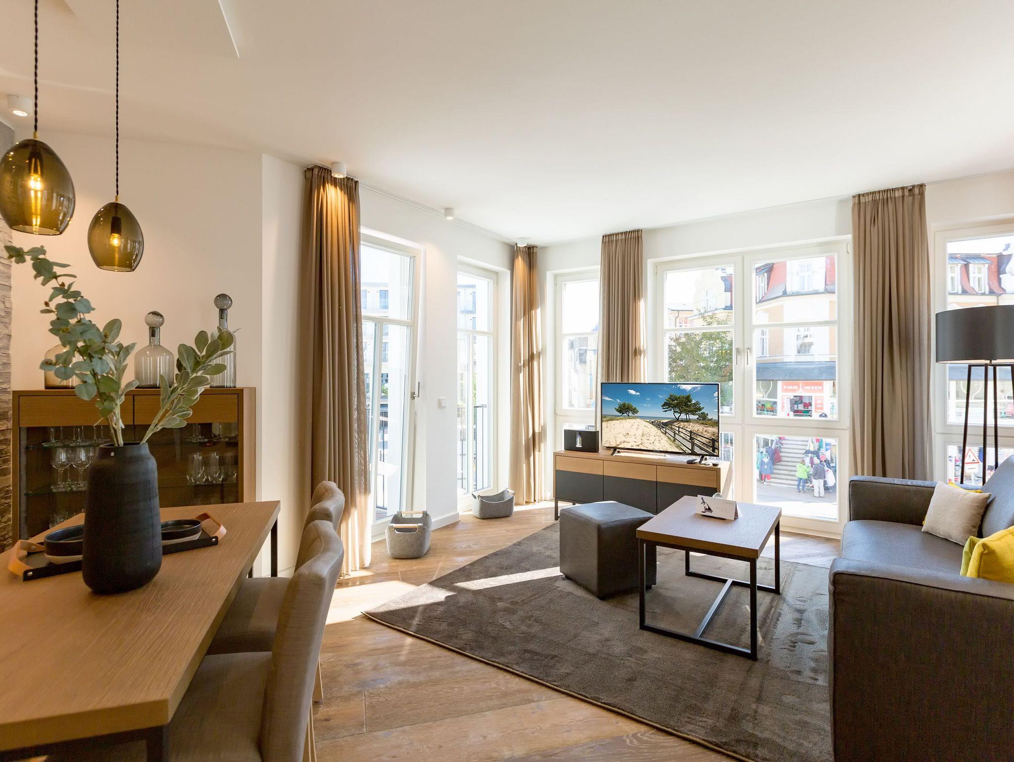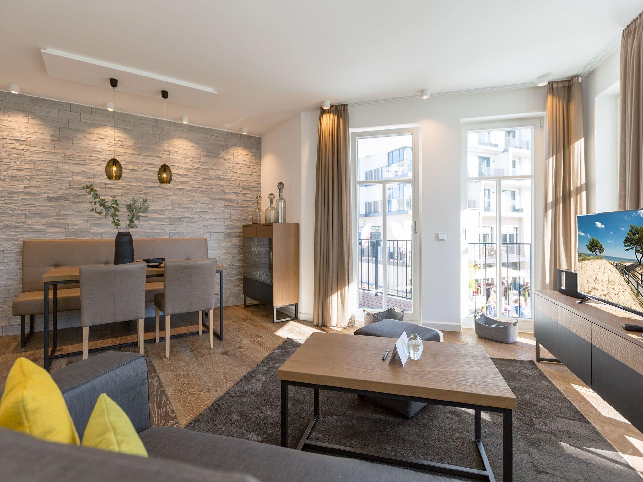 Zwei Balkone, zwei Schlafzimmer, zwei Bäder und ein großzügiges Wohnzimmer ? Schon beim Eintreten sagt die Seele: Hier will ich verweilen und zur Ruhe kommen. In diesem modernen und wunderschön eingerichteten Drei-Zimmer-Appartement in der 1. Etage empfängt Sie auf 69 Quadratmetern ein echtes Wohlfühlreich. Mitten im Herzen des quirligen Seebades mit Blick auf die alten Bädervillen der berühmten Bansiner Bergstraße und die Einkaufsstraße können Sie hier mit bis zu vier Personen, einem Kleinkind (bis drei Jahre im Kinderreisebett) und Ihrem Hund urlauben, entspannen und die Ostsee genießen. Die liegt nämlich direkt vor der Haustür. Treten Sie hinaus auf einen der beiden Balkone (8 und 9 Quadratmeter groß) und lauschen Sie dem Rauschen der Wellen, während Ihnen die Morgensonne oder die Nachmittagssonne wärmend ins Gesicht scheint. Vom Wohnzimmer aus haben Sie zu beiden Balkonen Zugang. Bodentiefe Fenster verleihen den Räumen eine lichte Leichtigkeit. Lassen Sie sich auf das gemütliche Sofa fallen oder plauschen Sie bei einem leckeren Essen am schönen Esstisch mit den bequemen Stühlen und der Sitzbank. Ein gläserner Gas-Kamin sorgt für wohlige Wärme und eine romantische Stimmung an ungemütlichen Tagen und Abenden. Gibt es etwas Entspannenderes als dem Spiel der Flammen zuzuschauen und sich dabei so richtig schön einzukuscheln? Mit dem großen Flat-TV und der Hifi-Anlage mit Bluetooth-Funktion können Sie das Wohnzimmer in ein Kino verwandeln. High-End finden Sie auch in der offenen Wohnküche. Sie ist mit hochwertigen Markengeräten wie Geschirrspüler oder Mikrowelle und edlem Geschirr voll ausgestattet. Schließlich soll es Ihnen an nichts fehlen. In den beiden Schlafzimmern erwartet Sie Schlafvergnügen vom Feinsten. In den Boxspringdoppelbetten (1,60 m x 2,00 m und 1,80 m x 2,00 m) werden Sie schlafen wie auf Wolken. Jedes der beiden Schlafzimmer verfügt außerdem über einen Flat-TV, einen geräumigen Schrank und einen Zugang zu einem Balkon. Vom Süd-Ost-Balkon aus haben Sie sogar Blick aufs Meer. In diesem Feriendomizil gibt es alles in doppelter Ausführung ? so auch das Bad. In beiden Bädern finden Sie eine Regendusche, ein Waschtisch mit beleuchtetem Spiegel und ein WC. Eine kleine Überraschung lädt Sie in einem der beiden Badezimmer noch zu einem zusätzlichen Entspannungserlebnis ein: eine eigene Finnische Sauna, die Sie kostenfrei nutzen können. Kostenfrei ist übrigens auch das WLAN sowie die Nutzung des Waschtrockners in der Küche. Bei Ihrer Anreise sind die Betten bezogen und Handtücher liegen für Sie bereit. In der modernen Tiefgarage ist für Sie der Stellplatz Nr. 5 im Doppelparker oben (max. Höhe 2,00 m, max. Länge 5,10 m, max. Breite 2,50 m, max. Last 2.600 kg) reserviert.