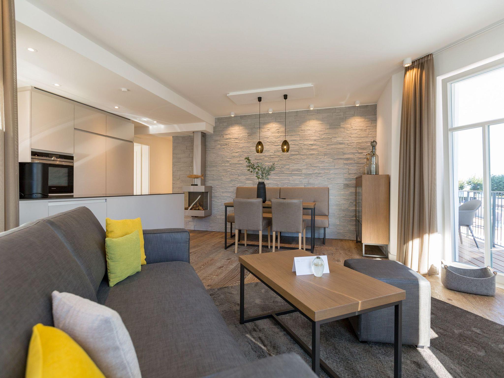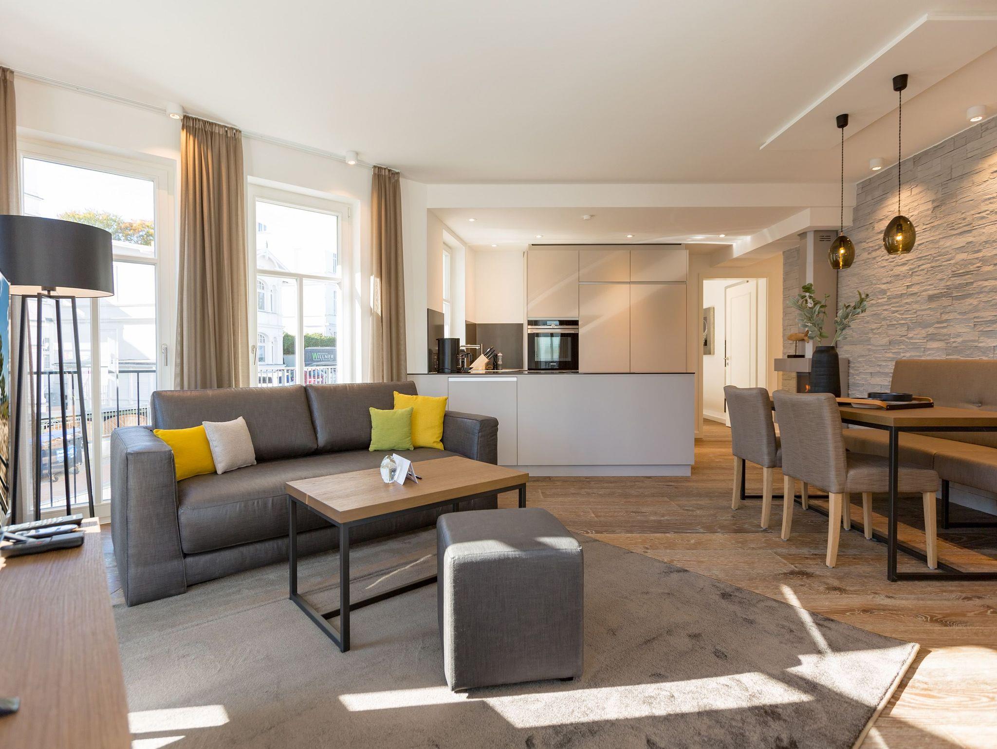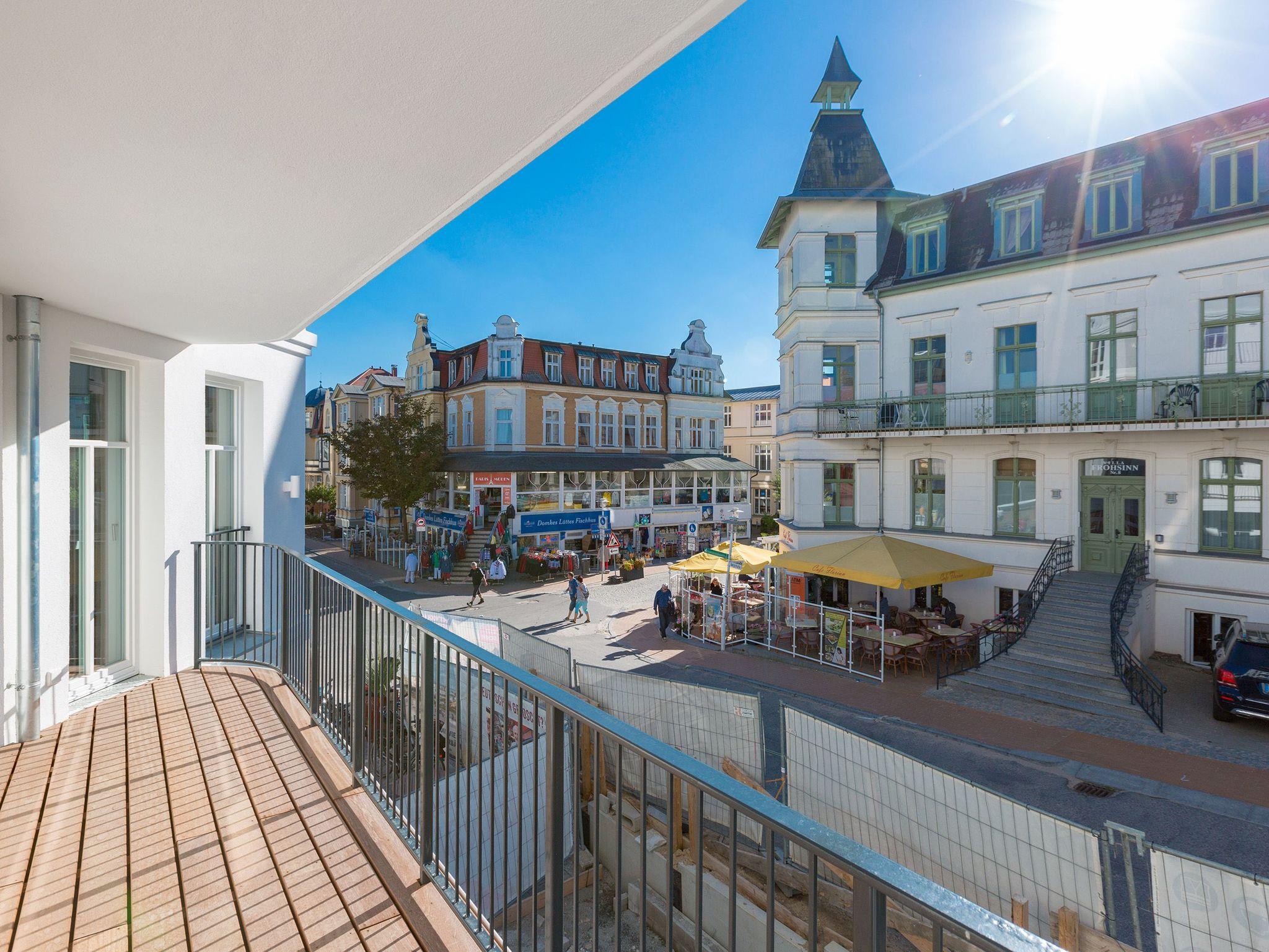Zwei Balkone, zwei Schlafzimmer, zwei Bäder und ein großzügiges Wohnzimmer ? Schon beim Eintreten sagt die Seele: Hier will ich verweilen und zur Ruhe kommen. In diesem modernen und wunderschön eingerichteten Drei-Zimmer-Appartement in der 1. Etage empfängt Sie auf 69 Quadratmetern ein echtes Wohlfühlreich. Mitten im Herzen des quirligen Seebades mit Blick auf die alten Bädervillen der berühmten Bansiner Bergstraße und die Einkaufsstraße können Sie hier mit bis zu vier Personen, einem Kleinkind (bis drei Jahre im Kinderreisebett) und Ihrem Hund urlauben, entspannen und die Ostsee genießen. Die liegt nämlich direkt vor der Haustür. Treten Sie hinaus auf einen der beiden Balkone (8 und 9 Quadratmeter groß) und lauschen Sie dem Rauschen der Wellen, während Ihnen die Morgensonne oder die Nachmittagssonne wärmend ins Gesicht scheint. Vom Wohnzimmer aus haben Sie zu beiden Balkonen Zugang. Bodentiefe Fenster verleihen den Räumen eine lichte Leichtigkeit. Lassen Sie sich auf das gemütliche Sofa fallen oder plauschen Sie bei einem leckeren Essen am schönen Esstisch mit den bequemen Stühlen und der Sitzbank. Ein gläserner Gas-Kamin sorgt für wohlige Wärme und eine romantische Stimmung an ungemütlichen Tagen und Abenden. Gibt es etwas Entspannenderes als dem Spiel der Flammen zuzuschauen und sich dabei so richtig schön einzukuscheln? Mit dem großen Flat-TV und der Hifi-Anlage mit Bluetooth-Funktion können Sie das Wohnzimmer in ein Kino verwandeln. High-End finden Sie auch in der offenen Wohnküche. Sie ist mit hochwertigen Markengeräten wie Geschirrspüler oder Mikrowelle und edlem Geschirr voll ausgestattet. Schließlich soll es Ihnen an nichts fehlen. In den beiden Schlafzimmern erwartet Sie Schlafvergnügen vom Feinsten. In den Boxspringdoppelbetten (1,60 m x 2,00 m und 1,80 m x 2,00 m) werden Sie schlafen wie auf Wolken. Jedes der beiden Schlafzimmer verfügt außerdem über einen Flat-TV, einen geräumigen Schrank und einen Zugang zu einem Balkon. Vom Süd-Ost-Balkon aus haben Sie sogar Blick aufs Meer. In diesem Feriendomizil gibt es alles in doppelter Ausführung ? so auch das Bad. In beiden Bädern finden Sie eine Regendusche, ein Waschtisch mit beleuchtetem Spiegel und ein WC. Eine kleine Überraschung lädt Sie in einem der beiden Badezimmer noch zu einem zusätzlichen Entspannungserlebnis ein: eine eigene Finnische Sauna, die Sie kostenfrei nutzen können. Kostenfrei ist übrigens auch das WLAN sowie die Nutzung des Waschtrockners in der Küche. Bei Ihrer Anreise sind die Betten bezogen und Handtücher liegen für Sie bereit. In der modernen Tiefgarage ist für Sie der Stellplatz Nr. 5 im Doppelparker oben (max. Höhe 2,00 m, max. Länge 5,10 m, max. Breite 2,50 m, max. Last 2.600 kg) reserviert.
