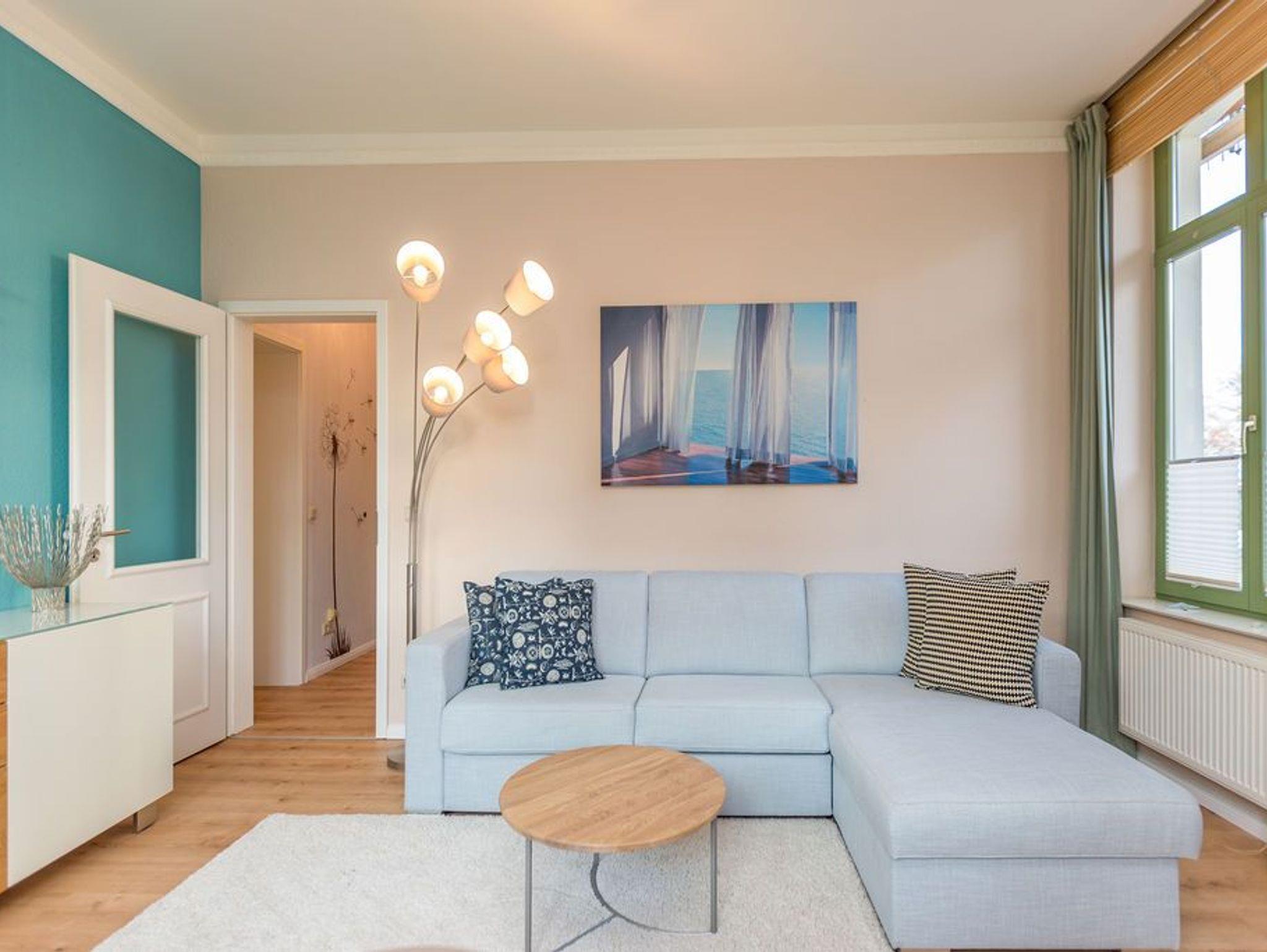 Die stilvolle 2-Raum-Ferienwohnung (50 qm) ist modern [&] sehr komfortabel eingerichtet und mit viel Liebe zum Detail dekoriert. Es verfügt über ein Wohnzimmer, eine komplett ausgestattete Küche (Ceranfeld, Backofen, Geschirrspüler, Mikrowelle), eine verglaste Veranda mit Blick zum Meer, ein Schlafzimmer mit Doppelbett und ein Duschbad. Für die 3. und 4. Person steht im Wohnzimmer eine bequeme Schlafcouch ( 1,50m x 2,00m) zur Verfügung.