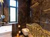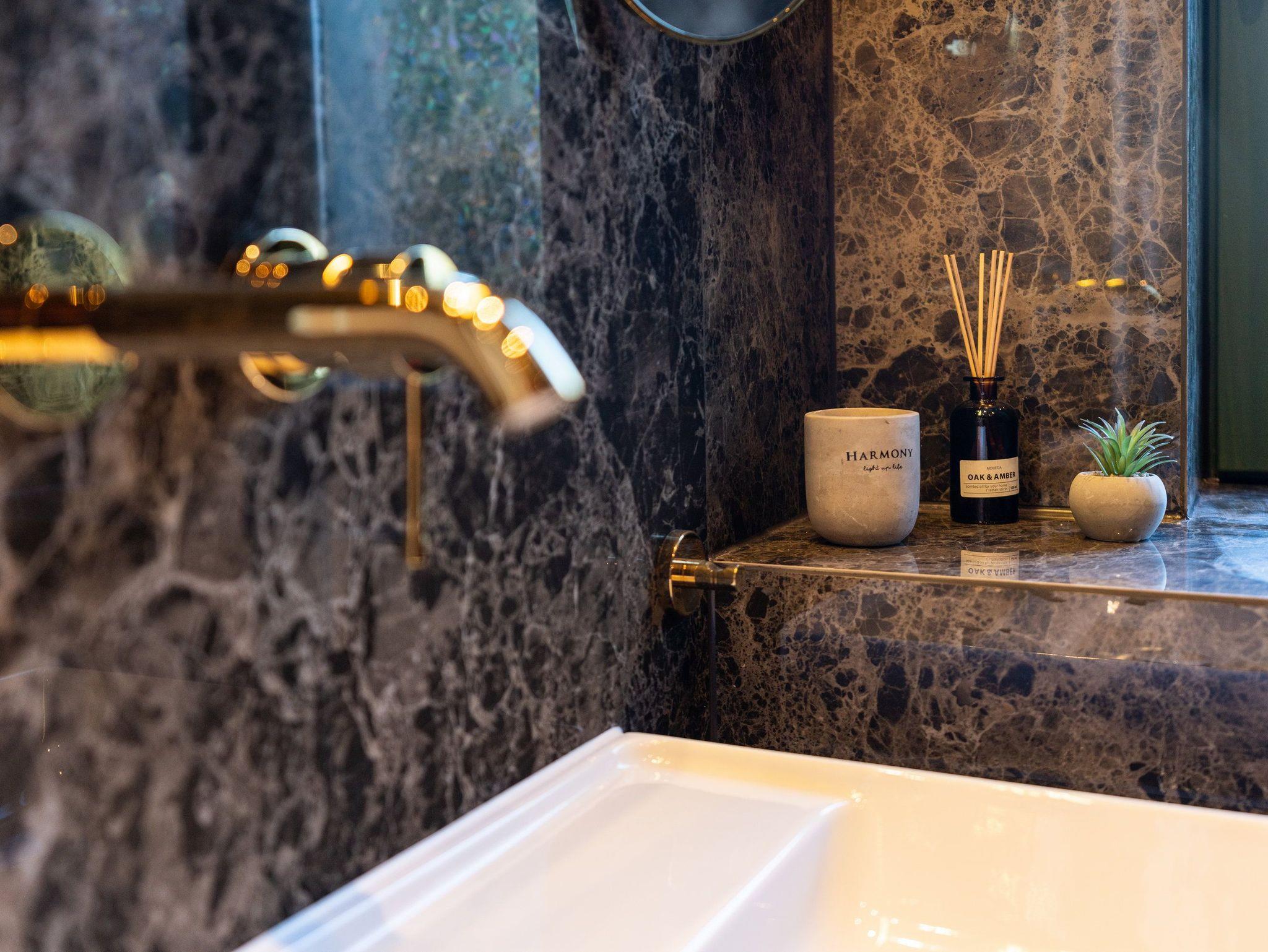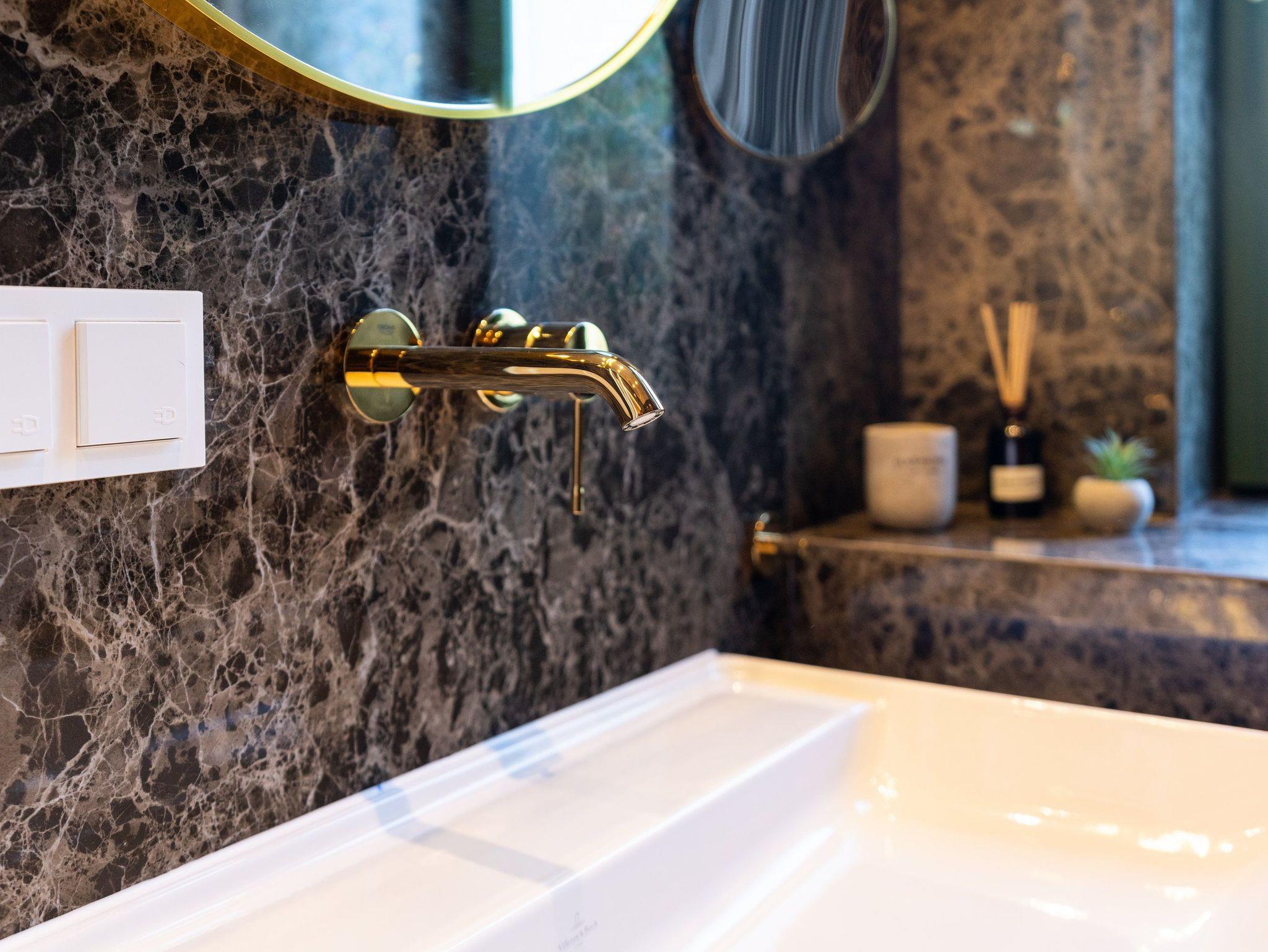 Das stilvoll gestaltete Badezimmer setzt Akzente durch großformatige dunkle Natursteinfliesen, helle Badkeramik sowie Armaturen und Accessoires in edlem Messing und ist mit einer bodengleichen Dusche ausgestattet für einen erholsamen Start in den Tag.
