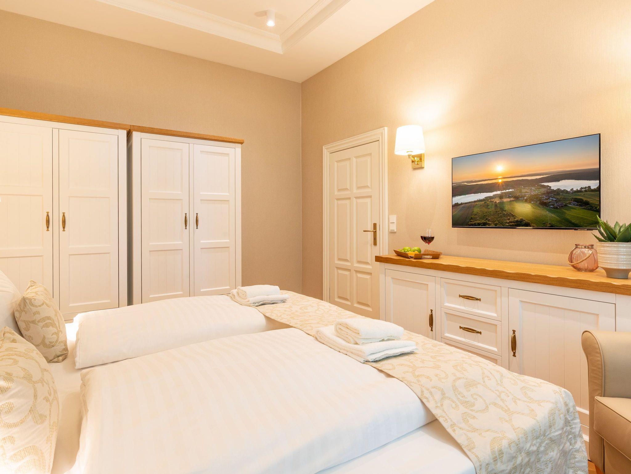 Die vier Schlafplätze verteilen sich auf ein Schlafzimmer mit einem hochwertigen Boxspringbett (200?x?200?cm, zwei getrennte Matratzen) und die Schlafcouch im Wohnbereich, die sich im Handumdrehen in eine komfortable Schlafgelegenheit für zwei Gäste verwandeln lässt. Ein geräumiger Kleiderschrank bietet ausreichend Stauraum für Ihre Habseligkeiten, sodass Sie sich sofort wie zuhause fühlen.