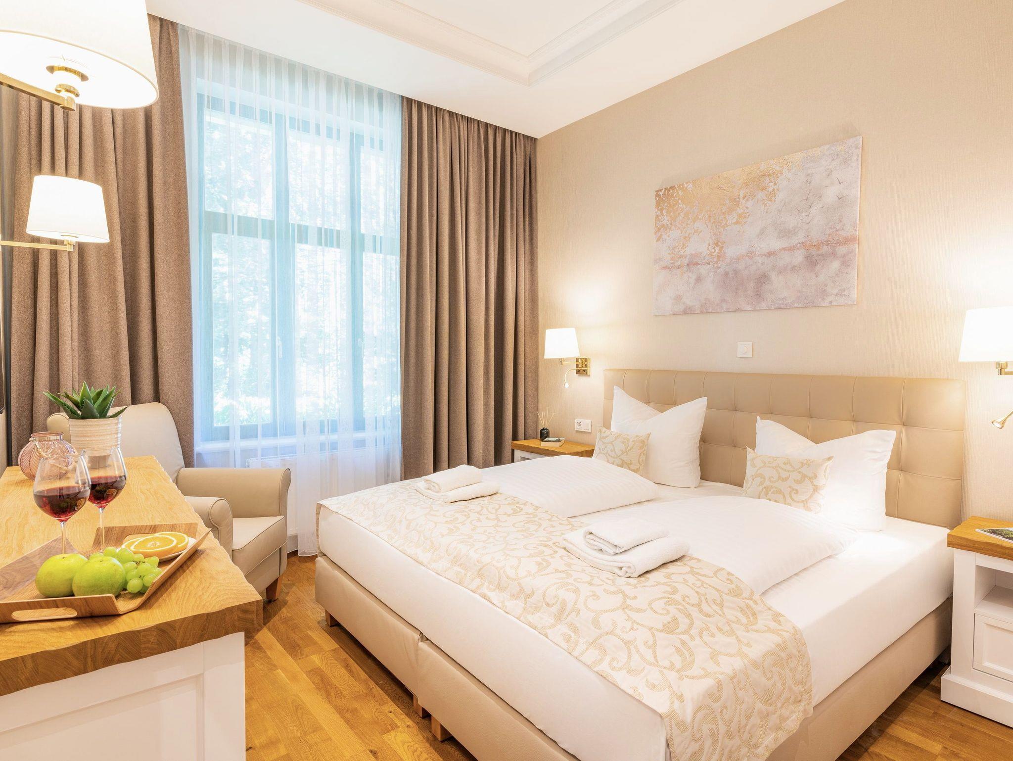 Der großzügige Wohnbereich mit exklusivem Gaskamin schafft eine gemütliche Wohlfühlatmosphäre, die zum Entspannen einlädt. Eine komfortable Couchgarnitur und ein Flat-TV runden das Ambiente ab ? perfekt, um nach einem Tag am Strand die Füße hochzulegen. Das helle Zwei-Zimmer-Appartement im Hochparterre der Villa Waldschloss umfasst 46?Quadratmeter und beeindruckt durch seine hochwertige Ausstattung.