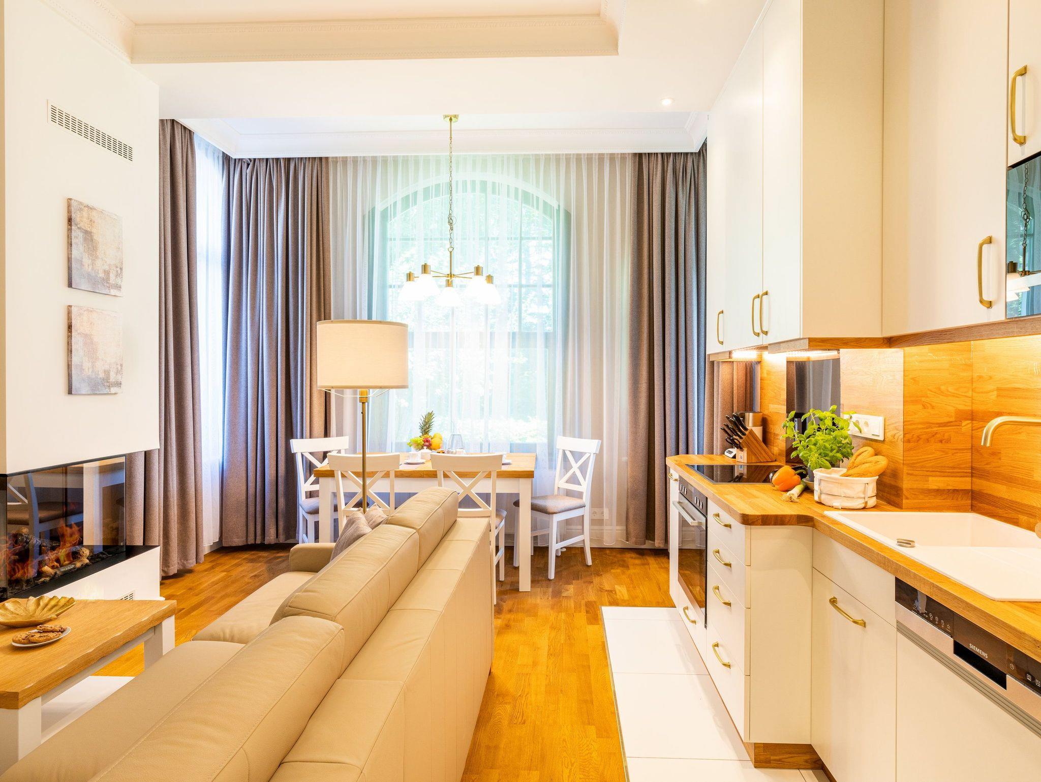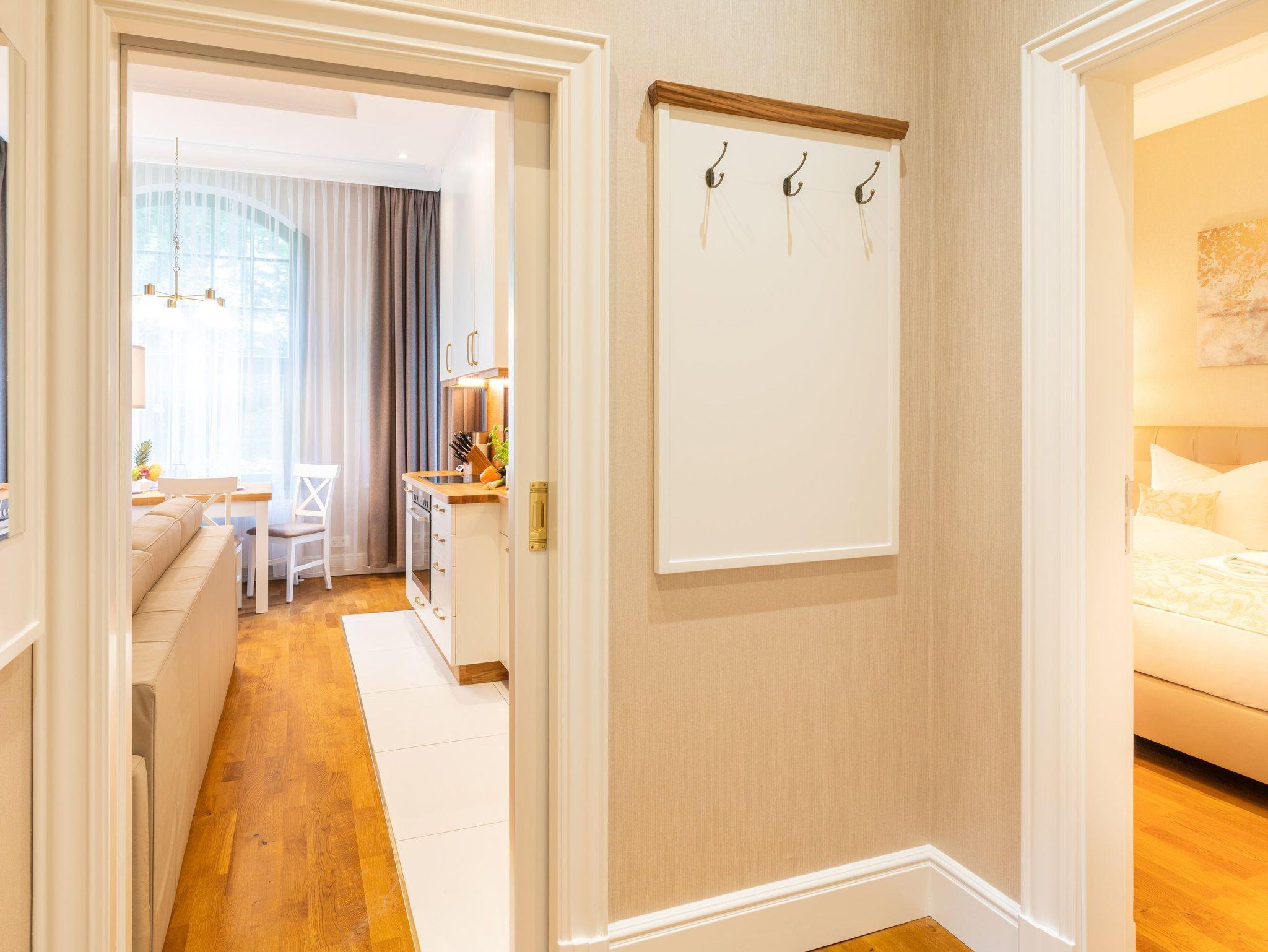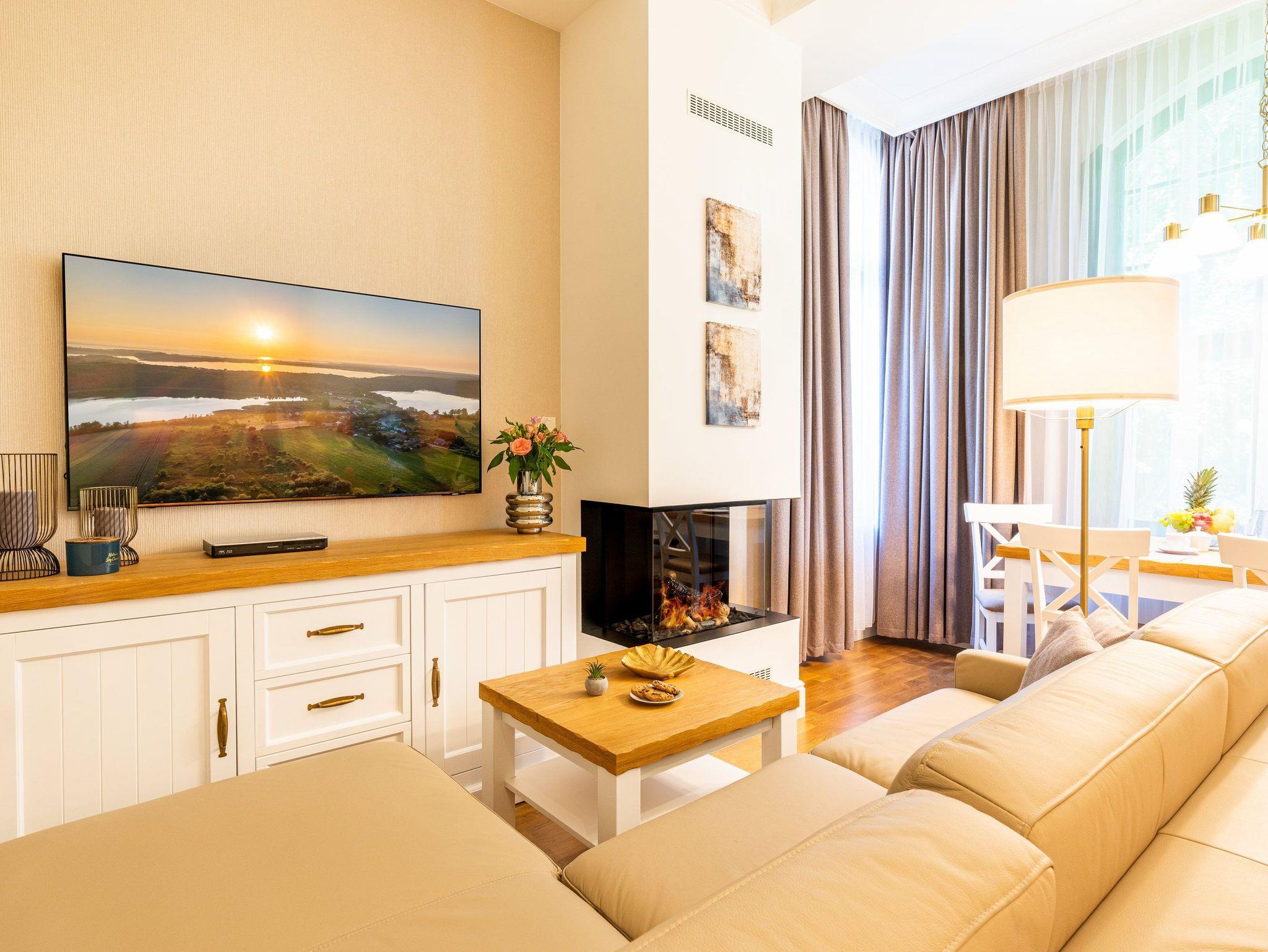 Ein großzügiger Wohnbereich mit einem exklusiven Gaskamin erwartet Sie bereits, sodass Sie eine angenehme Wohlfühlatmosphäre das gesamte Jahr über genießen. Eine bequeme Couchgarnitur und ein Flat TV runden den Komfort perfekt ab und laden zum Entspannen und Füße hochlegen ein. Das helle Zwei-Zimmer-Appartement hat eine Größe von 46 Quadratmetern und liegt im Hochparterre der Villa Waldschloss. Die vollausgestattete Küche, welche speziell von einem einheimischen Tischler angefertigt wurde, ergänzt die Annehmlichkeiten dieses neuen Appartements mit allen Raffinessen: Backofen, Mikrowelle, Kühlschrank mit Gefrierfach, Toaster, Wasserkocher, Kaffeemaschine sowie einem Essplatz für 4 Personen mit Blick in den gegenüberliegenden Park.