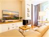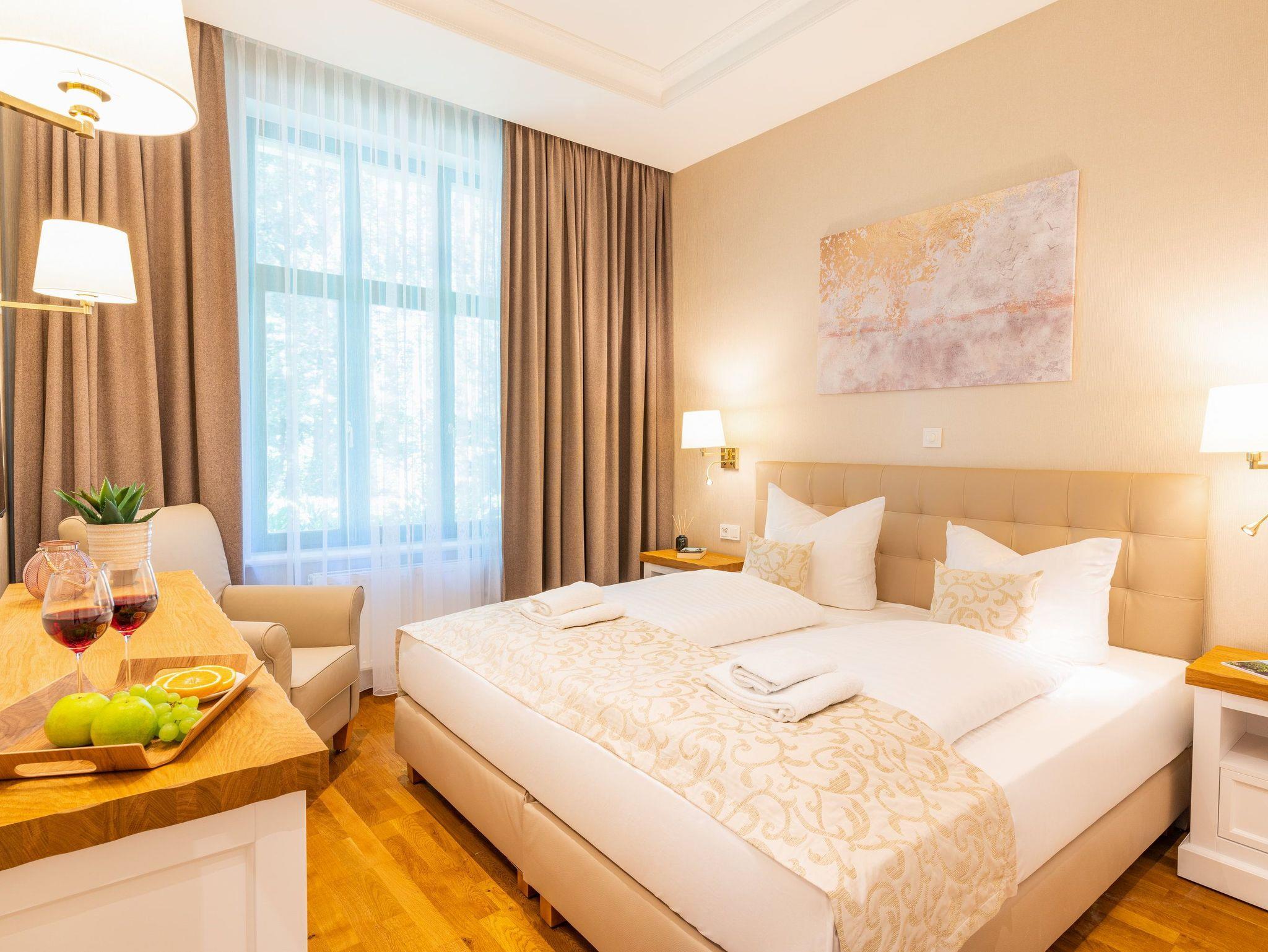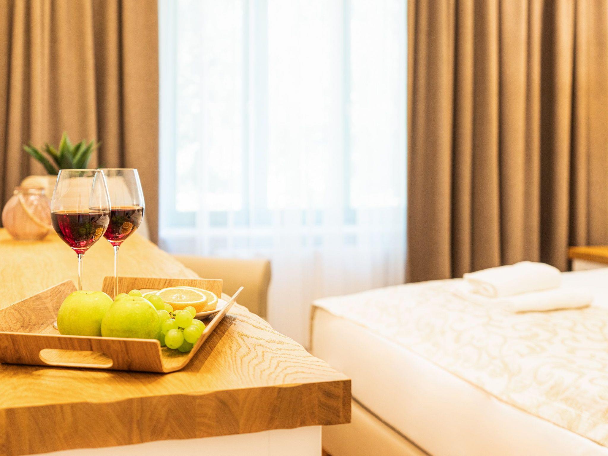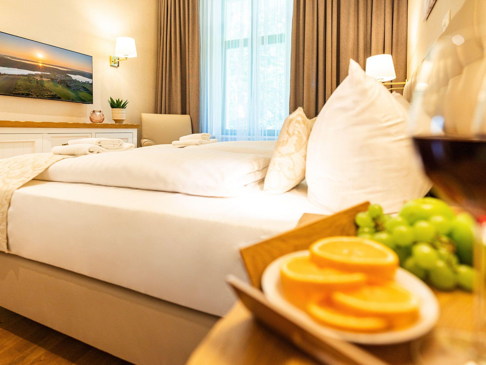 Ein großzügiger Wohnbereich mit einem exklusiven Gaskamin erwartet Sie bereits, sodass Sie eine angenehme Wohlfühlatmosphäre das gesamte Jahr über genießen. Eine bequeme Couchgarnitur und ein Flat TV runden den Komfort perfekt ab und laden zum Entspannen und Füße hochlegen ein. Das helle Zwei-Zimmer-Appartement hat eine Größe von 46 Quadratmetern und liegt im Hochparterre der Villa Waldschloss. Die vollausgestattete Küche, welche speziell von einem einheimischen Tischler angefertigt wurde, ergänzt die Annehmlichkeiten dieses neuen Appartements mit allen Raffinessen: Backofen, Mikrowelle, Kühlschrank mit Gefrierfach, Toaster, Wasserkocher, Kaffeemaschine sowie einem Essplatz für 4 Personen mit Blick in den gegenüberliegenden Park.