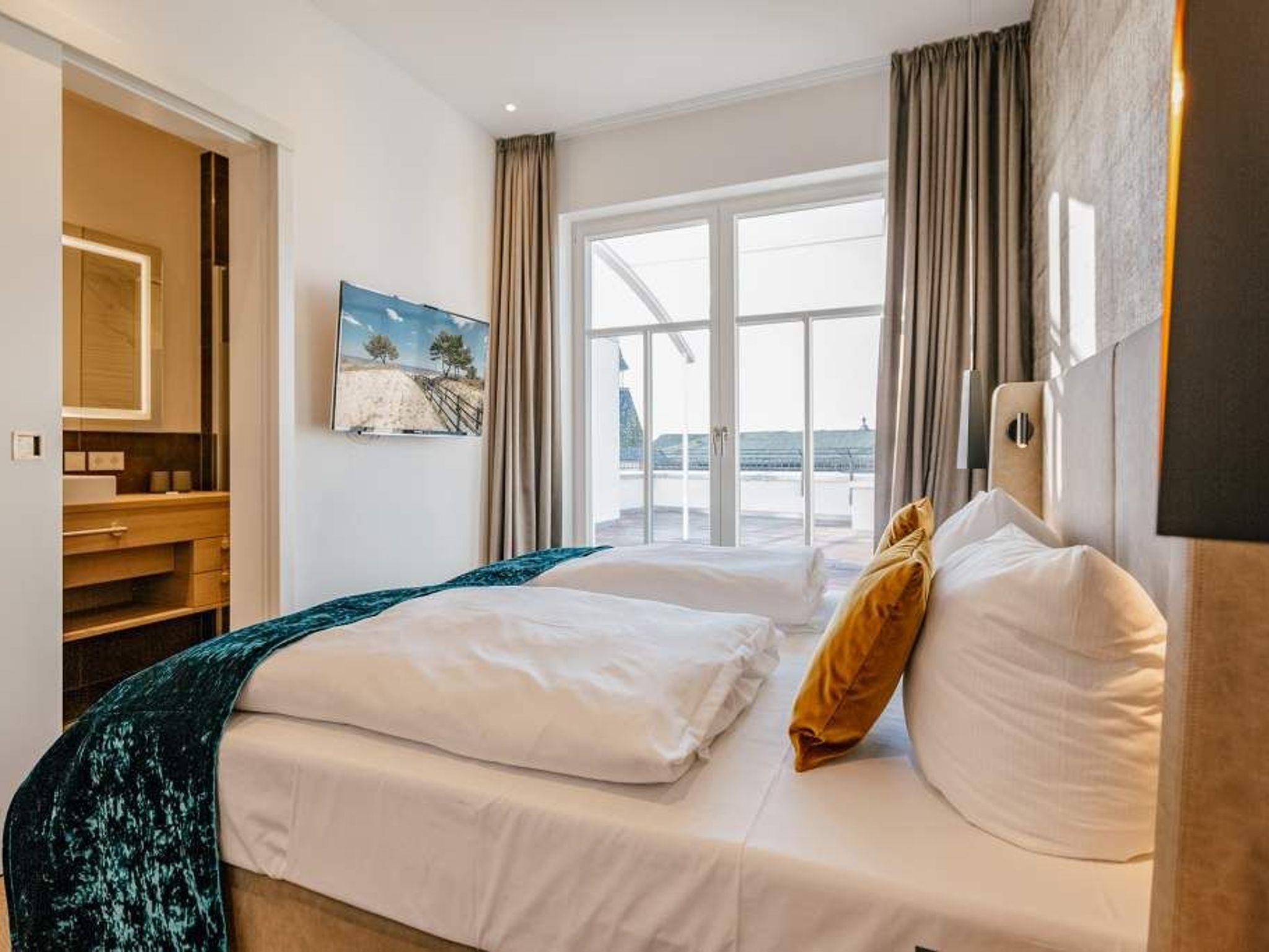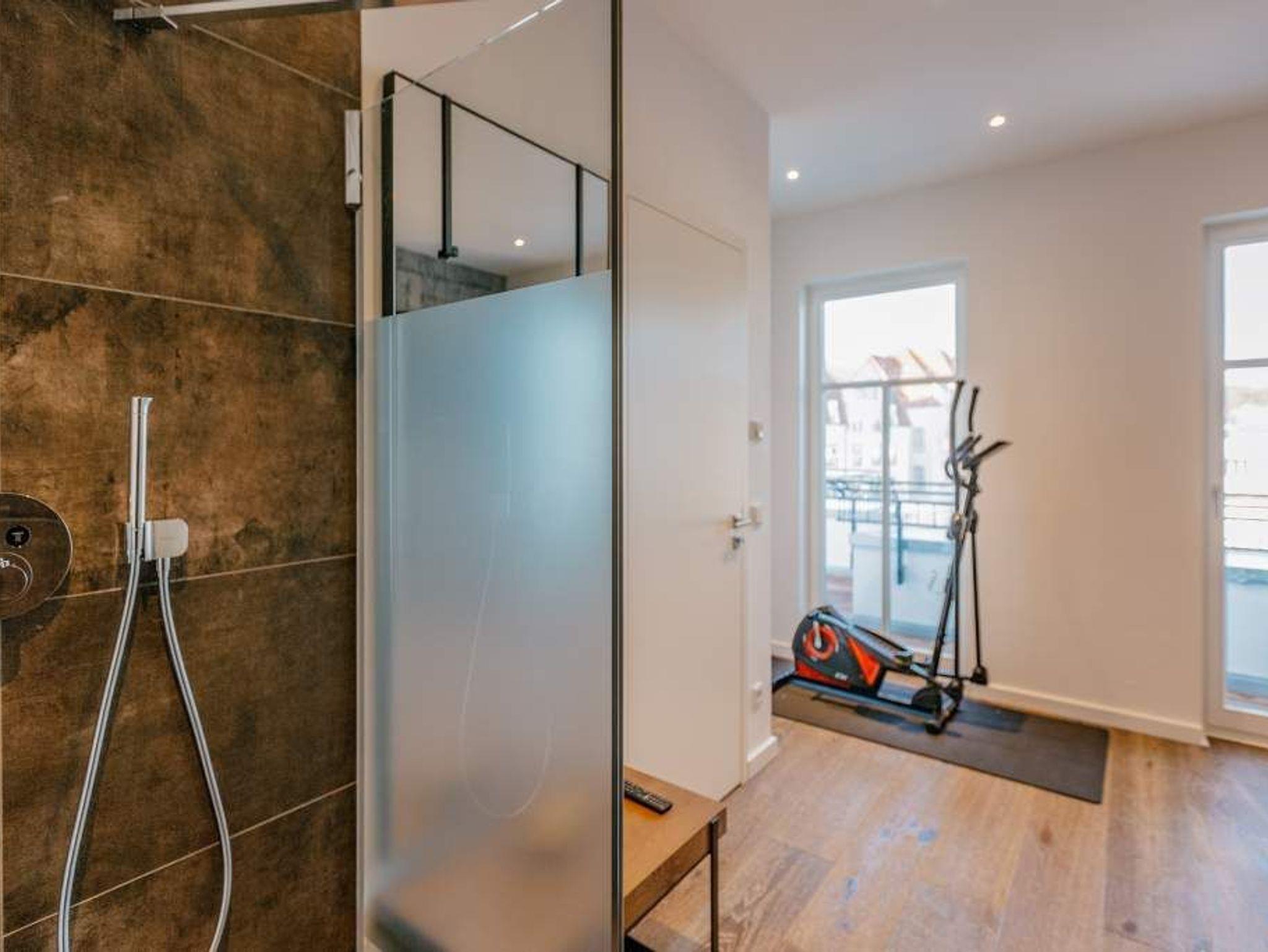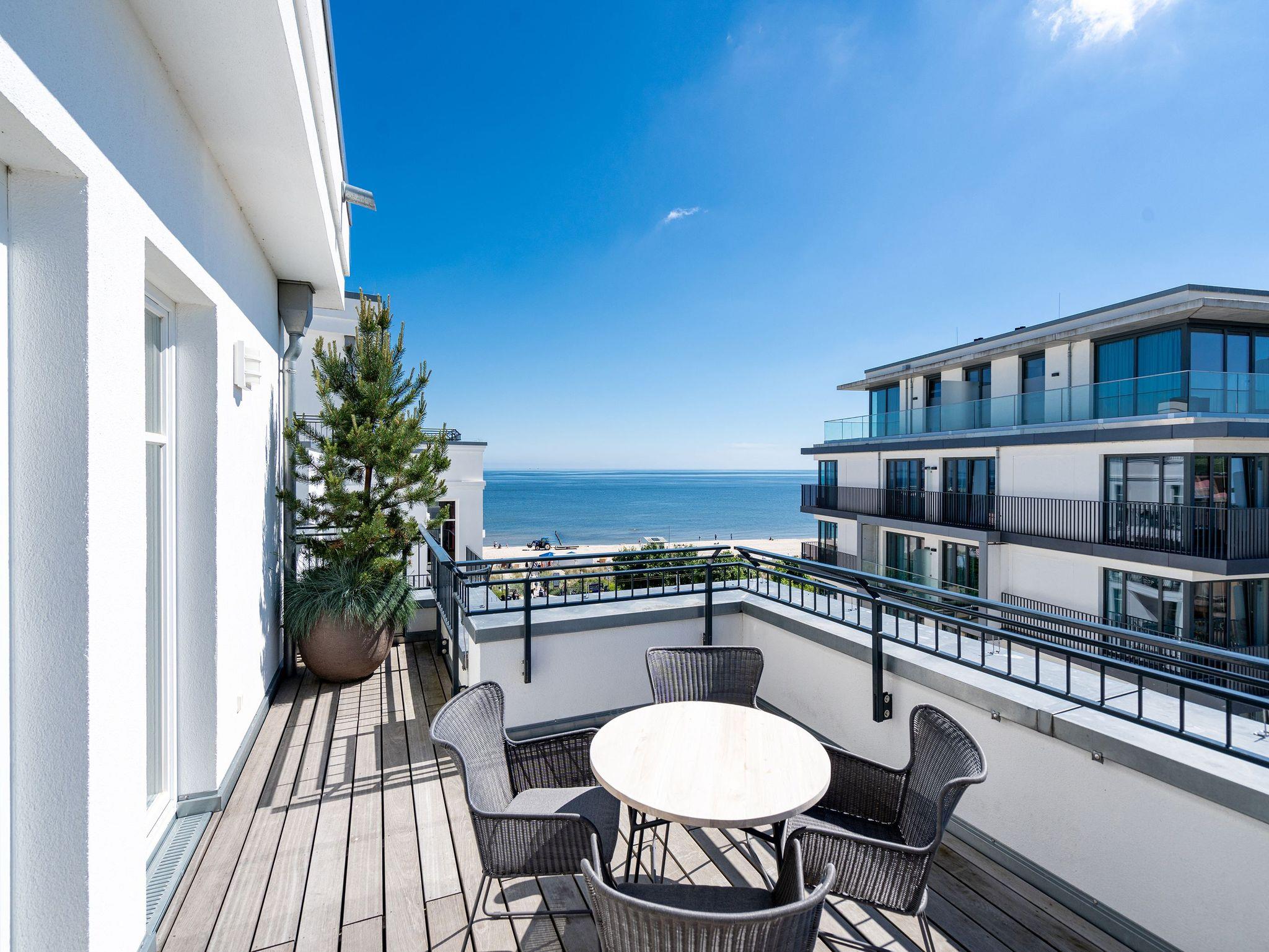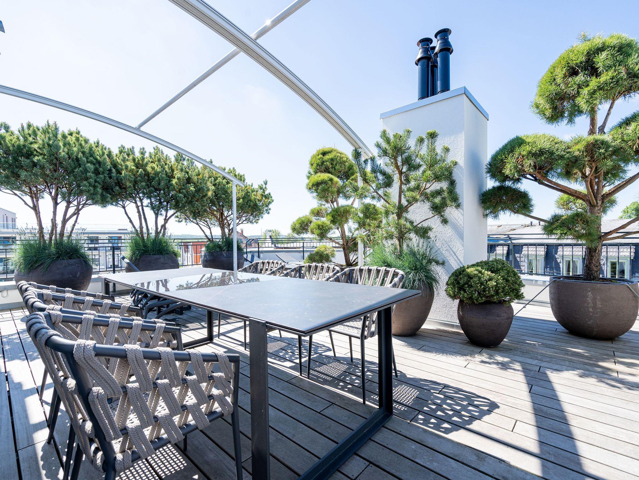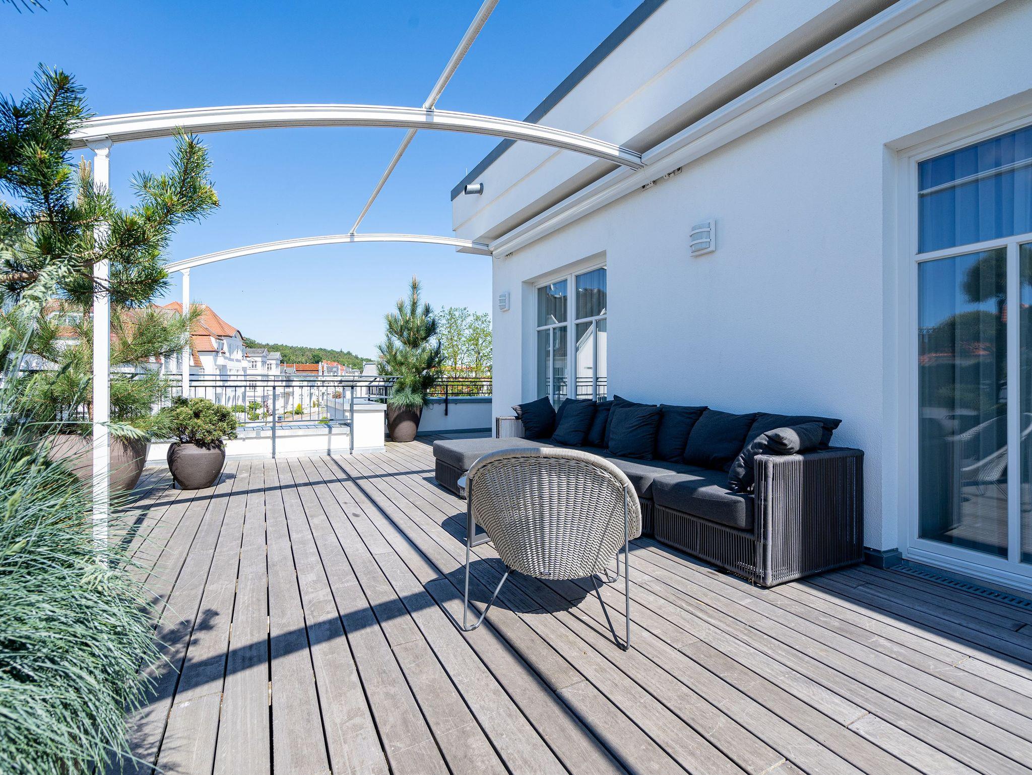 Urlaub der Extra-Klasse ? im 100 Quadratmeter großen Penthouse Sunset im 4. Stock erwartet Sie ein wahrhaft exklusives Urlaubsparadies für bis zu vier Personen. Der Name Sunset ist Programm. Denn von der riesigen, 171 Quadratmeter großen Südterrasse können Sie die malerischen Usedomer Sonnenuntergänge über den Dächern der alten Villen von Bansin ganz exklusiv genießen. Ihr ganz privates Sonnendeck erstreckt sich über die gesamte Hausbreite und gibt so auch auf die Ostsee einen Blick frei. Ob Sonnenbaden, Entspannen im Schatten der ausfahrbaren Markisen dösen oder den Sundowner mit den Freunden oder der Familie trinken ? hier werden Sie sich rundum wohlfühlen und neue Energie tanken können. Das Innere des Appartements ist stilvoll, elegant und stylisch von einem der besten Hoteleinrichter Deutschlands eingerichtet. Bis ins kleinste Detail ist hier alles aufeinander abgestimmt. Harmonie durchströmt jeden der vier Räume. Das großzügige Wohn-Esszimmer lädt zum Entspannen und Genießen ein. Lassen Sie sich auf die große Eckcouch oder den gemütlichen Sessel fallen. Füße hoch und einfach nur entspannen beim Schauen eines spannenden Films auf dem Flat-TV oder beim Beobachten der Flammen im Gas-Kamin. Hier kann man Zeit und Raum vergessen. Packt Sie der Appetit, finden Sie in der offenen Wohnküche alles Notwendige, um ein köstliches Essen zu zaubern. Die Geräte wie Geschirrspüler, Herd oder Kaffeemaschine sind allesamt hochwertige Markengeräte. In den Schränken wartet das edle Geschirr nur darauf, die Gaumenfreude auch optisch zum Genuss zu machen. Denn schließlich isst das Auge mit. Nehmen Sie Platz am schönen Esstisch. Durch die Bluetooth-Funktion der Bose-Soundanlage können Sie zu jeder Tageszeit Ihre Lieblingsmusik hören. Das WLAN ist kostenfrei. Jedes der beiden Schlafzimmer besitzt ein eigenes Bad mit Regendusche, Waschtisch und WC. Zwei Boxspringdoppelbetten (1,80 m x 2,00 m) sorgen für wundervolle Träume und einen erholsamen Schlaf. Damit Sie gleich nach dem Aufwachen an die Ostseeluft hinaustreten können, hat jedes Schlafzimmer einen Zugang zur Terrasse. Große Schränke bieten ausreichend Stauraum. Das Penthouse Sunset hat noch ein Ass im Ärmel. In einem eigenen kleinen Fitnessraum mit Fitnessgeräten und Flat-TV können Sie auch im Urlaub so richtig Gas geben und Ihrer Fitness auf die Sprünge helfen. Nach dem Auspowern gibt es zum Runterkommen sogar eine eigene Finnische Sauna und eine geräumige Regendusche. Wenn Sie Ihre Sachen waschen wollen, haben Sie dazu ebenfalls die Gelegenheit. In einem Hauswirtschaftsraum steht ein Wasch-Trockner. Der Urlaub wäre nicht perfekt, wenn nicht bei Anreise die Betten schon bezogen wären und ausreichend Handtücher bereit lägen. In der modernen Tiefgarage sind für das Penthouse zwei Stellplätze, Nr. 29, reserviert. Also, kommen Sie an und lassen Sie es sich gut gehen. Denn in diesem Penthouse wird Ihre Ostsee-Auszeit zu einem unvergesslich schönen Urlaub.