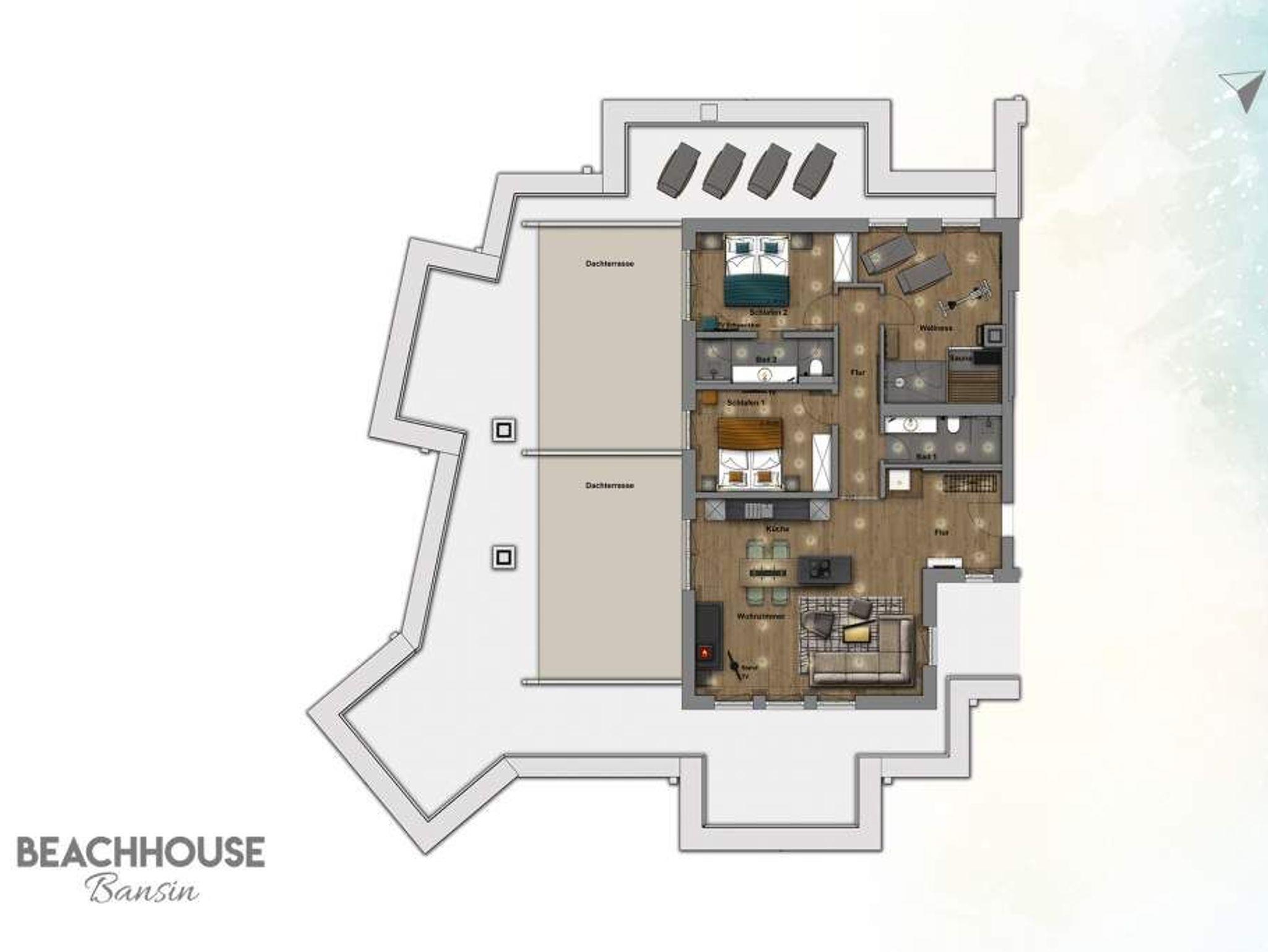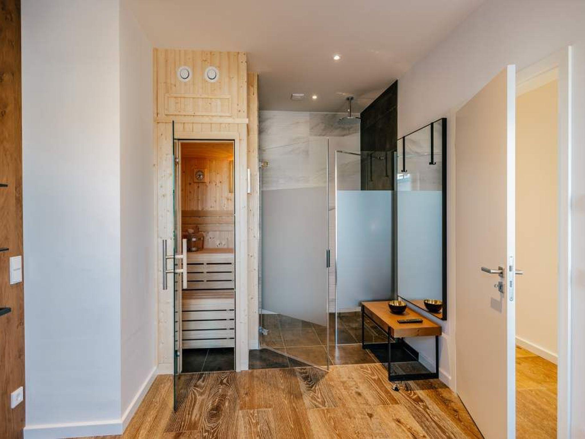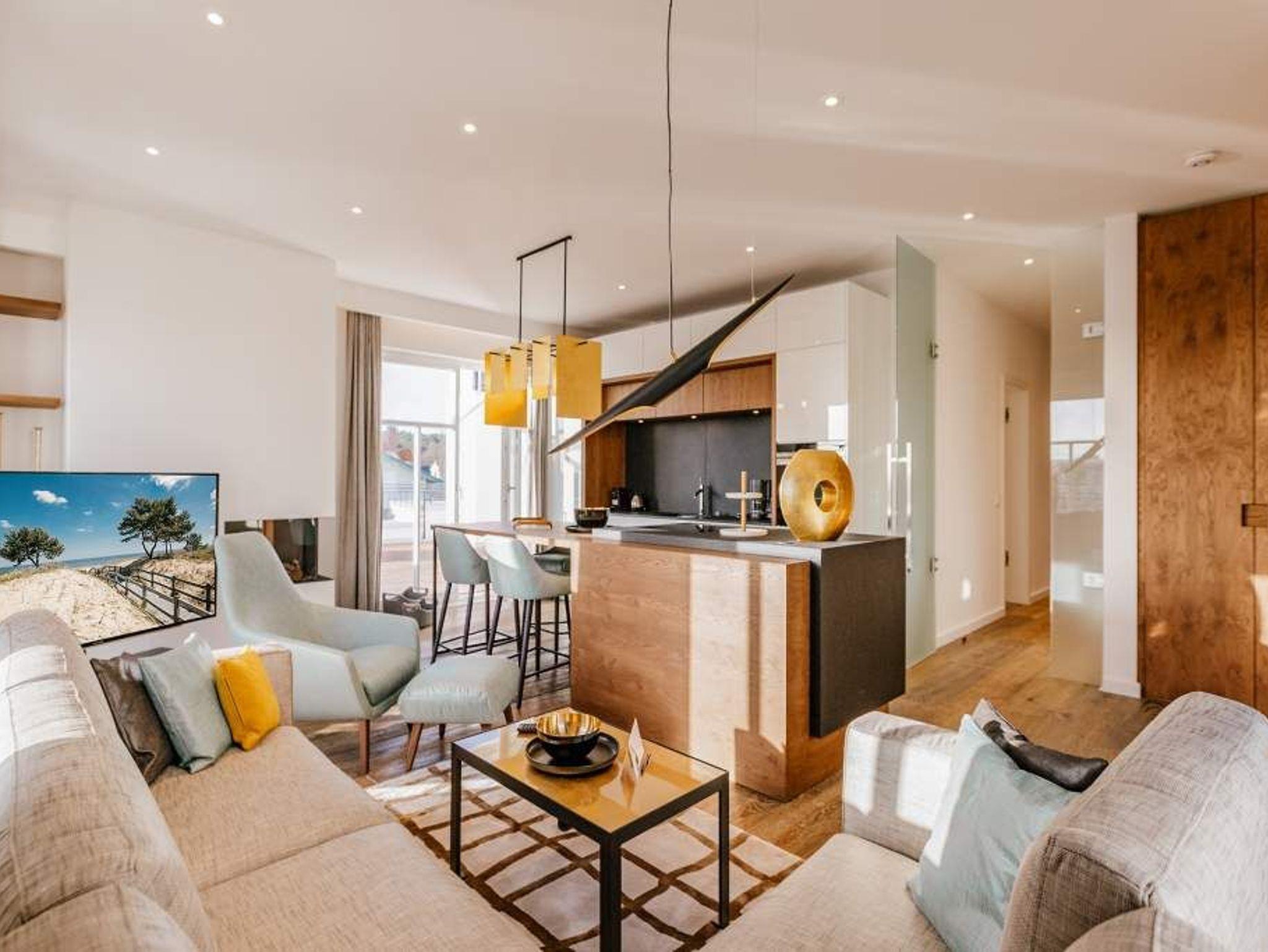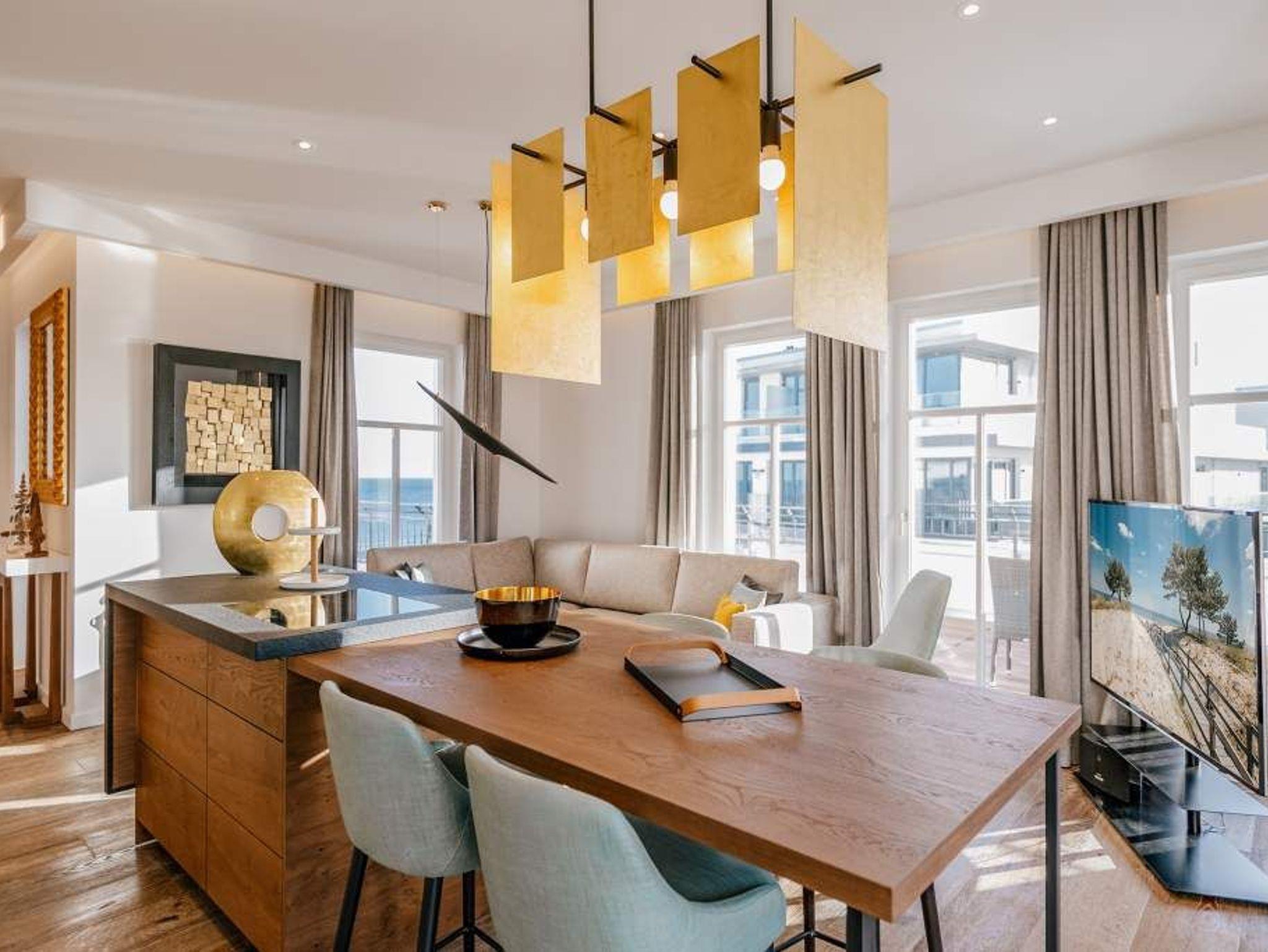 Urlaub der Extra-Klasse im 100 Quadratmeter großen Penthouse Sunset im 4. Stock erwartet Sie ein wahrhaft exklusives Urlaubsparadies für bis zu vier Personen. Der Name Sunset ist Programm. Denn von der riesigen, 171 Quadratmeter großen Südterrasse können Sie die malerischen Usedomer Sonnenuntergänge über den Dächern der alten Villen von Bansin ganz exklusiv genießen. Ihr ganz privates Sonnendeck erstreckt sich über die gesamte Hausbreite und gibt so auch auf die Ostsee einen Blick frei. Ob Sonnenbaden, Entspannen im Schatten der ausfahrbaren Markisen dösen oder den Sundowner mit den Freunden oder der Familie trinken hier werden Sie sich rundum wohlfühlen und neue Energie tanken können. Das Innere des Appartements ist stilvoll, elegant und stylisch von einem der besten Hoteleinrichter Deutschlands eingerichtet. Bis ins kleinste Detail ist hier alles aufeinander abgestimmt. Harmonie durchströmt jeden der vier Räume. Das großzügige Wohn-Esszimmer lädt zum Entspannen und Genießen ein. Lassen Sie sich auf die große Eckcouch oder den gemütlichen Sessel fallen. Füße hoch und einfach nur entspannen beim Schauen eines spannenden Films auf dem Flat-TV oder beim Beobachten der Flammen im Gas-Kamin. Hier kann man Zeit und Raum vergessen. Packt Sie der Appetit, finden Sie in der offenen Wohnküche alles Notwendige, um ein köstliches Essen zu zaubern. Die Geräte wie Geschirrspüler, Herd oder Kaffeemaschine sind allesamt hochwertige Markengeräte. In den Schränken wartet das edle Geschirr nur darauf, die Gaumenfreude auch optisch zum Genuss zu machen. Denn schließlich isst das Auge mit. Nehmen Sie Platz am schönen Esstisch. Durch die Bluetooth-Funktion der Bose-Soundanlage können Sie zu jeder Tageszeit Ihre Lieblingsmusik hören. Das WLAN ist kostenfrei. Jedes der beiden Schlafzimmer besitzt ein eigenes Bad mit Regendusche, Waschtisch und WC. Zwei Boxspringdoppelbetten (1,80 m x 2,00 m) sorgen für wundervolle Träume und einen erholsamen Schlaf. Damit Sie gleich nach dem Aufwachen an die Ostseeluft hinaustreten können, hat jedes Schlafzimmer einen Zugang zur Terrasse. Große Schränke bieten ausreichend Stauraum. Das Penthouse Sunset hat noch ein Ass im Ärmel. In einem eigenen kleinen Fitnessraum mit Fitnessgeräten und Flat-TV können Sie auch im Urlaub so richtig Gas geben und Ihrer Fitness auf die Sprünge helfen. Nach dem Auspowern gibt es zum Runterkommen sogar eine eigene Finnische Sauna und eine geräumige Regendusche. Wenn Sie Ihre Sachen waschen wollen, haben Sie dazu ebenfalls die Gelegenheit. In einem Hauswirtschaftsraum steht ein Wasch-Trockner. Der Urlaub wäre nicht perfekt, wenn nicht bei Anreise die Betten schon bezogen wären und ausreichend Handtücher bereit lägen. In der modernen Tiefgarage sind für das Penthouse zwei Stellplätze, Nr. 29, reserviert. Also, kommen Sie an und lassen Sie es sich gut gehen. Denn in diesem Penthouse wird Ihre Ostsee-Auszeit zu einem unvergesslich schönen Urlaub.