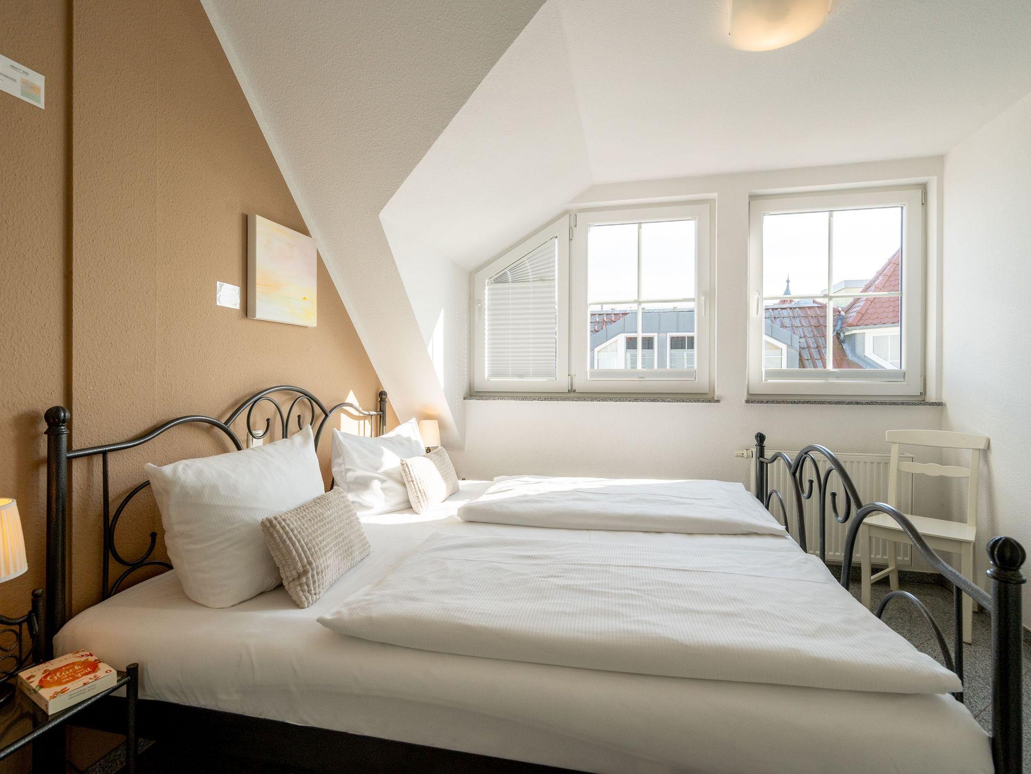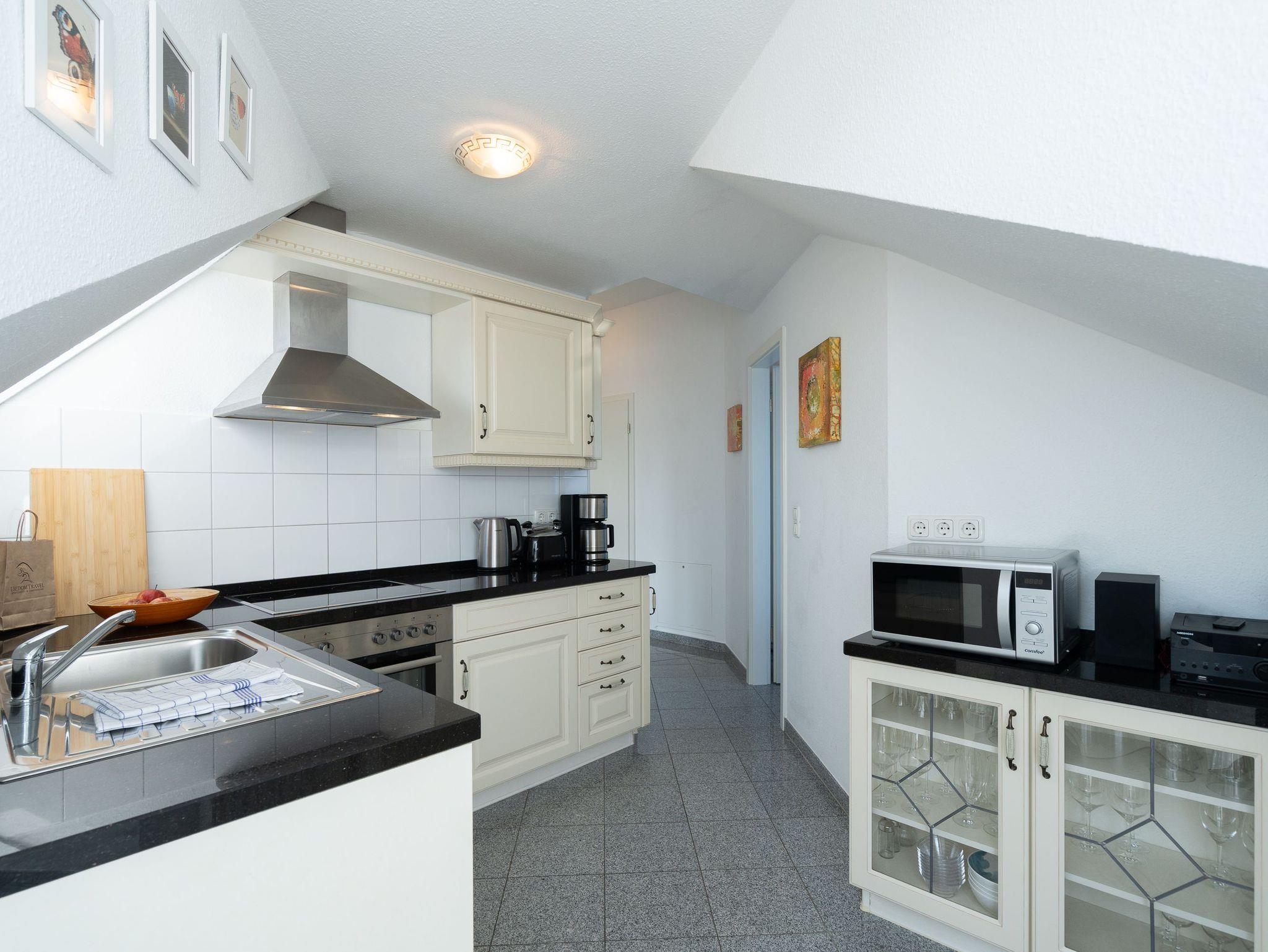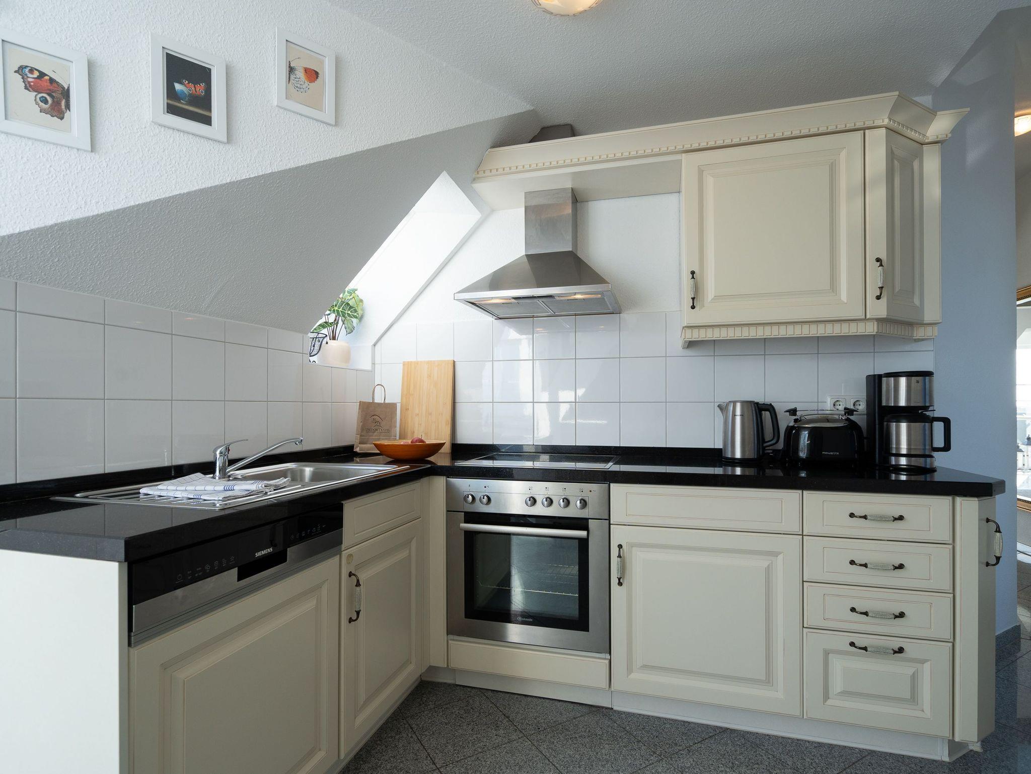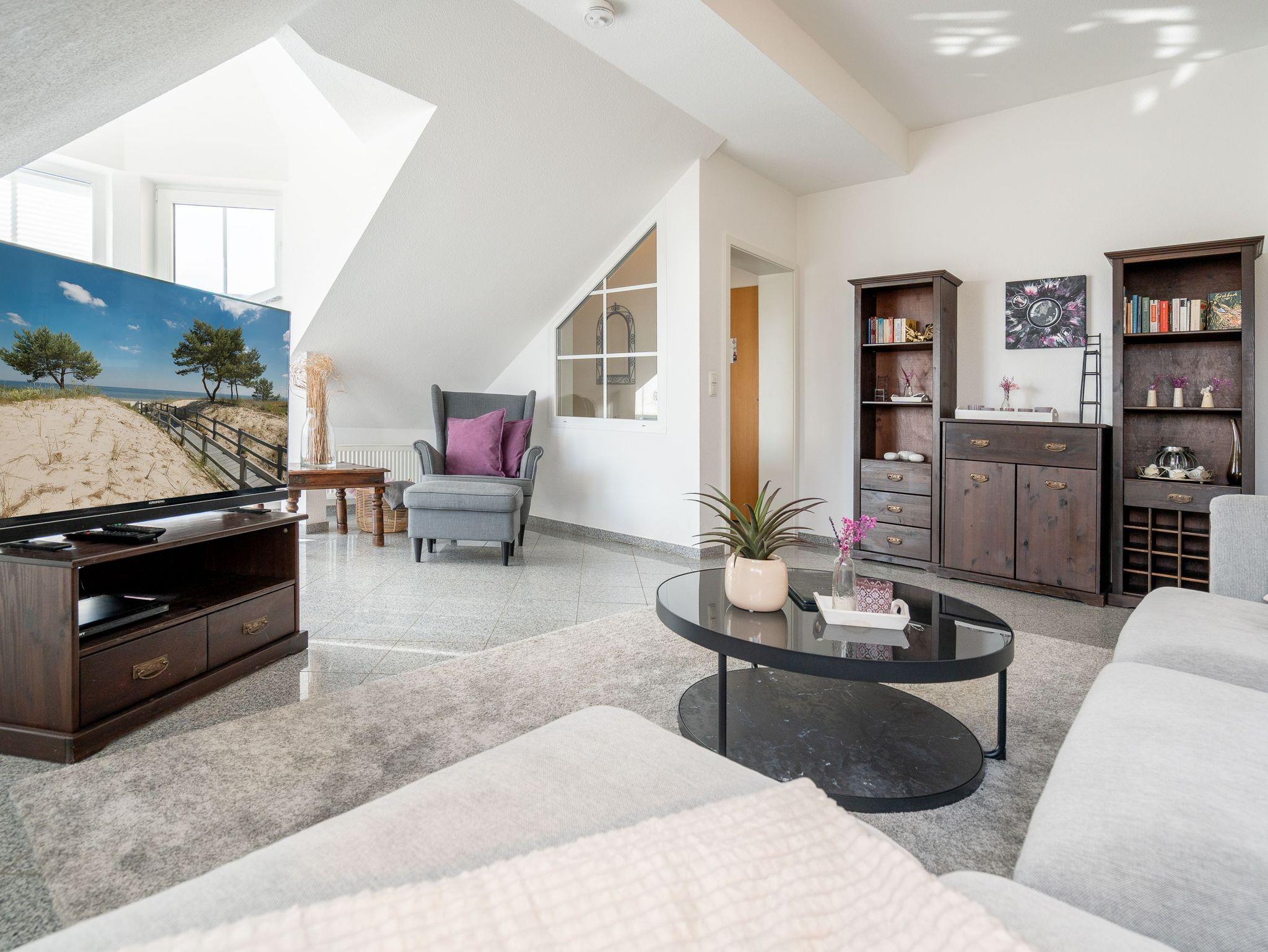 Genießen Sie den einzigartigen Ausblick auf das Meer aus unserer stilvoll und modern eingerichteten 3-Raum-Ferienwohnung in der Dünenresidenz. Die 75 m² große Dachgeschosswohnung bietet höchsten Komfort und ist bequem mit dem Aufzug erreichbar. Zwei gemütliche Schlafzimmer mit Doppelbetten ( Boxspringbett 1,60m x 2,00m / Doppelbett 1,80m x 2,00m), ein modernes Duschbad sowie eine voll ausgestattete Küche lassen keine Wünsche offen. Der lichtdurchflutete Essbereich im Glasturm schafft eine besondere Atmosphäre ? hier speisen Sie mit direktem Blick auf die Wellen. Der großzügige Wohnbereich öffnet sich zu einem Balkon, von dem aus Sie den Blick auf den Schloonsee und auch das Rauschen des Meeres genießen können. Die Wohnung bietet Platz für bis zu 4 Personen sowie ein Kleinkind bis 3 Jahre im Kinderreisebett. Auf Wunsch stellen wir Ihnen gern ein Kinderreisebett (ohne zusätzliche Matratze [&] Bettzeug) sowie einen Kinderhochstuhl (gegen Aufpreis) zur Verfügung. Für Ihren PKW steht Ihnen ein fester Stellplatz in der Tiefgarage zur Verfügung. Erleben Sie Erholung pur mit grandiosem Meerblick ? ein erholsamer Aufenthalt erwartet Sie!