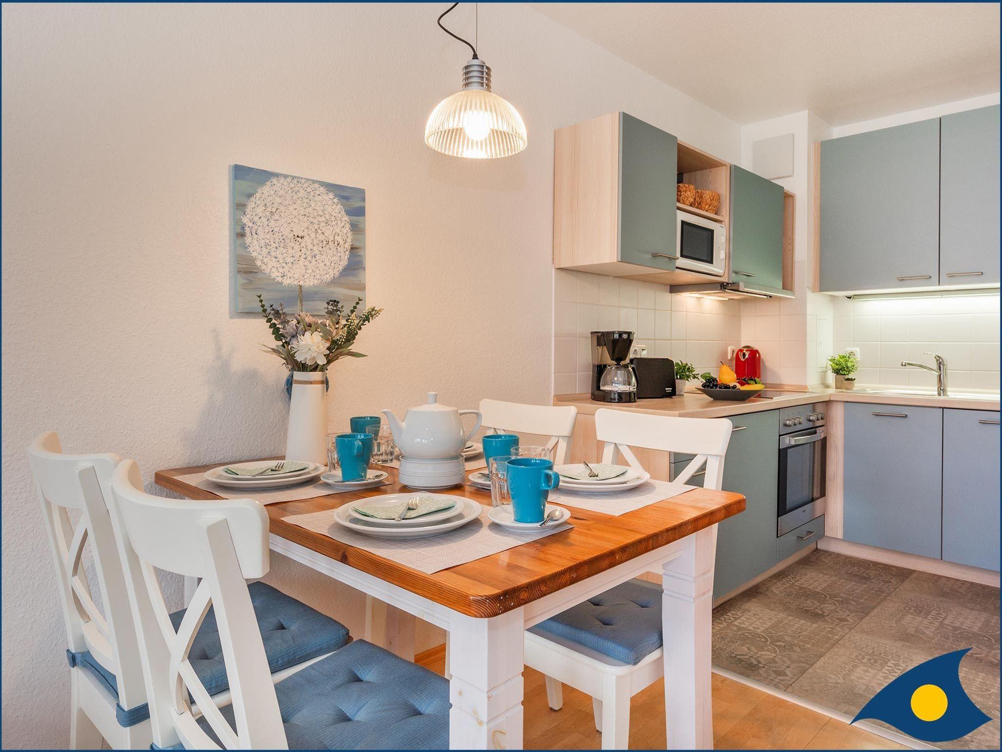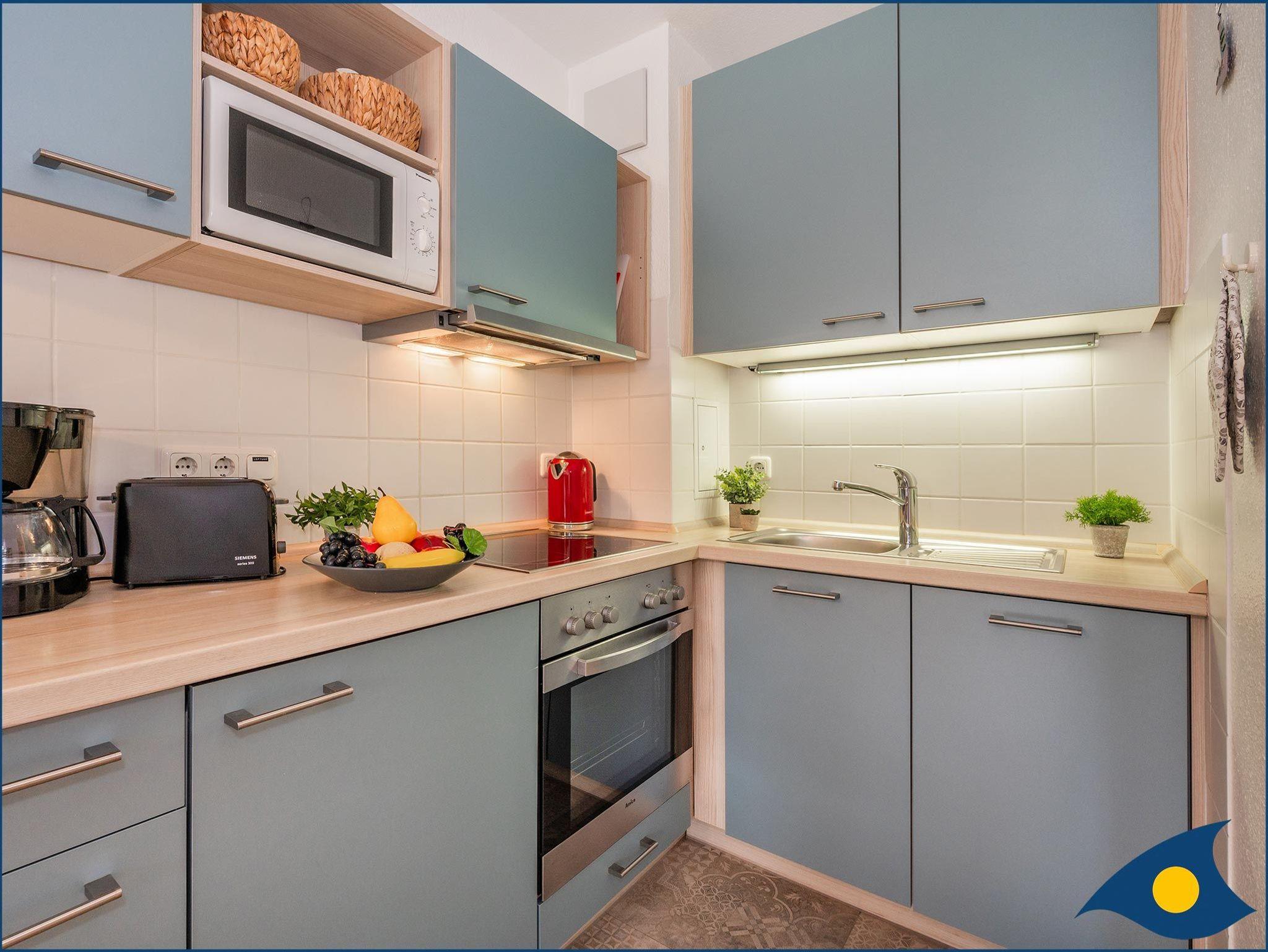 Die Einrichtung ist hell und freundlich gestaltet. Die moderne Küchenzeile beinhaltet alles was Sie für die Selbstverpflegung benötigen (E-Herd, Backofen, Geschirrspüler, Kühl-Gefrierschrank, Mikrowelle, Toaster, Kaffeemaschine und Wasserkocher).