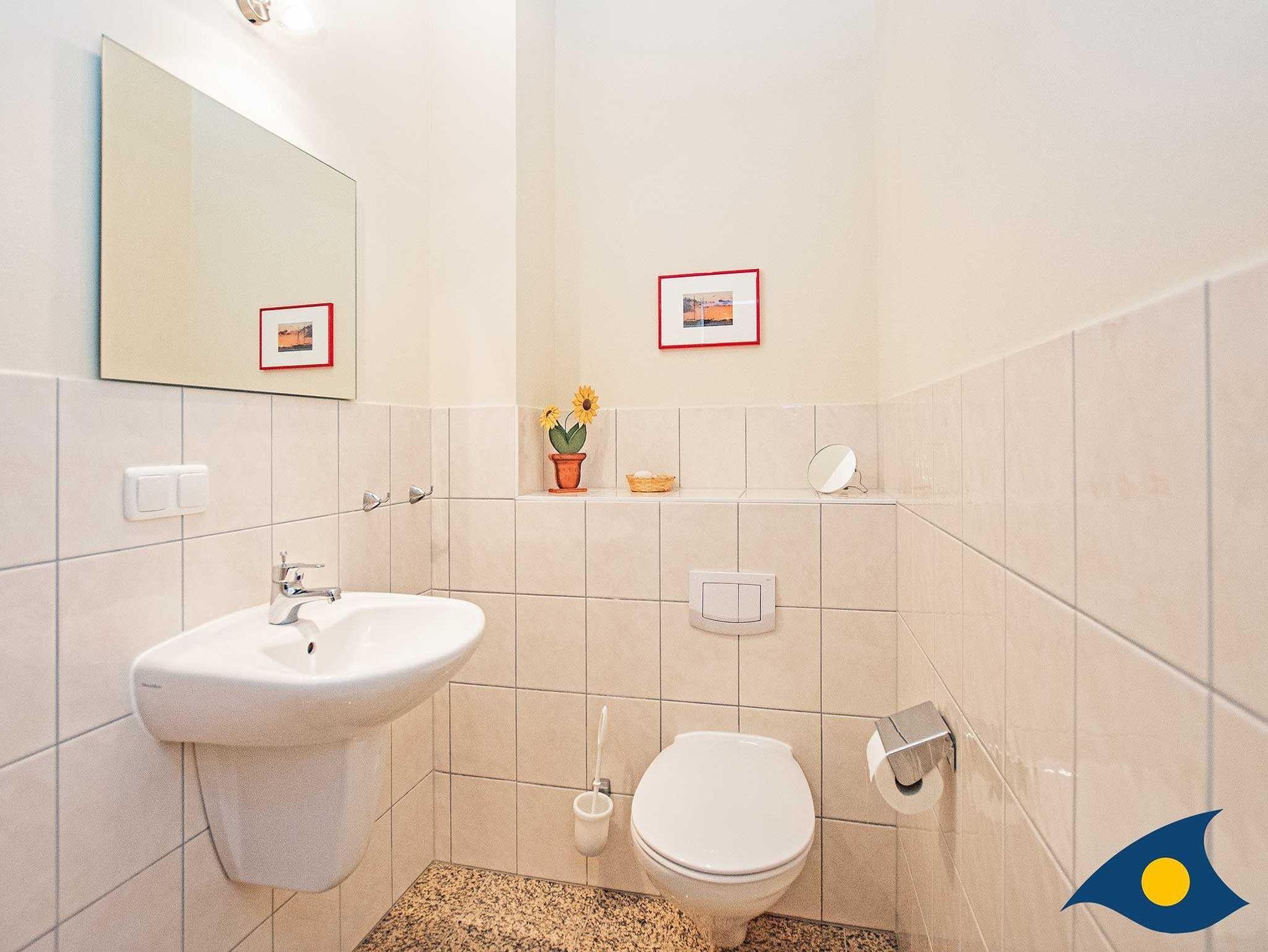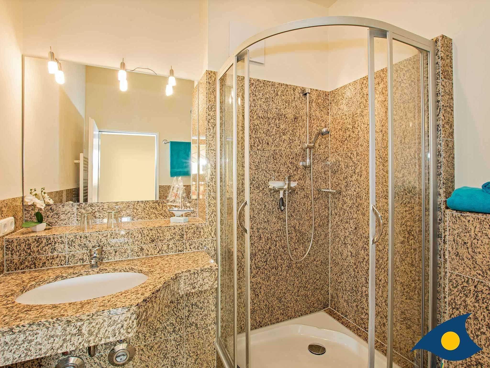 Das Badezimmer mit geräumiger Dusche und ein zusätzliches Gäste WC sorgen für komfortablen Urlaubsgenuss. Im Badezimmer und auf allen Fußböden der Wohnung wurden hochwertige Granitplatten verarbeitet.