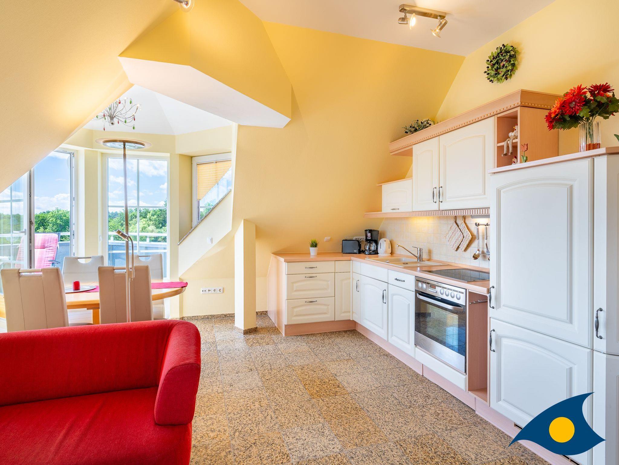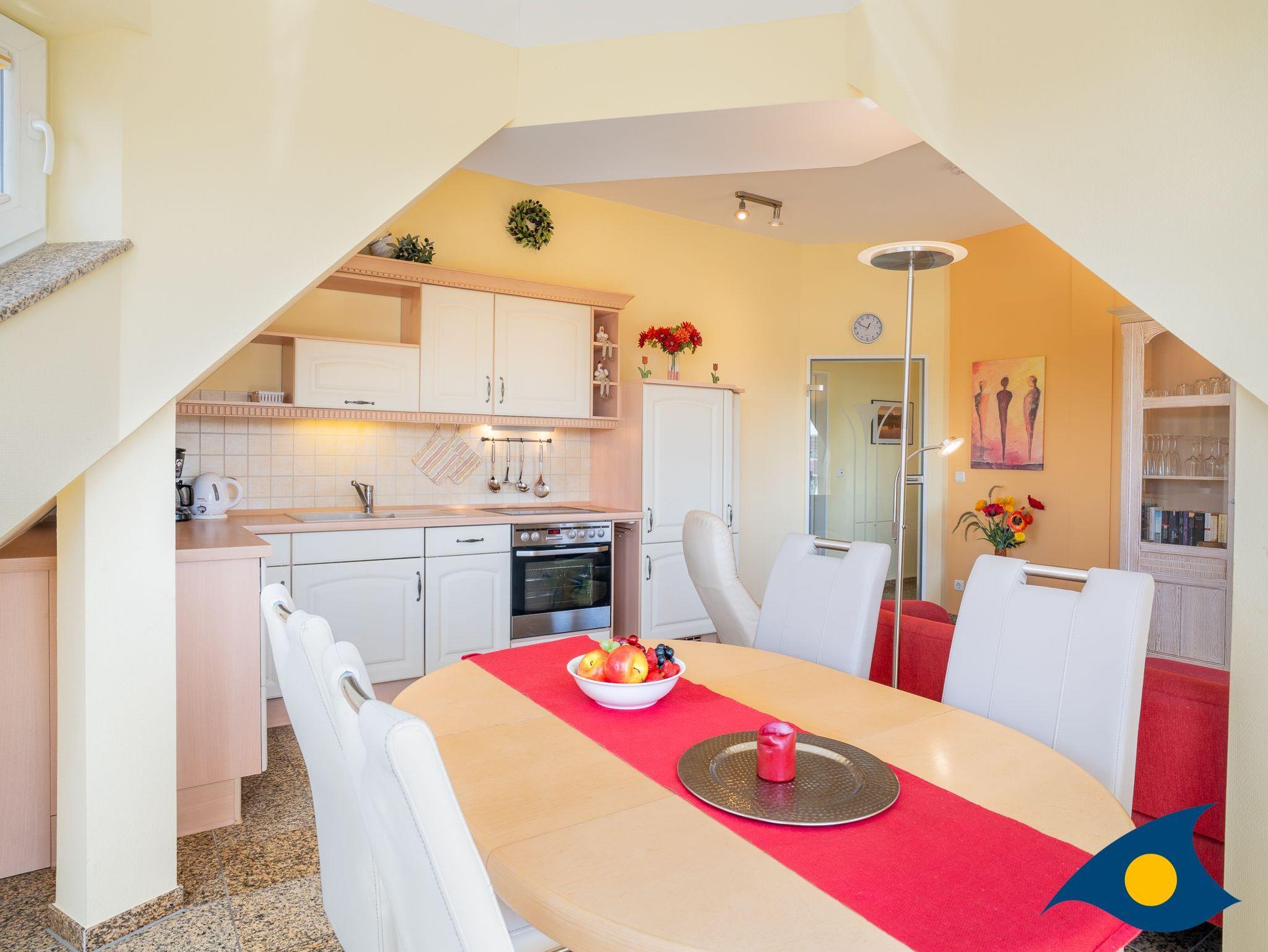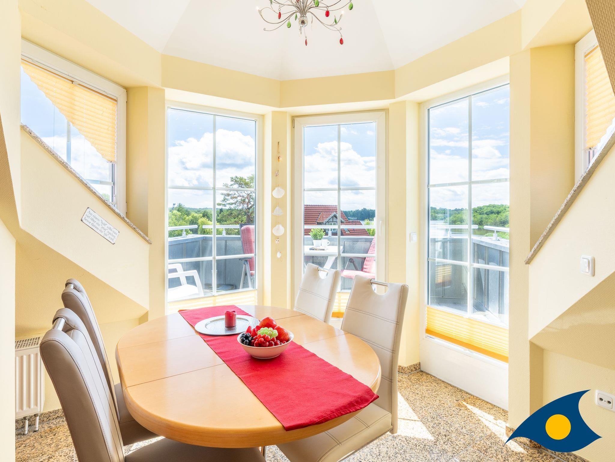 Das Wohn- / Esszimmer mit der hellen, komplett eingerichteten Landhausküche (inklusive Spülmaschine sowie Herd mit Ceranfeld und Backofen) vermittelt sofort Urlaubsstimmung. Vom Essplatz im Erkertürmchen mit Terrasse genießen Sie einen traumhaften Blick zum herrlichen Schloonsee. Radio mit CD-Player und Flachbild-TV sind ebenfalls vorhanden.