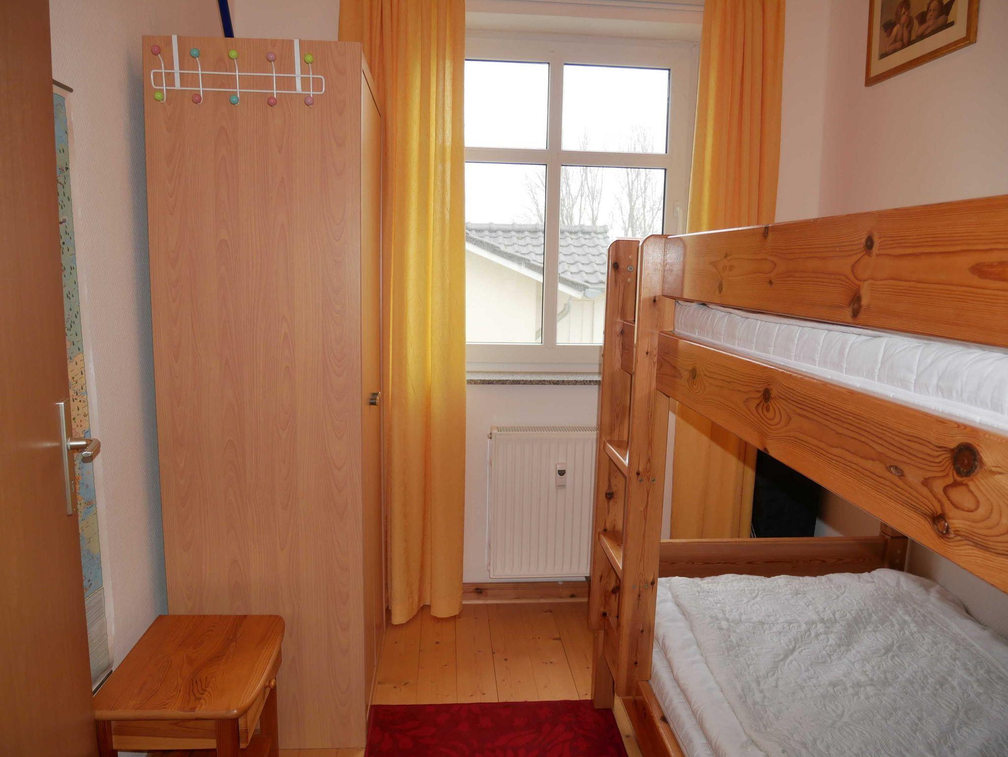 Zur Wohnung gehört eine überdachte Terrasse mit Sitzmöbeln und Blick in den Innenhof. Im 1. Obergeschoß befinden sich zwei Schlafräume mit 1 x Doppelbett, 1 x gr. Etagenbett (2 m lang x je 1 m breit) sowie ein Bad mit DU/WC. Die Erstausstattung Bettwäsche und Handtücher sind nicht im Gesamtpreis enthalten. Bei Bedarf können diese gegen Gebühr zugebucht werden.