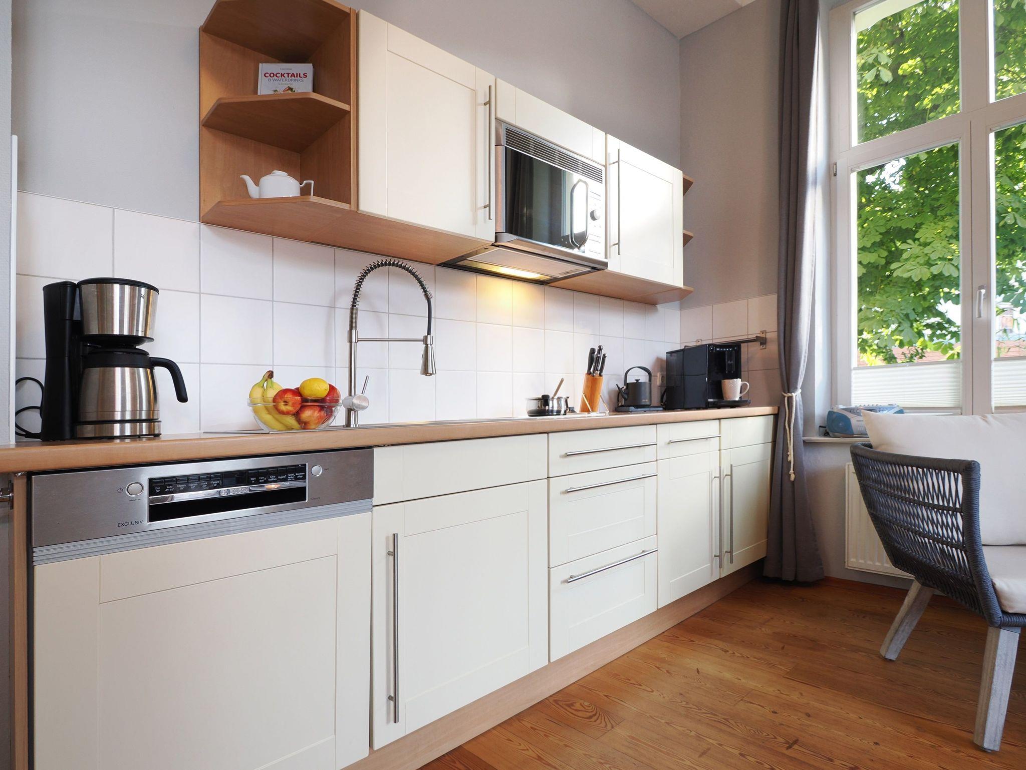 Die offene Küchenzeile bietet alles, was Sie für einen angenehmen Aufenthalt benötigen. Ein hochwertiger Kaffeevollautomat (Melitta Caffeo Solo) steht bereit, um den perfekten Start in den Tag zu ermöglichen, während die Multifunktionsmikrowelle nicht nur zum Erhitzen, sondern auch, dank des integrierten Grills, zum Aufbacken genutzt werden kann.