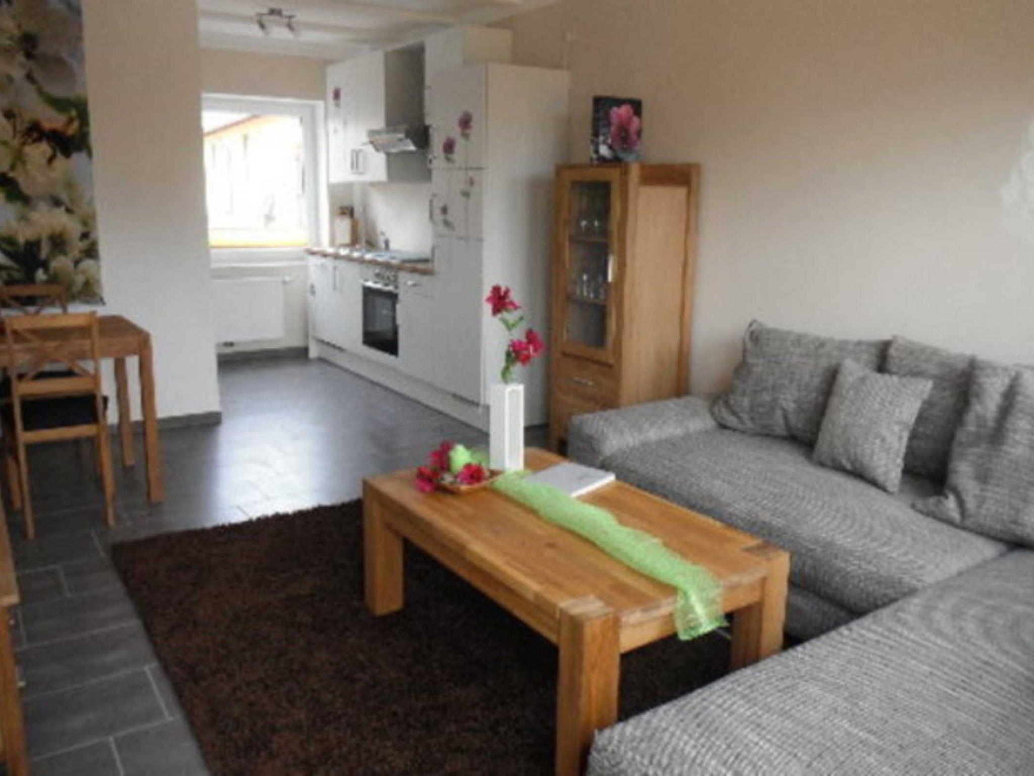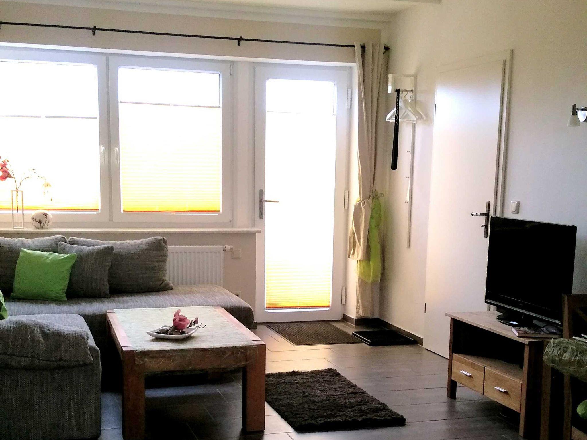 - 1 Wohnzimmer Aufbettung für 2 Personen möglich (Schlafcouch)- und Schlafzimmer für 2 Personen mit Doppelbett - Flachbildfernseher mit SAT- Anschluss - 1 Einbauküche mit Kühl- und Gefrierschrank und Herd mit Backofen - Mikrowelle - Dusche/ WC - Parkplatz inkl. - große Terrasse mit Grillgelegenheit - Klein- und Haustiere willkommen - Wohnung ist mit kostenlosem WLAN ausgestattet - Erdgeschosswohnung - nächste Bademöglichkeit Kleiner Waldsee 10 Minuten entfernt - Neubau