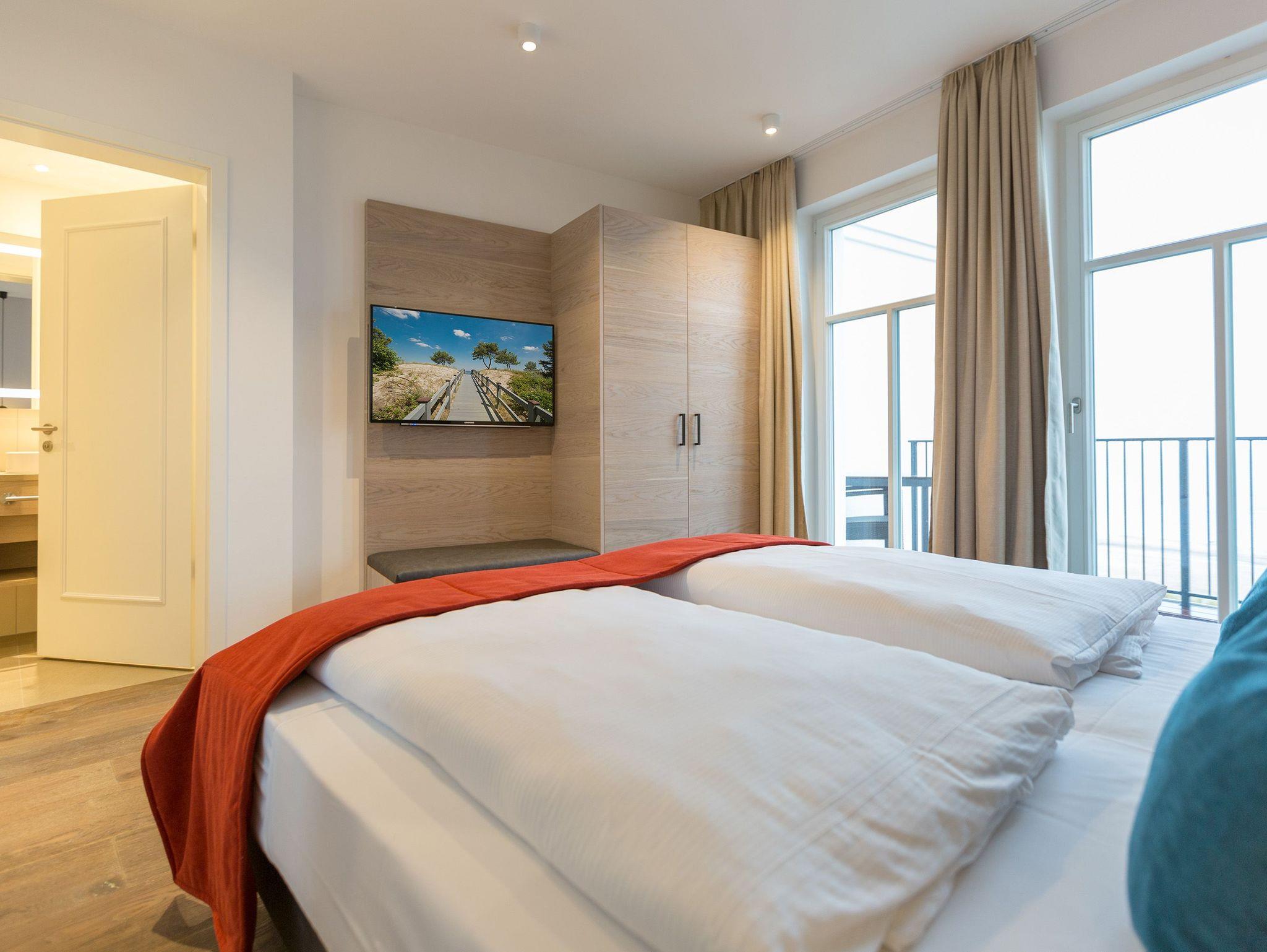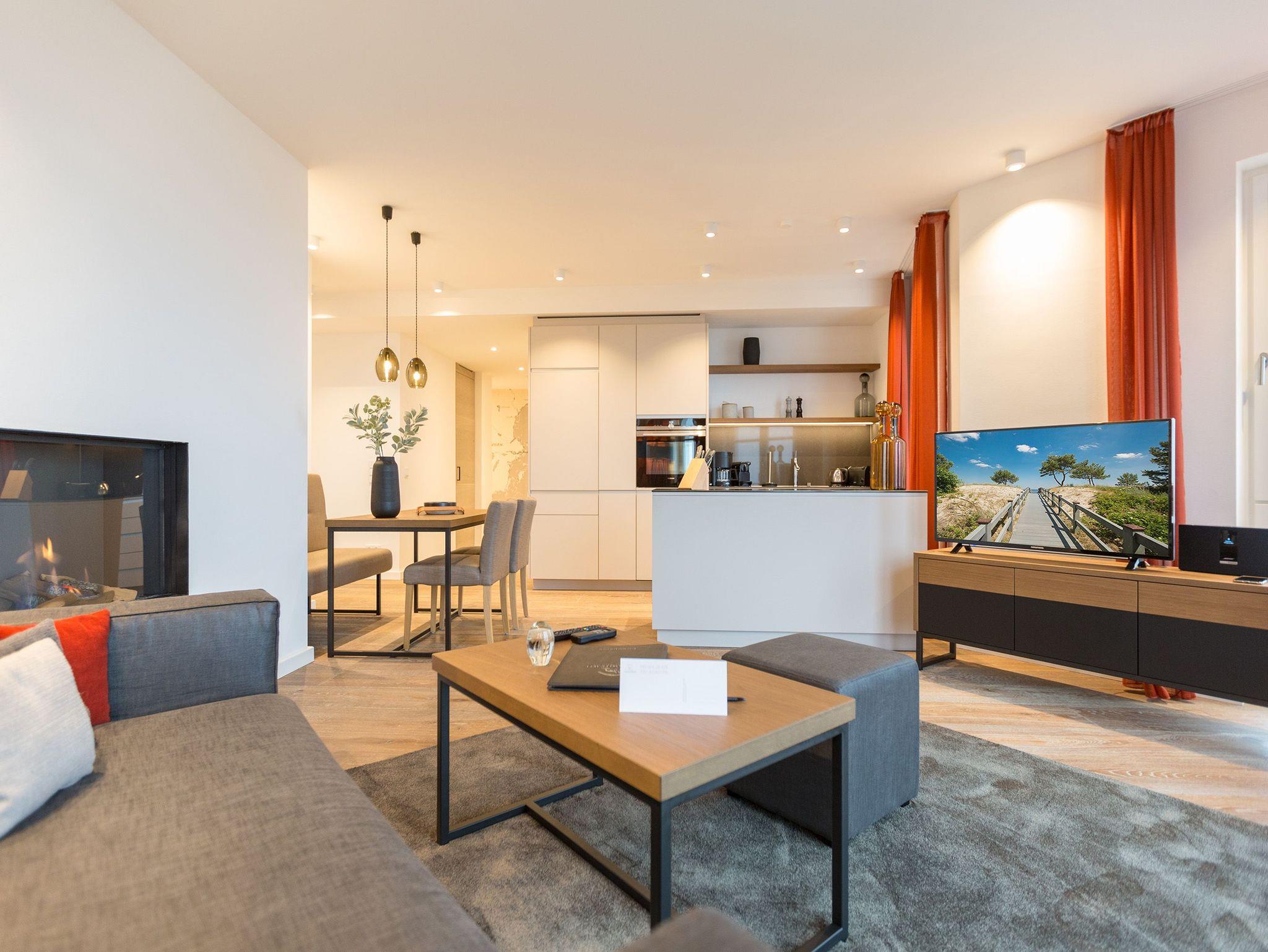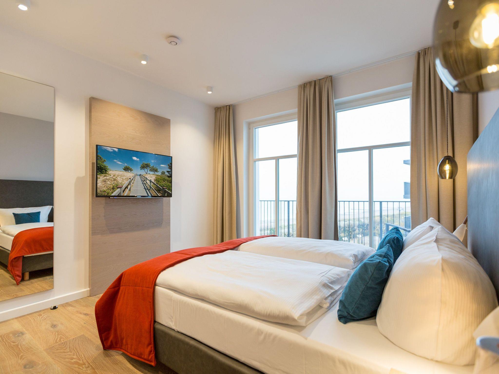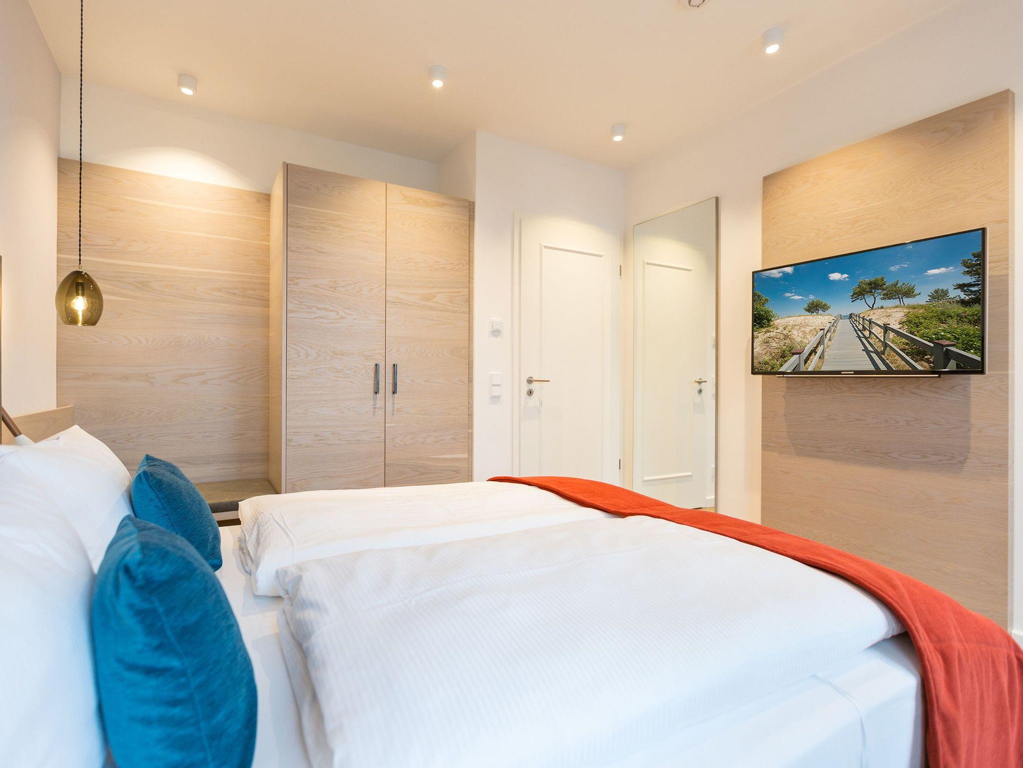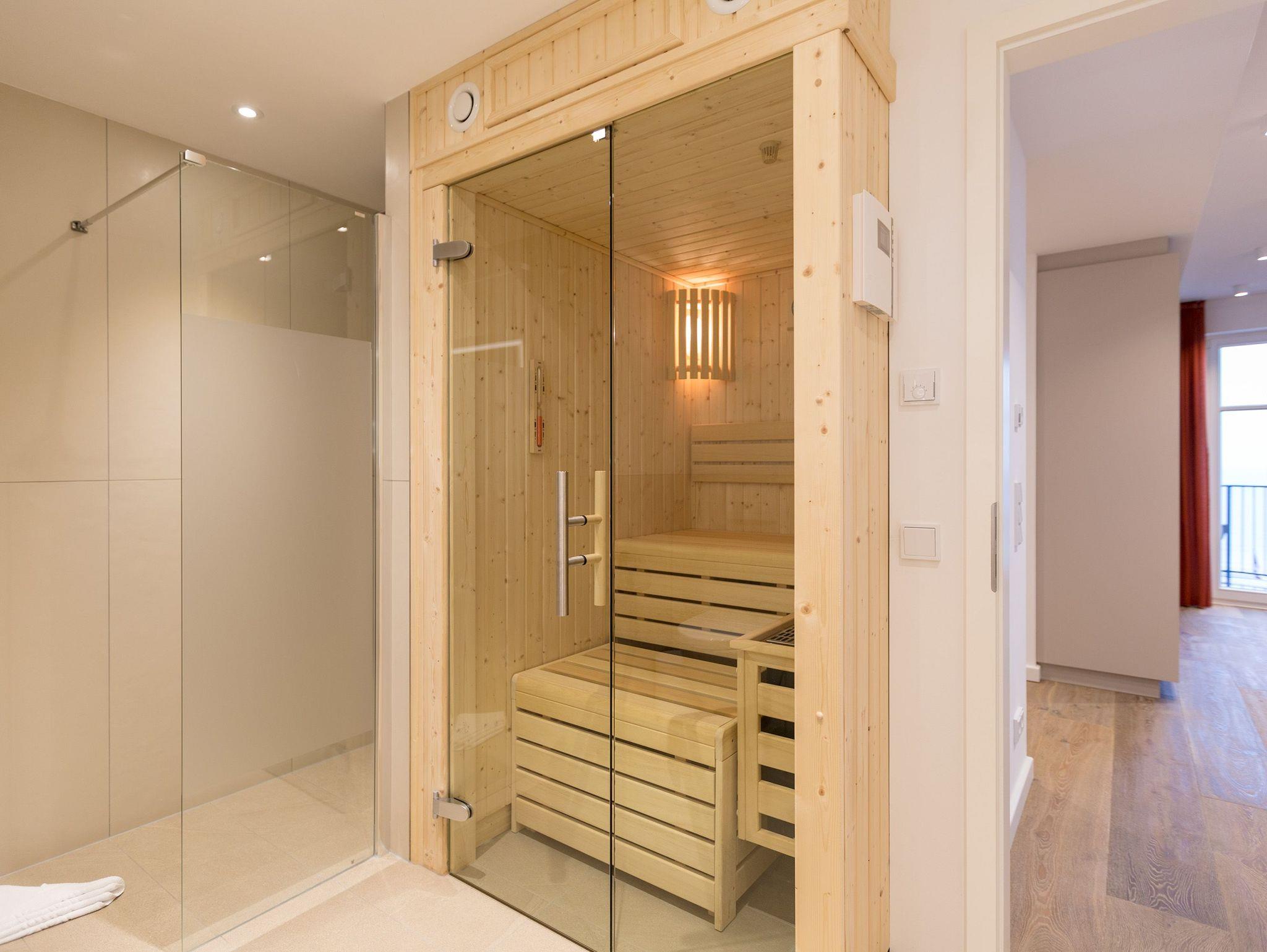 Von hier oben aus dem dritten Stock haben Sie das Meer voll im Blick. Im Panorama-Blick. Näher dran am Meeresrauschen geht nicht. Zum Wohlfühlen, Aufatmen, Auftanken sind die 74 Quadratmeter dieses Urlaubstraums ideal. Drei stilvoll und elegant eingerichtete Zimmer und modernes Interieur-Design erwarten Sie und bis zu drei Mitgenießer und ein Kleinkind bis drei Jahre (im Kinderreisebett). Das Wohnzimmer und zwei Balkone geben den Blick auf das grenzenlose Blau frei. Genießen Sie schon morgens, direkt nach dem Aufwachen die glitzernde Morgensonne auf den schaumgekrönten Wellen. Beide Schlafzimmer haben nicht nur wunderbar bequeme Boxspringdoppelbetten (einmal 1,80 m x 2,00 m [&] und einmal 1,60 m x 2,00 m), sie haben auch Zugang zu jeweils einem der beiden Balkone (6 und 8 Quadratmeter groß). So beginnt schon der erste Urlaubsmoment des Tages mit Ostseeweite. Ein helles und geräumiges Wohn-Ess-Zimmer lädt zum Relaxen auf der Couch, zum gemeinsamen Essen am wunderschönen Esstisch, zum Flammenspielschauen im Kamin oder zum gemeinsamen Kochen in der offenen Küche ein. Die hat es übrigens in sich. Die freie Kochinsel wird zum geselligen Urlaubszentrum. Hochwertige Markengeräte erleichtern das Kochen. Edles Geschirr macht das anschließende Essen zum wahren Genuss auch für die Augen. Ein großer Flat-TV und eine Bose-Hi-Fi-Anlage mit Bluetooth sorgen für die richtige Unterhaltung. Auch in den beiden Schlafzimmern gibt es jeweils einen Flat-TV. Das Appartement verfügt über zwei Bäder. Modernes Design zeichnet auch hier die Ausstattung aus. Eine große Regendusche macht das Duschen zum Highlight. Ein großer Waschtisch mit hinterleuchtetem Spiegel und ein WC gehören ebenfalls zur Einrichtung eines jeden Bades. Wahrer Wellness-Luxus wartet auf Sie im Masterbad: Eine Finnische Sauna hilft Ihnen an kühlen Tagen dabei, sich rundum kuschelig warm zu fühlen. Entspannung kommt in diesem Urlaubsdomizil dann ganz von allein. In einem kleinen Hauswirtschaftsraum steht ein Wasch-Trockner zu Ihrer Verfügung. Kommen Sie also an und lassen Sie sich einfach fallen. Die Betten sind bezogen und Handtücher liegen für Sie bereit. Das WLAN ist kostenfrei. Und in der Tiefgarage ist für Sie der Stellplatz Nr. 20 reserviert.
