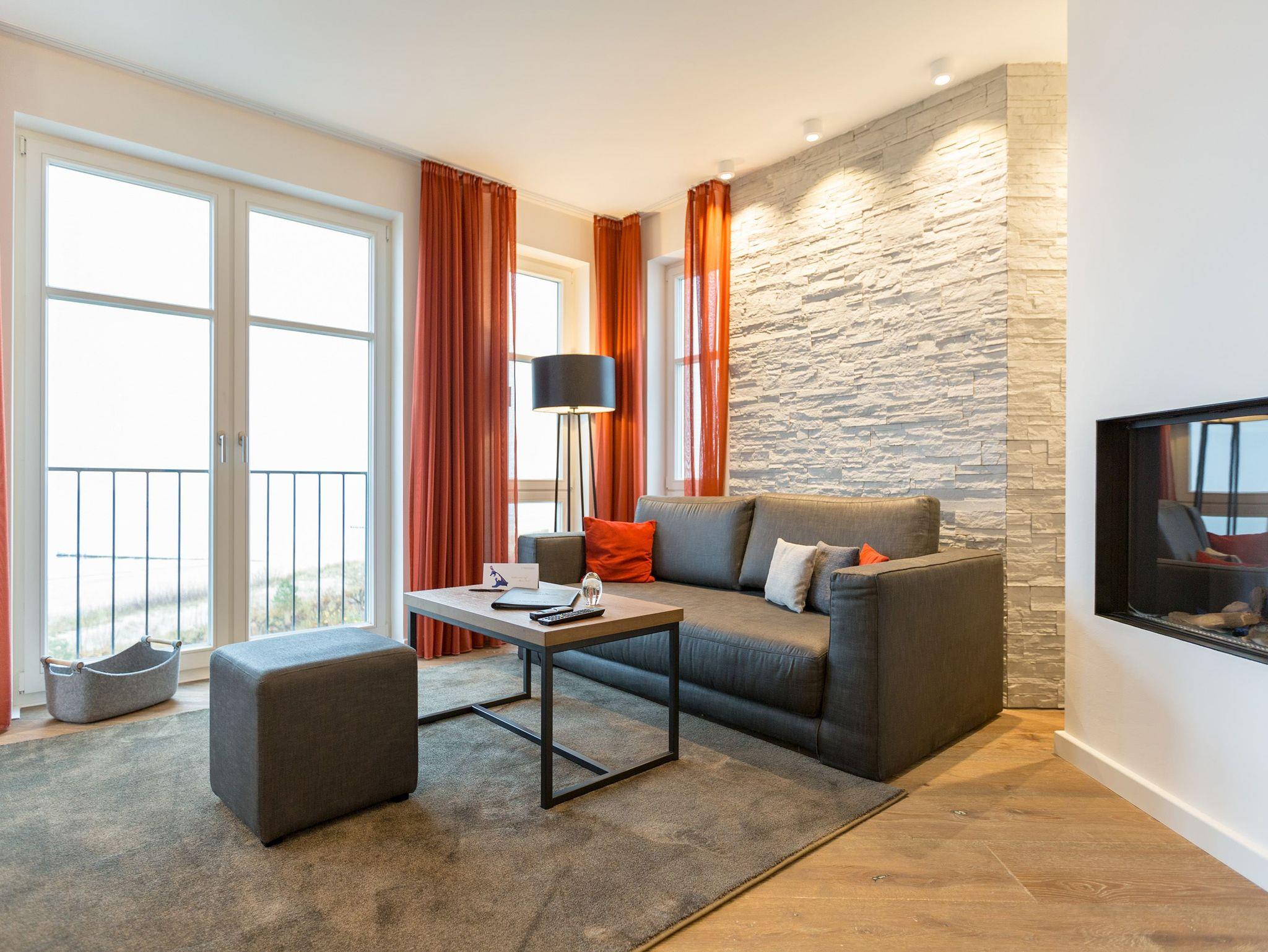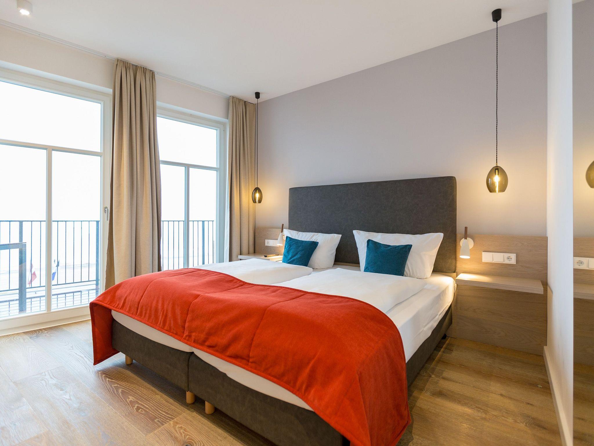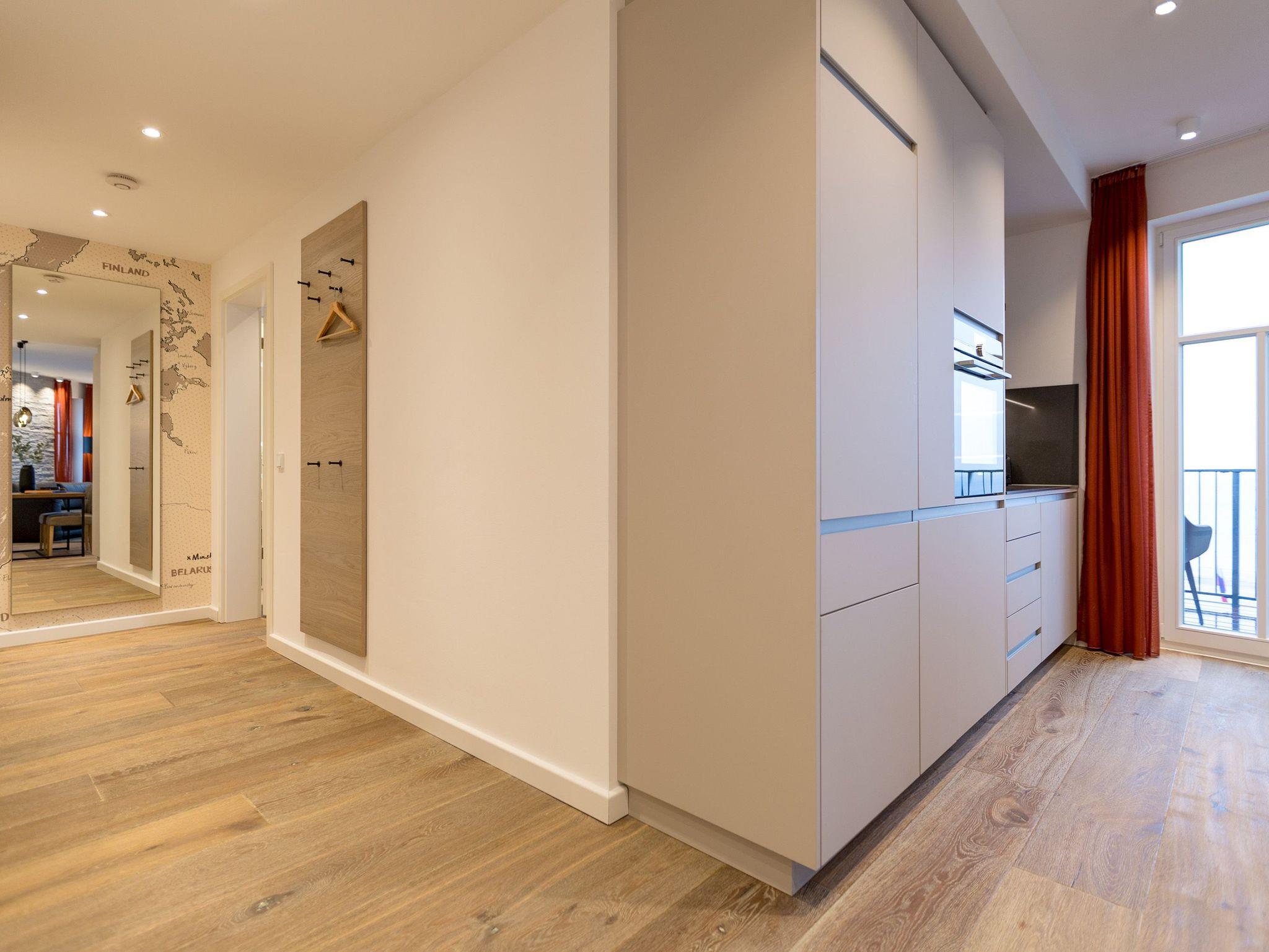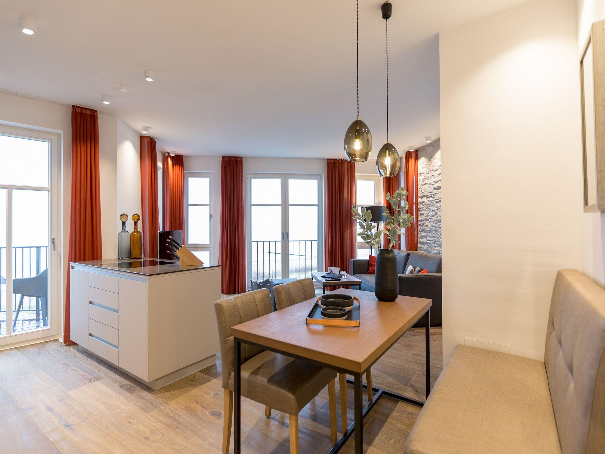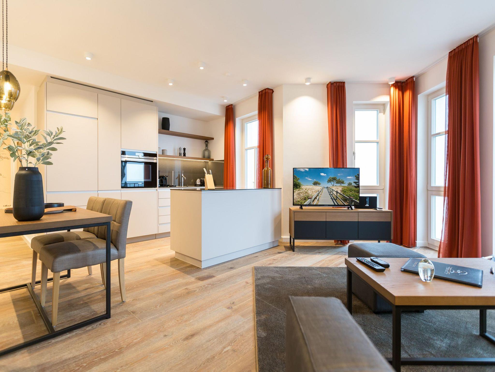 Von hier oben aus dem dritten Stock haben Sie das Meer voll im Blick. Im Panorama-Blick. Näher dran am Meeresrauschen geht nicht. Zum Wohlfühlen, Aufatmen, Auftanken sind die 74 Quadratmeter dieses Urlaubstraums ideal. Drei stilvoll und elegant eingerichtete Zimmer und modernes Interieur-Design erwarten Sie und bis zu drei Mitgenießer und ein Kleinkind bis drei Jahre (im Kinderreisebett). Das Wohnzimmer und zwei Balkone geben den Blick auf das grenzenlose Blau frei. Genießen Sie schon morgens, direkt nach dem Aufwachen die glitzernde Morgensonne auf den schaumgekrönten Wellen. Beide Schlafzimmer haben nicht nur wunderbar bequeme Boxspringdoppelbetten (einmal 1,80 m x 2,00 m [&] und einmal 1,60 m x 2,00 m), sie haben auch Zugang zu jeweils einem der beiden Balkone (6 und 8 Quadratmeter groß). So beginnt schon der erste Urlaubsmoment des Tages mit Ostseeweite. Ein helles und geräumiges Wohn-Ess-Zimmer lädt zum Relaxen auf der Couch, zum gemeinsamen Essen am wunderschönen Esstisch, zum Flammenspielschauen im Kamin oder zum gemeinsamen Kochen in der offenen Küche ein. Die hat es übrigens in sich. Die freie Kochinsel wird zum geselligen Urlaubszentrum. Hochwertige Markengeräte erleichtern das Kochen. Edles Geschirr macht das anschließende Essen zum wahren Genuss auch für die Augen. Ein großer Flat-TV und eine Bose-Hi-Fi-Anlage mit Bluetooth sorgen für die richtige Unterhaltung. Auch in den beiden Schlafzimmern gibt es jeweils einen Flat-TV. Das Appartement verfügt über zwei Bäder. Modernes Design zeichnet auch hier die Ausstattung aus. Eine große Regendusche macht das Duschen zum Highlight. Ein großer Waschtisch mit hinterleuchtetem Spiegel und ein WC gehören ebenfalls zur Einrichtung eines jeden Bades. Wahrer Wellness-Luxus wartet auf Sie im Masterbad: Eine Finnische Sauna hilft Ihnen an kühlen Tagen dabei, sich rundum kuschelig warm zu fühlen. Entspannung kommt in diesem Urlaubsdomizil dann ganz von allein. In einem kleinen Hauswirtschaftsraum steht ein Wasch-Trockner zu Ihrer Verfügung. Kommen Sie also an und lassen Sie sich einfach fallen. Die Betten sind bezogen und Handtücher liegen für Sie bereit. Das WLAN ist kostenfrei. Und in der Tiefgarage ist für Sie der Stellplatz Nr. 20 reserviert.