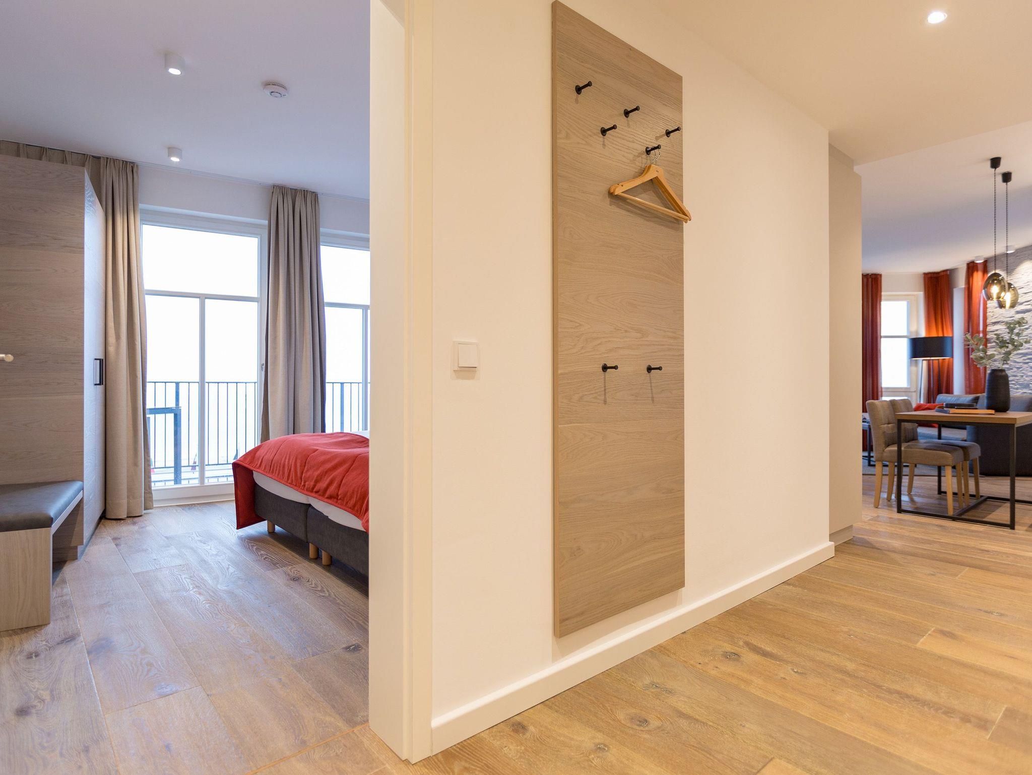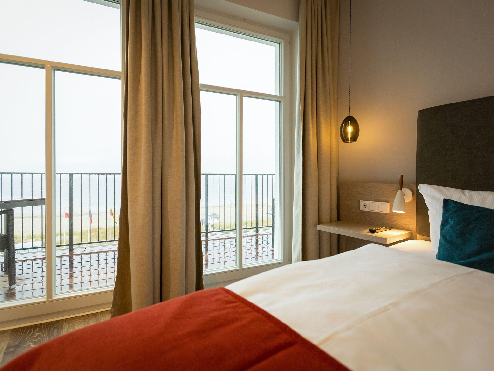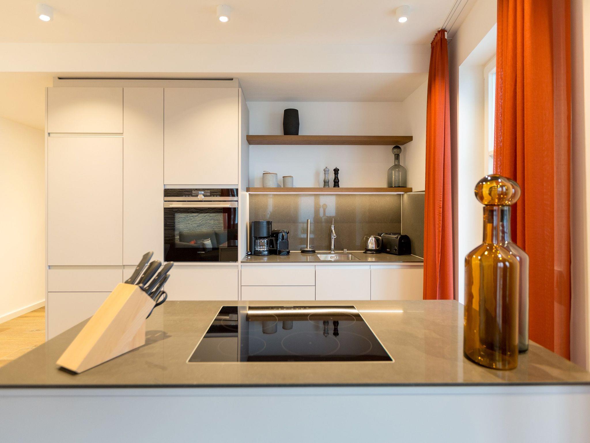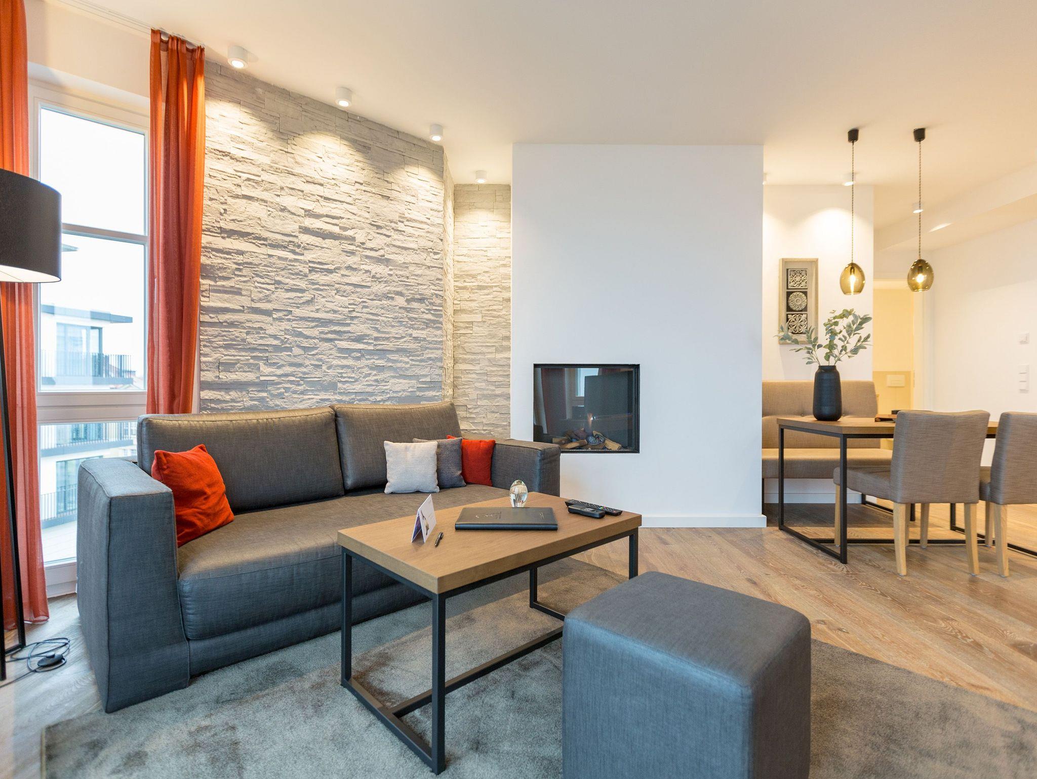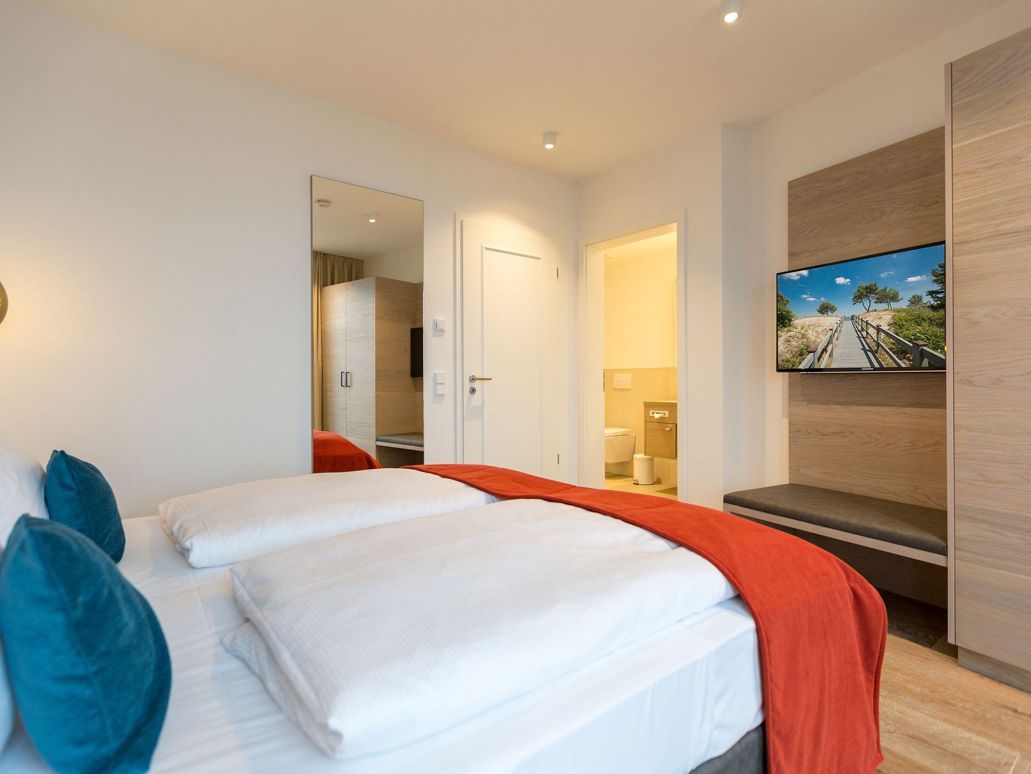 Von hier oben aus dem dritten Stock haben Sie das Meer voll im Blick. Im Panorama-Blick. Näher dran am Meeresrauschen geht nicht. Zum Wohlfühlen, Aufatmen, Auftanken sind die 74 Quadratmeter dieses Urlaubstraums ideal. Drei stilvoll und elegant eingerichtete Zimmer und modernes Interieur-Design erwarten Sie und bis zu drei Mitgenießer und ein Kleinkind bis drei Jahre (im Kinderreisebett). Das Wohnzimmer und zwei Balkone geben den Blick auf das grenzenlose Blau frei. Genießen Sie schon morgens, direkt nach dem Aufwachen die glitzernde Morgensonne auf den schaumgekrönten Wellen. Beide Schlafzimmer haben nicht nur wunderbar bequeme Boxspringdoppelbetten (einmal 1,80 m x 2,00 m [&] und einmal 1,60 m x 2,00 m), sie haben auch Zugang zu jeweils einem der beiden Balkone (6 und 8 Quadratmeter groß). So beginnt schon der erste Urlaubsmoment des Tages mit Ostseeweite. Ein helles und geräumiges Wohn-Ess-Zimmer lädt zum Relaxen auf der Couch, zum gemeinsamen Essen am wunderschönen Esstisch, zum Flammenspielschauen im Kamin oder zum gemeinsamen Kochen in der offenen Küche ein. Die hat es übrigens in sich. Die freie Kochinsel wird zum geselligen Urlaubszentrum. Hochwertige Markengeräte erleichtern das Kochen. Edles Geschirr macht das anschließende Essen zum wahren Genuss auch für die Augen. Ein großer Flat-TV und eine Bose-Hi-Fi-Anlage mit Bluetooth sorgen für die richtige Unterhaltung. Auch in den beiden Schlafzimmern gibt es jeweils einen Flat-TV. Das Appartement verfügt über zwei Bäder. Modernes Design zeichnet auch hier die Ausstattung aus. Eine große Regendusche macht das Duschen zum Highlight. Ein großer Waschtisch mit hinterleuchtetem Spiegel und ein WC gehören ebenfalls zur Einrichtung eines jeden Bades. Wahrer Wellness-Luxus wartet auf Sie im Masterbad: Eine Finnische Sauna hilft Ihnen an kühlen Tagen dabei, sich rundum kuschelig warm zu fühlen. Entspannung kommt in diesem Urlaubsdomizil dann ganz von allein. In einem kleinen Hauswirtschaftsraum steht ein Wasch-Trockner zu Ihrer Verfügung. Kommen Sie also an und lassen Sie sich einfach fallen. Die Betten sind bezogen und Handtücher liegen für Sie bereit. Das WLAN ist kostenfrei. Und in der Tiefgarage ist für Sie der Stellplatz Nr. 20 reserviert.