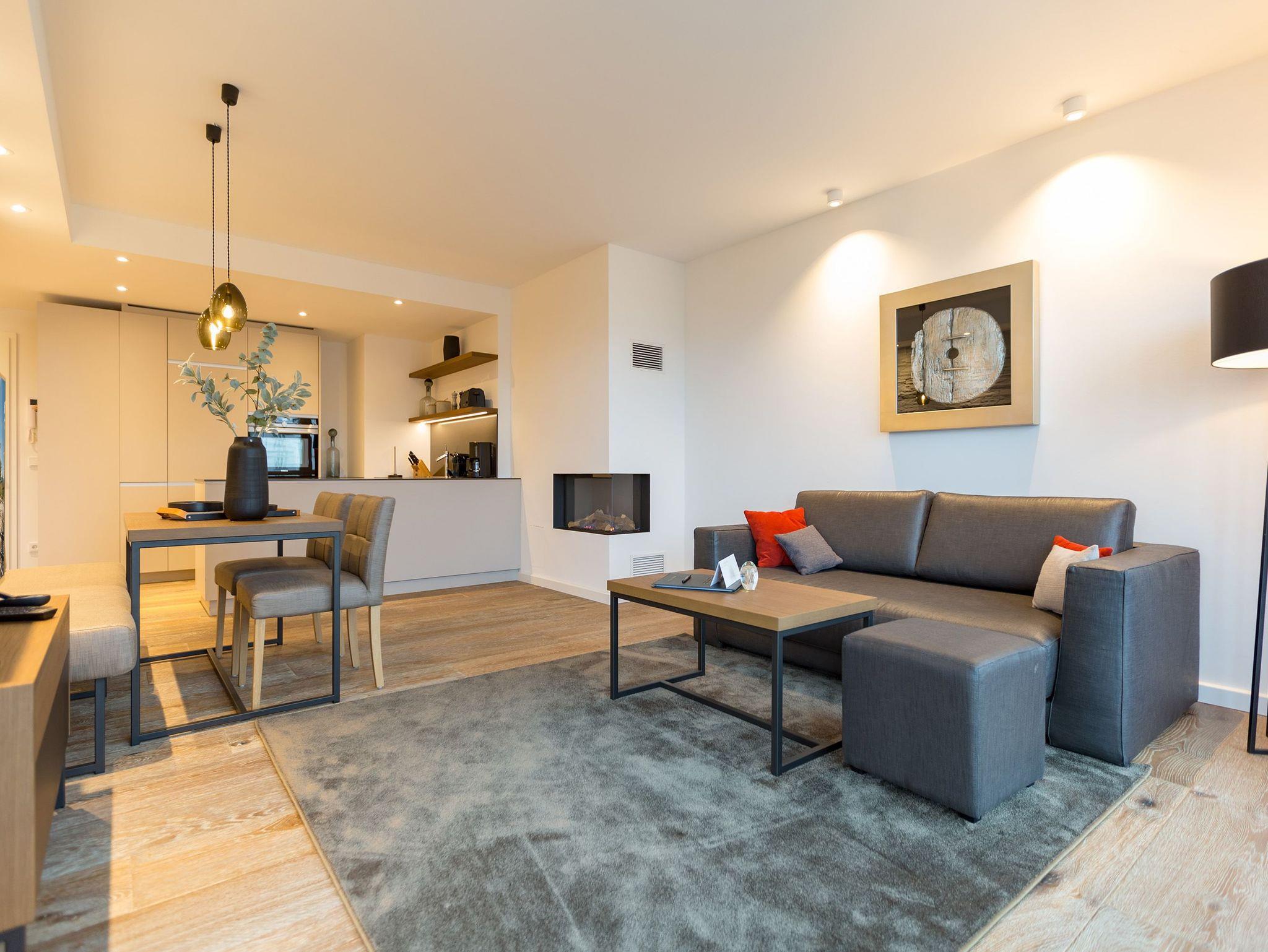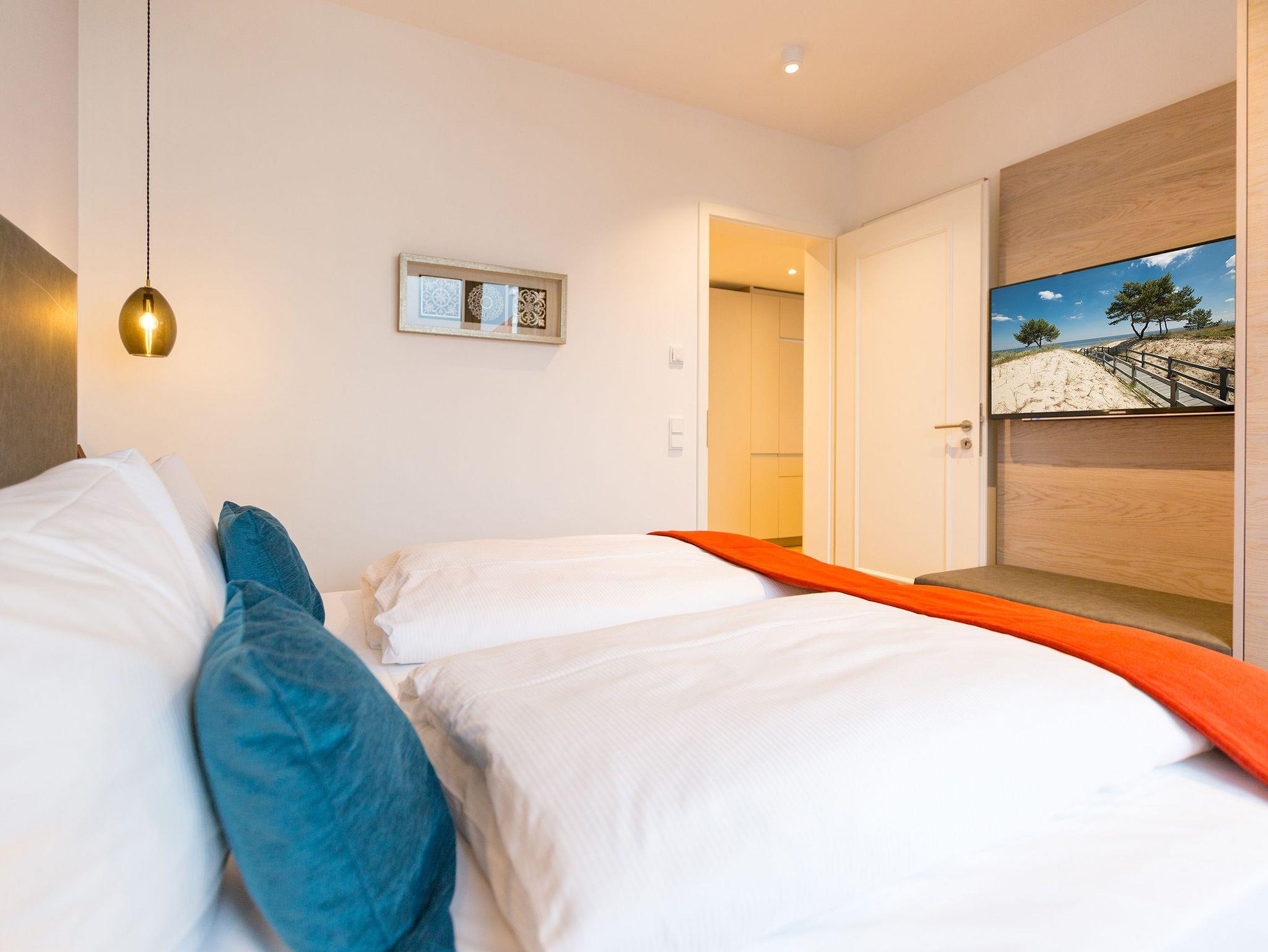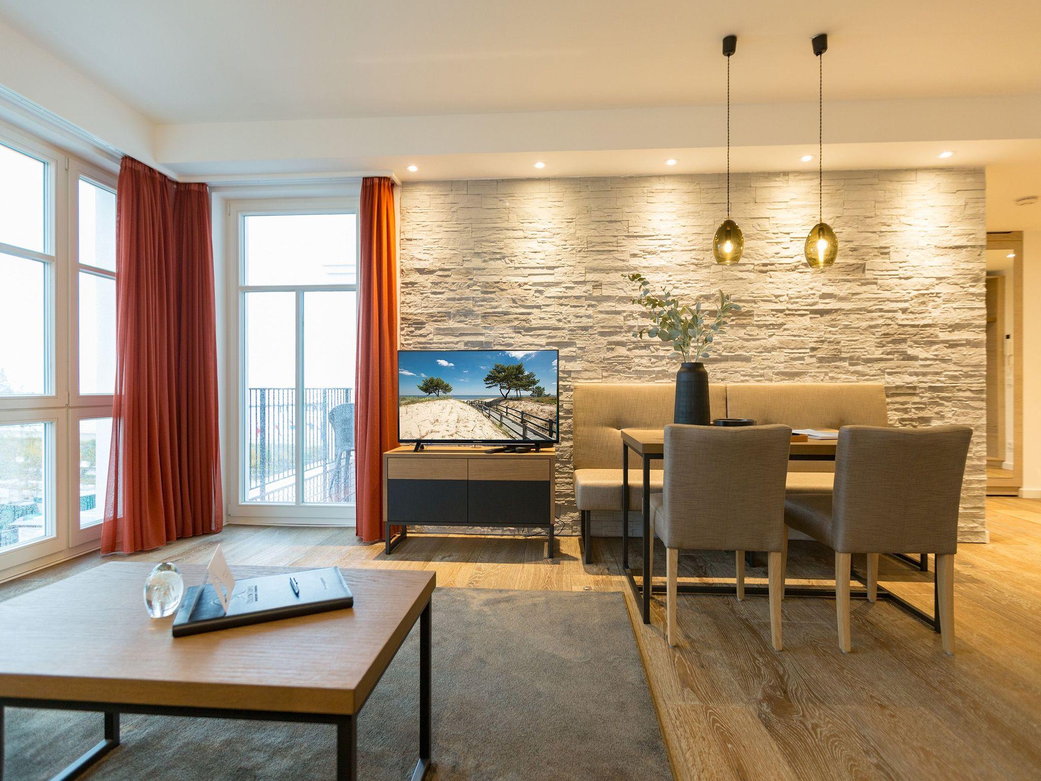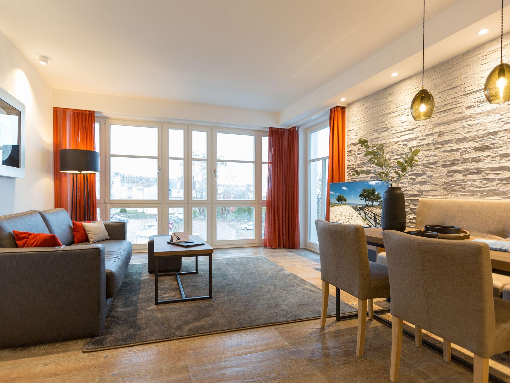 Mit seinen 51 Quadratmetern ist dieses Zwei-Raum-Appartement in der 3. Etage ein ideales Urlaubsdomizil für zwei Personen und ein Kleinkind bis drei Jahre (im Kinderreisebett). In diesem kuscheligen und eleganten Ostseeparadies können Sie neue Energie tanken und haben das Meer dabei immer im Blick. Sowohl vom Schlaf- als auch vom Wohnzimmer aus, können Sie auf den Balkon (6 Quadratmeter) hinaustreten und die Nase direkt in die frische Meeresbrise halten. Frühstücken Sie unter freiem Himmel oder am schönen Esstisch im Wohn-Esszimmer. Das kleine Wohlfühlreich, das dennoch sehr geräumig und großzügig geschnitten ist, lädt geradezu dazu ein, es sich gut gehen zu lassen. Viel Licht fällt durch die bodentiefen Fenster. Lifestyle durchzieht jeden Winkel. Die Liebe steckt im Detail. Auf der Couch entspannen, die Flammen des Kamins mit der Fernbedienung regeln, spannende Filme auf dem Flat-TV schauen und vieles mehr ist hier möglich. Die Bose Hi-Fi-Anlage hat eine Bluetooth-Funktion. Das WLAN ist kostenfrei. Was will man mehr. In der offenen Wohnküche finden Sie alles für die Zubereitung leckerer Gerichte Notwendige. Sämtliche Geräte wie Geschirrspüler, Herd oder Kaffeemaschine sind hochwertige Markengeräte. Edles Geschirr ist ebenfalls vorhanden. Im Badezimmer befindet sich ein weiteres Highlight dieser Wohnung: Eine Finnische Sauna. Neben der Regendusche, einem großen Waschtisch und dem WC gehört diese kleine Wellness-Oase zu Ihrem Komplettpaket dazu. Schmuddelwetter? Na und! Und hinterher so richtig schön ins bequeme Boxspringdoppelbett (1,80 m x 2,00 m) einkuscheln. Herrlich! Fernsehen können Sie dank des Flat-TVs im Schlafzimmer auch vom Bett aus. Im geräumigen Schrank haben Sie viel Platz für die Urlaubsgarderobe. Rundum sorglos können Sie auch sein, weil das Bett bei Anreise bereits bezogen ist und Handtücher bereit liegen. In einem kleinen Hauswirtschaftsraum steht ein Waschtrockner. Der Stellplatz Nr. 26 in der Tiefgarage ist der Ihre.