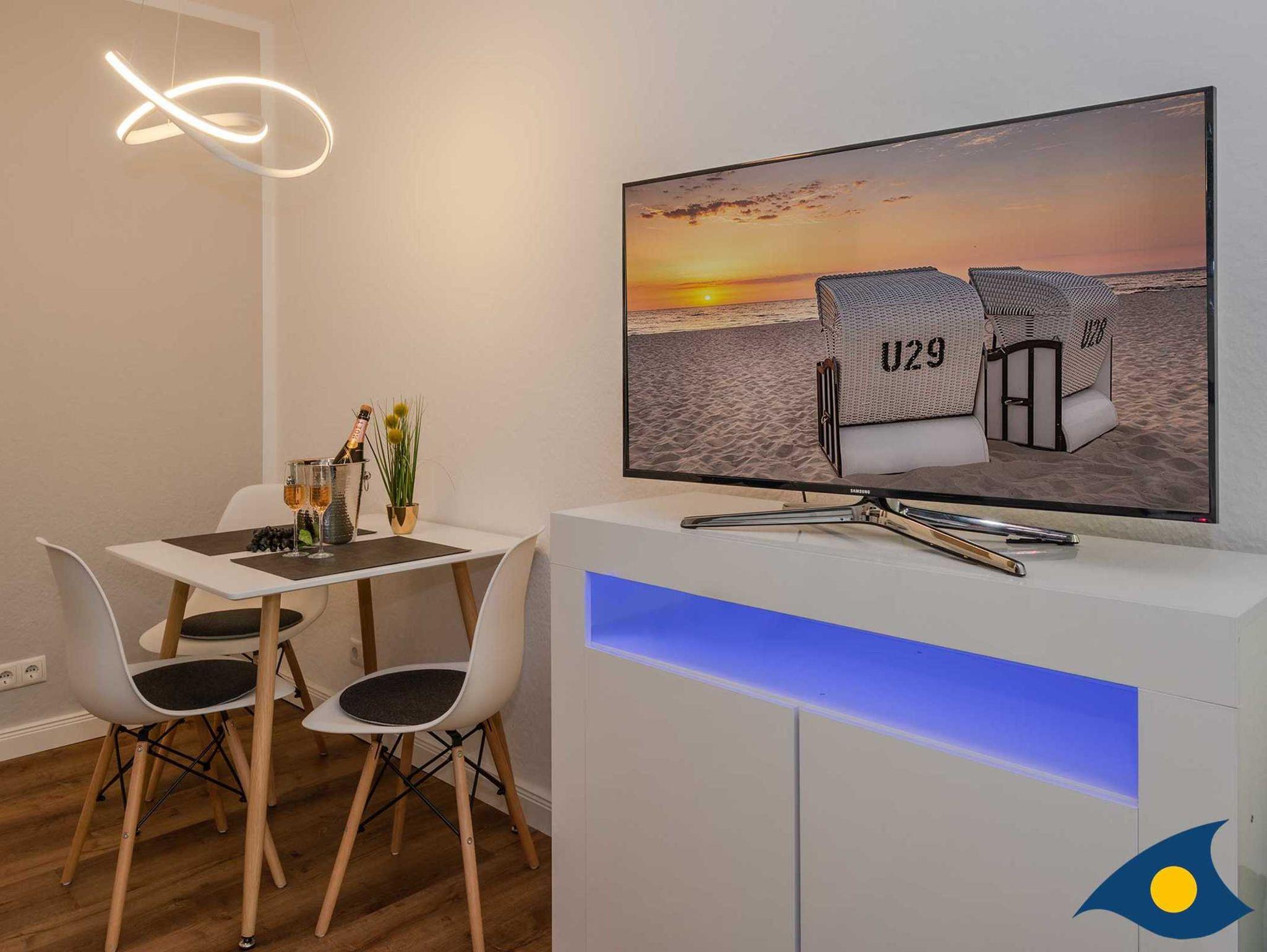 Sommerliche Farben bestimmen die wohnliche und geschmackvolle Einrichtung. Der Wohnschlafraum verfügt über eine gut ausgestattete Küchenzeile, einen Essbereich, eine Sat-TV/DVD/Stereoanlage, ein großes Doppelbett. Wohnraum und Diele bieten viel Stauraum für die persönlichen Sachen. Der Wohnbereich ist mit allergikerfreundlichem Laminatboden ausgelegt. Das Bad bietet Dusche, WC, Fön und Ablagemöglichkeiten.