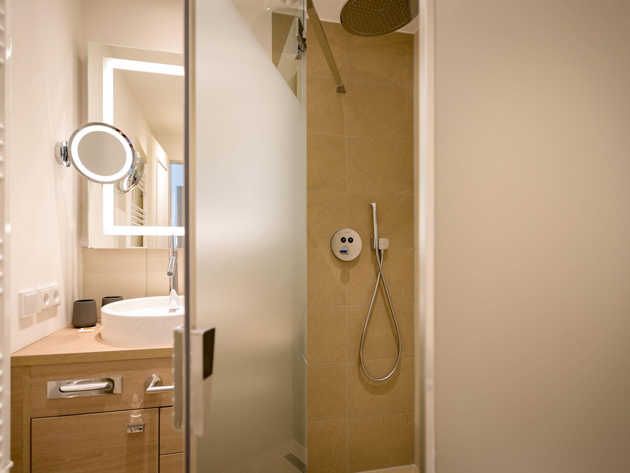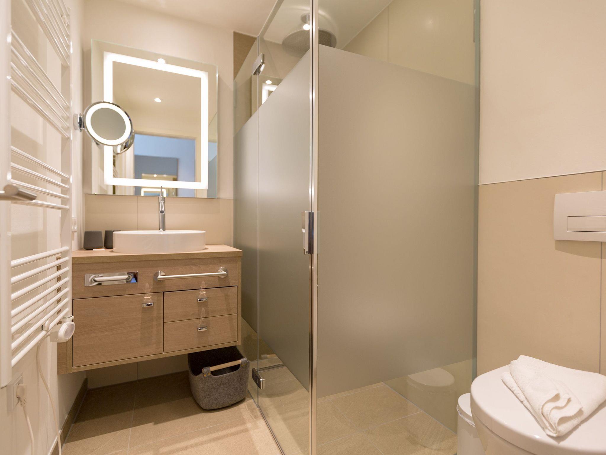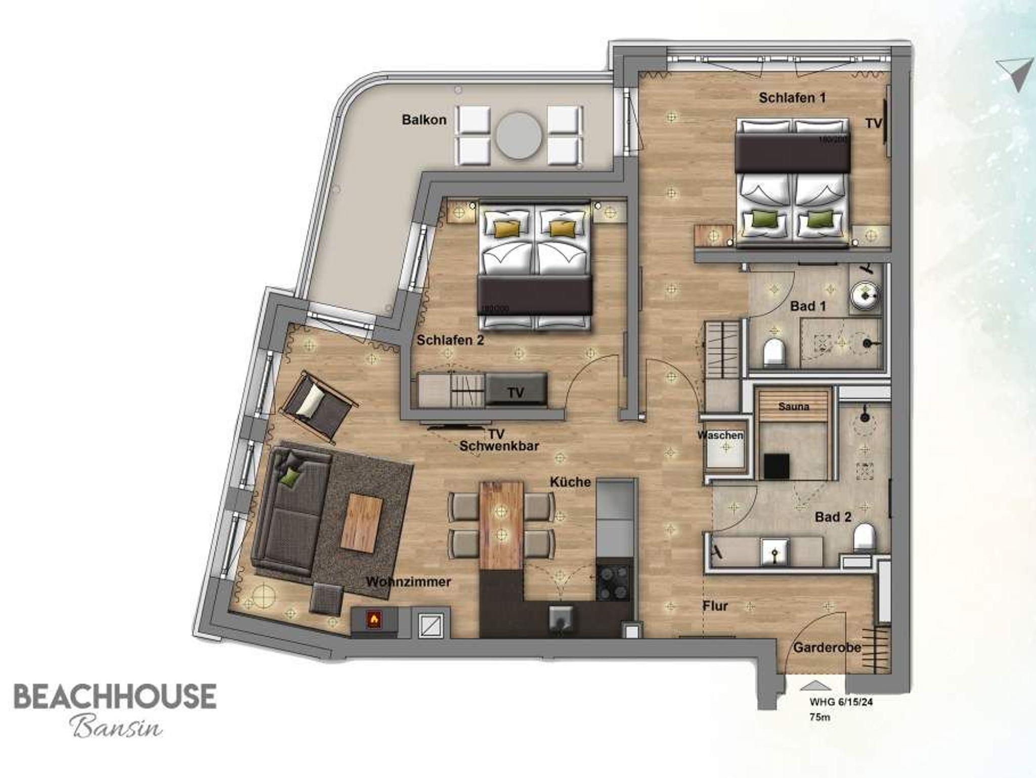 Die großen Fenster lassen viel Licht in dieses exklusive und elegant eingerichtete Feriendomizil der Extra-Klasse im 1. Obergeschoss des modernen Beachhouse direkt an der Bansiner Promenade. Auf 68 Quadratmetern finden Sie in den drei Zimmern und zwei Bädern alles, was Sie sich für einen erholsamen Urlaub zu viert plus Kind (bis drei Jahre im Kindereisebett) und geliebtem Vierbeiner nur wünschen können. Viel Platz zum Durchatmen und Ausspannen haben Sie im wunderschönen und stylischen Wohn-Ess-Zimmer. Hier stimmt einfach alles. Und alles ist aufeinander abgestimmt. Denn das Auge erlaubt schließlich mit. Farben und Möbel bilden in diesem kleinen Paradies auf Zeit eine harmonische Einheit. Nordische Schlichtheit und hochwertige Natur-Materialien und Möbel sorgen für viel Lagom das schwedische Wort für Balance und Ausgewogenheit. Ein Gas-Kamin ist an ungemütlichen Tagen ein echtes Wohlfühl-Highlight. Beobachten Sie das Flammenspiel vom bequemen Sofa aus. Oder lassen Sie sich vom Flat-TV unterhalten. Zur High-End-Ausstattung gehört auch eine Hi-Fi-Anlage mit Bluetooth-Funktion. Das WLAN ist kostenfrei. In der vollausgestatteten und offenen Küche finden Sie alles für extravagante Kochsessions. Der schöne Esstisch bietet den passenden Rahmen zum Dinieren. Doch was wünscht sich der ostseehungrige Auszeitler am meisten? Das Meer im Blick und in den Ohren. Vom Balkon aus können Sie Ihre Sehnsucht nach dem endlos weiten Blau stillen. Sehen Sie sich ruhig satt an der Ostsee, die von hier aus zum Greifen nah scheint. Schließlich ist sie auch nur ein paar Meter vom Beachhouse entfernt. Auf den kleinen Balkon (9 Quadratmeter) mit Süd-West-Ausrichtung führen alle drei Zimmer hinaus. Genießen Sie auf den gemütlichen Gartenstühlen bei einem erfrischenden Getränk den Sonnenuntergang. Und tauchen des Nachts ein in entspannende Träume. Denn die bequemen Boxspringdoppelbetten (1,80 m x 2,00 m) in jedem Schlafzimmer warten nur darauf, Sie damit zu verwöhnen. Jedes Schlafzimmer hat zudem einen geräumigen Schrank und einen eigenen Flat-TV. Die zwei Bäder sind zwei Wellness-Oasen für sich. Unter den Regenduschen wird der wohlig warme Schauer zum Vergnügen. Großzügige Waschtische mit beleuchteten Spiegeln bieten viel Platz zum Frischmachen oder Stylen. Ein weiteres Highlight dieses Appartements ist die Finnische Sauna im Masterbad. Hier können Sie getrost die Alltagssorgen ausschwitzen. Handtücher liegen bei Anreise für Sie bereit und die Betten sind bezogen. In einem kleinen Hauswirtschaftsraum befindet sich ein Wasch-Trockner. In der modernen Tiefgarage ist für Sie der Stellplatz Nr. 6 im Doppelparker oben (max. Höhe 2,00 m, max. Länge 5,10 m, max. Breite 2,50 m, max. Last 2.600 kg) reserviert.
