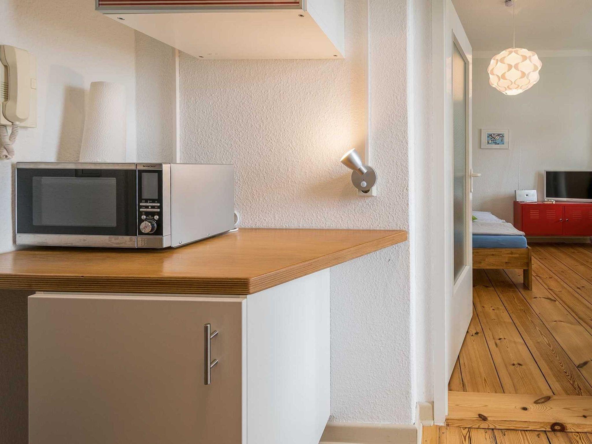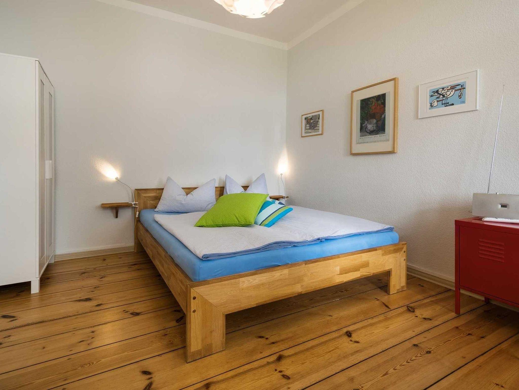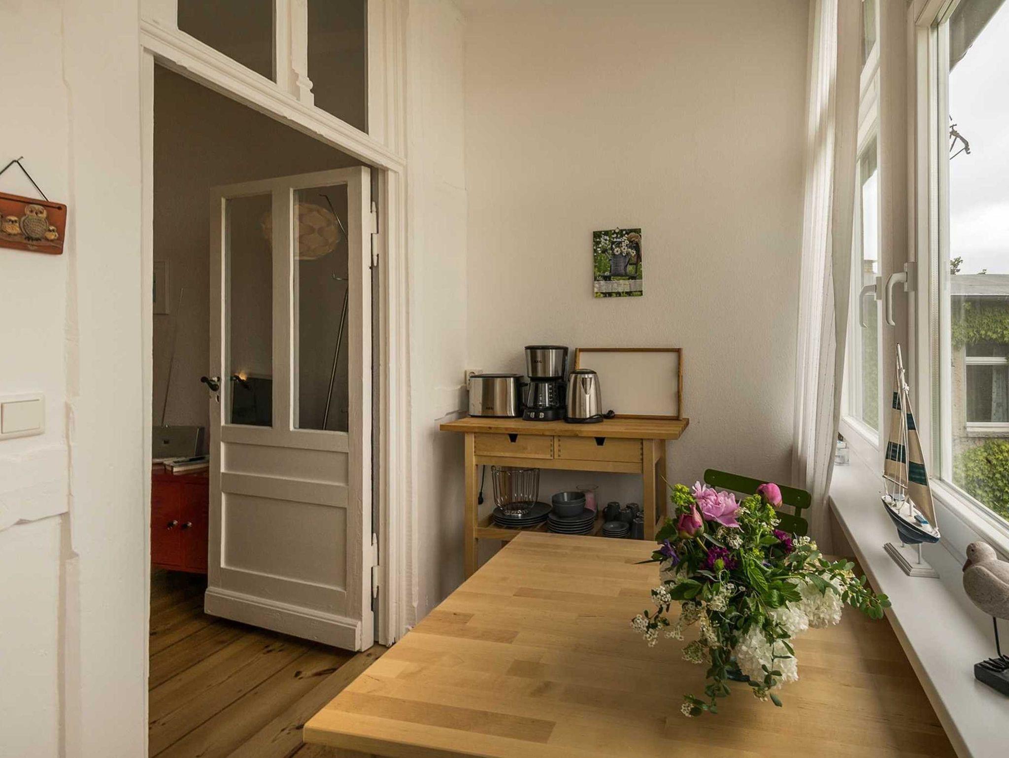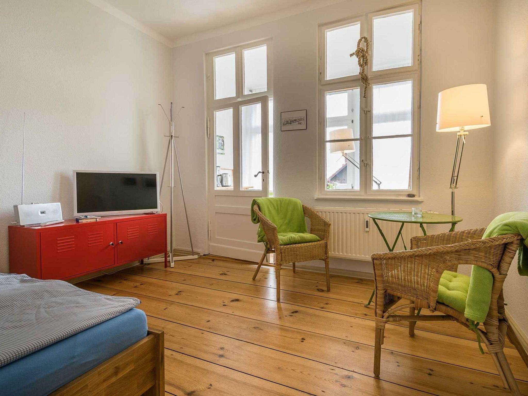Diese charmante 30 m² große Unterkunft im 1. Obergeschoss bietet Ihnen einen gemütlichen Wohn-/Schlafraum sowie eine geschlossene Veranda, die ideal für entspannte Stunden ist. Hier finden bis zu 2 Personen den perfekten Ort für einen erholsamen Urlaub. Der hochwertige Dielenboden sorgt für ein angenehmes Raumklima. Die geschmackvolle Ausstattung umfasst eine kleine Pantry-Küche, die mit einem E-Herd mit 2 Platten, Kühlschrank, Kaffeemaschine, Toaster, Wasserkocher und Mikrowelle ausgestattet ist - alles, was Sie für ein köstliches Frühstück oder eine kleine Mahlzeit benötigen. Genießen Sie den Blick ins Grüne von der Veranda, die einladend für Ihr Frühstück ist. Im Wohnraum erwarten Sie ein komfortables Doppelbett, ein Kleiderschrank sowie zwei gemütliche Rattan-Sessel und ein TV für entspannte Abende. Das Tageslicht-Bad ist mit einer Dusche und WC ausgestattet. Die Erstausstattung mit Bettwäsche und Handtüchern ist bereits im Preis enthalten. Für Ihren Pkw steht Ihnen ein Parkplatz direkt am Haus zur Verfügung und selbstverständlich können Sie auch das kostenfreies WLAN nutzen. Ein Schuppen zum Einschließen der Fahrräder steht Ihnen ebenfalls gern zur Verfügung. Bitte beachten Sie, dass es leider keine Grillmöglichkeit gibt.
